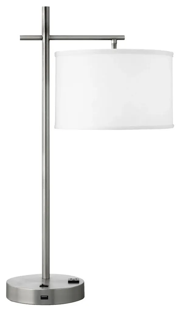 Standard Lamp Specifications for #UW806:Product Type: Single Nightstand LampHeight: 26"Finish: Brushed SteelConstruction: SteelSocket: (1) Aluminum On/Off Med. Base Type A 100W Max socket(s). (Bulb not included)Switching: (1) On/Off Rocker switch(es) located on the base.Cord: 6''5'' (from base) long black 16 gauge cord set with a 3 prong grounded plug.Electrical Outlet: (1) 3 prong grounded outlet(s).Data Port: None.USB Port: (1) 10W/2A USB port(s).UL/CUL and/or ETL listed: YesStandard Packing: 2 per carton (shade packed separately).Lamps & Shades per SKU: 1Lamping: (1) Aluminum On/Off Med. Base Type A 100W Max socket(s).Shade Size and Description: White fabric laminated to styrene hardback drum with self fold trim measuring 10" x 10" x 7.5" w/ .5" drop (Top x Bottom x Slant).Bulb Included: NoMaterial Description: constructed from polished, plated, and lacquered steel.