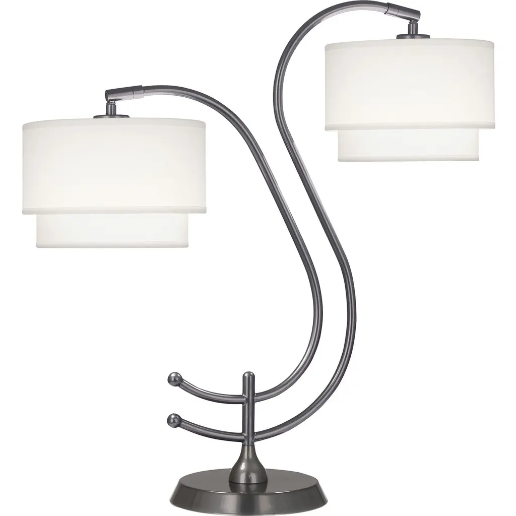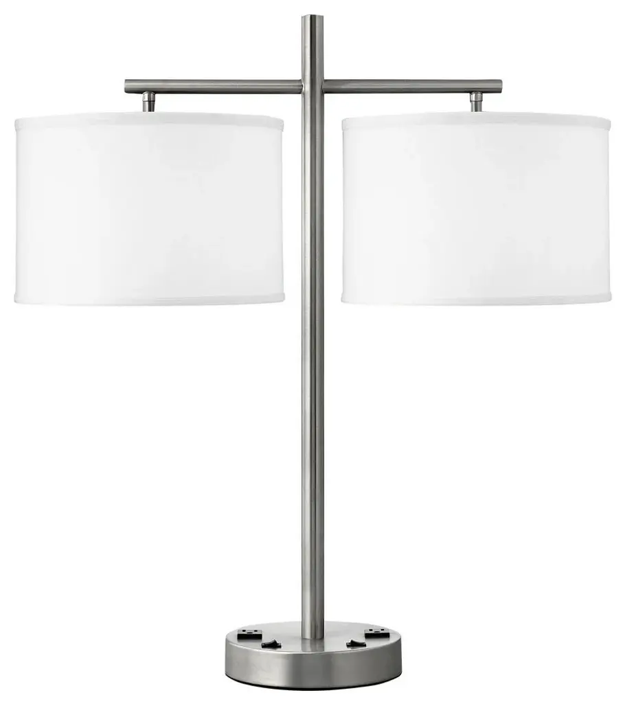 Standard Lamp Specifications for #UWL2806:Product Type: Twin-light Double Nightstand LampHeight: 26"Finish: Brushed SteelConstruction: SteelSocket: (2) Aluminum On/Off Med. Base Type A 100W Max socket(s). (Bulb not included)Switching: (2) On/Off Rocker switch(es) located on the base.Cord: 6''5'' (from base) long black 16 gauge cord set with a 3 prong grounded plug.Electrical Outlet: (2) 3 prong grounded outlet(s).Data Port: None.USB Port: (1) 10W/2A USB port(s).UL/CUL and/or ETL listed: YesStandard Packing: 2 per carton (shade packed separately).Lamps & Shades per SKU: 1Lamping: (2) Aluminum On/Off Med. Base Type A 100W Max socket(s).Shade Size and Description: White fabric laminated to styrene hardback drum with self fold trim measuring 10" x 10" x 7.5" w/ .5" drop (Top x Bottom x Slant).Bulb Included: NoMaterial Description: constructed from polished, plated, and lacquered steel.