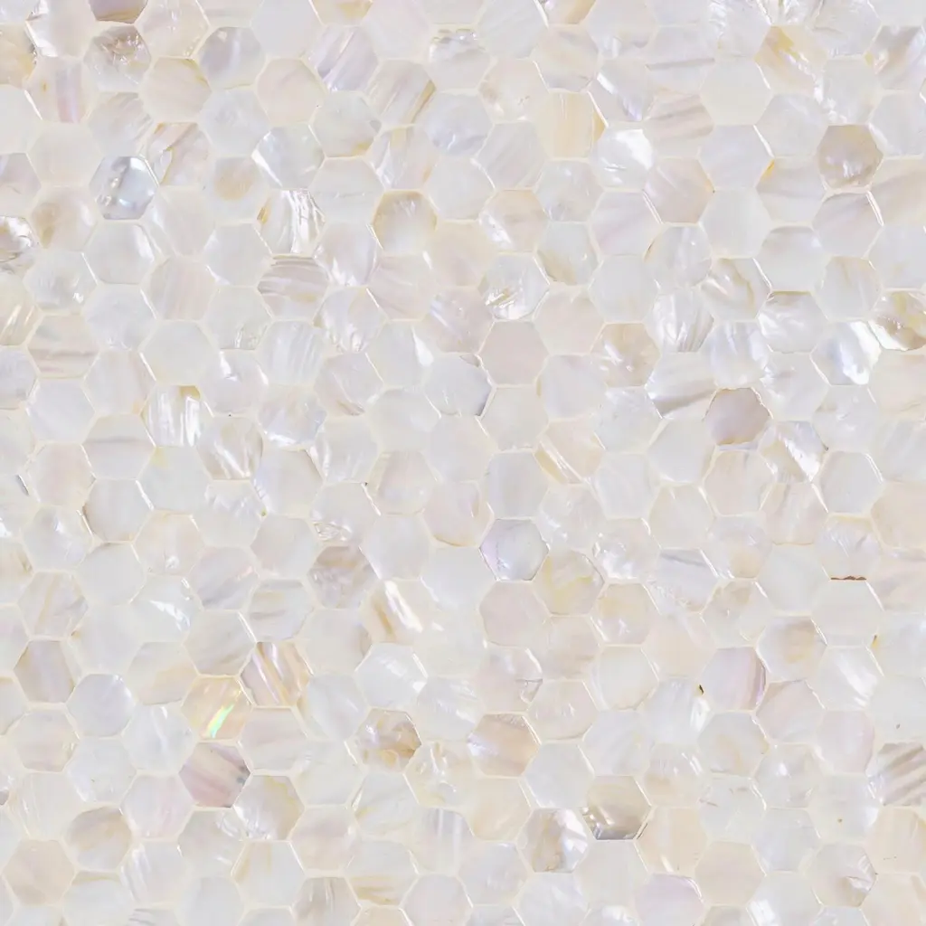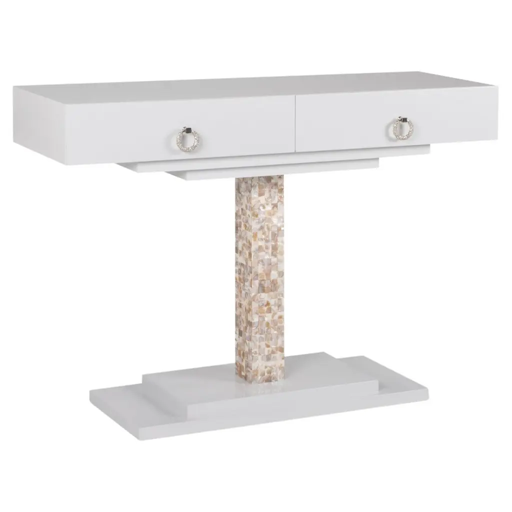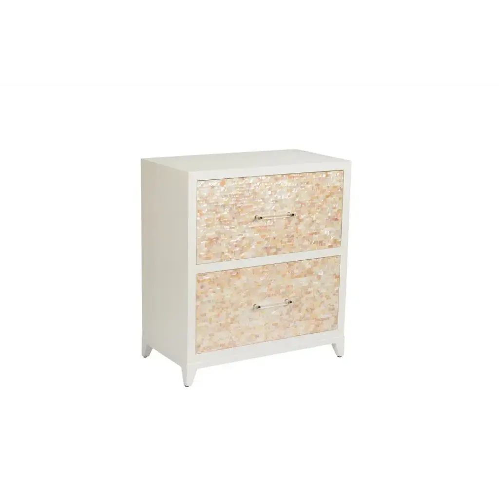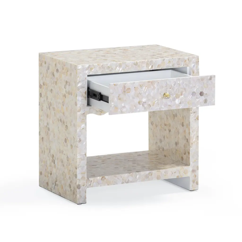 The Piara Nightstand is wrapped in hand-laid mother of pearl, its surface catching light with an opalescent glow that feels both airy and rich. Detailed with a scalloped edge and a smooth-glide drawer, this artisanal piece blends natural shell shimmer with soft, sculptural lines.