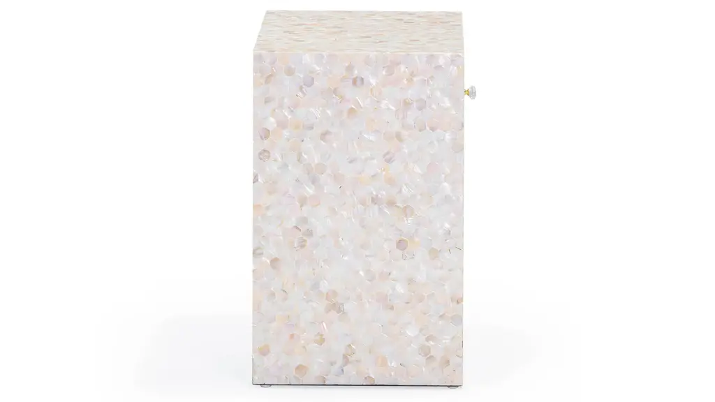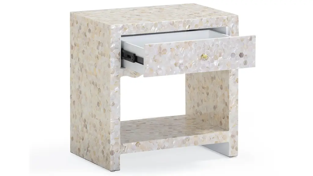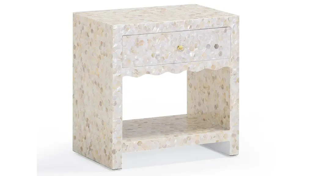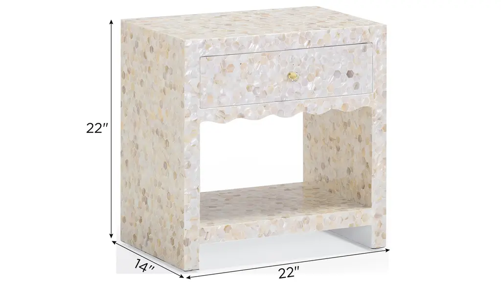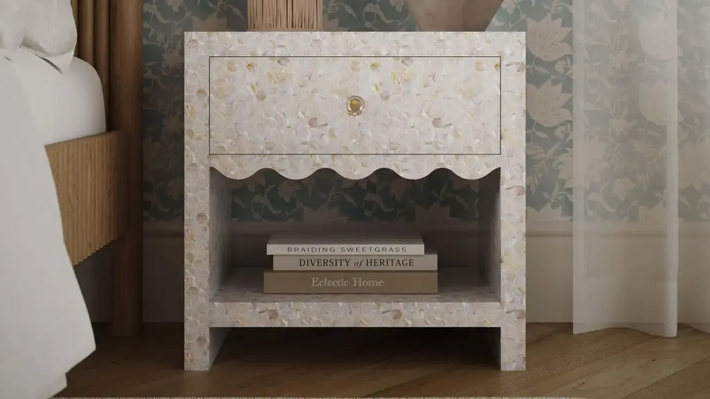 The Piara Mother of Pearl Inlaid Nightstand is wrapped in hand-laid mother of pearl, its surface catching light with an opalescent glow that feels both airy and rich. Detailed with a scalloped edge and a smooth-glide drawer, this artisanal piece blends natural shell shimmer with soft, sculptural lines.