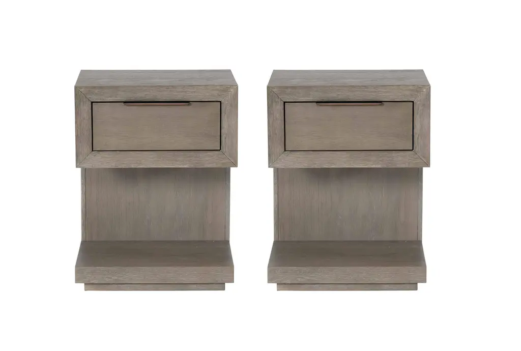 The Pierce Natural II Tall Wood Nightstand set offers a perfect blend of functionality and contemporary style for your bedroom. Featuring a natural grey finish, these nightstands are made from oak veneer and solid rubberwood, ensuring durability and a timeless look. The set includes one 1-drawer nightstand and one 3-drawer nightstand, both equipped with USB and power outlets for added convenience.