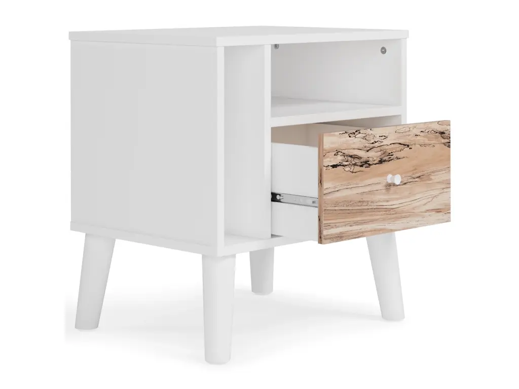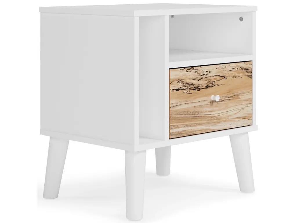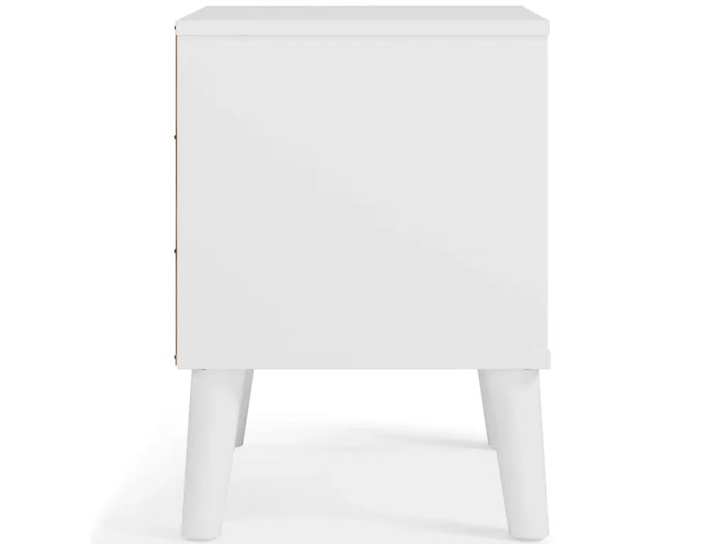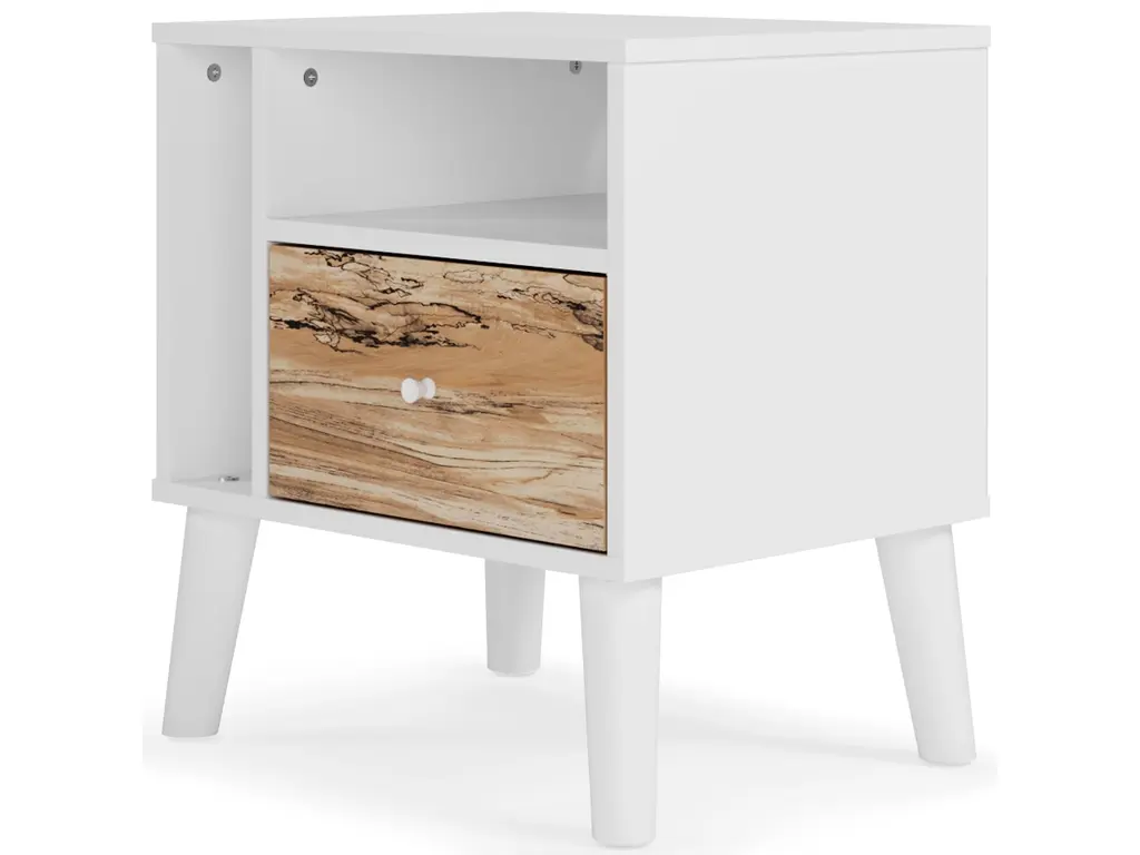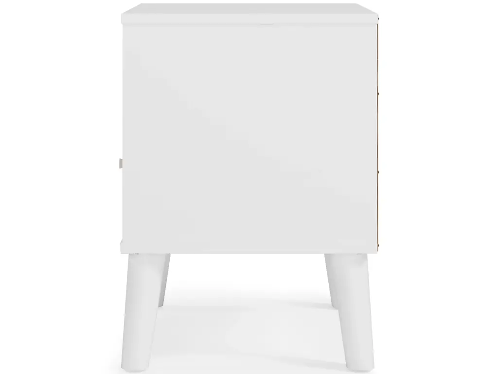 The perfect marriage of contemporary and casual style, the Piperton nightstand is a charming addition to your home. It's expressive with a two-tone look in a solid matte white finish and a replicated sugarberry wood grain pattern. White knobs and splay legs add a finishing touch, while the open shelving allows for extra storage.