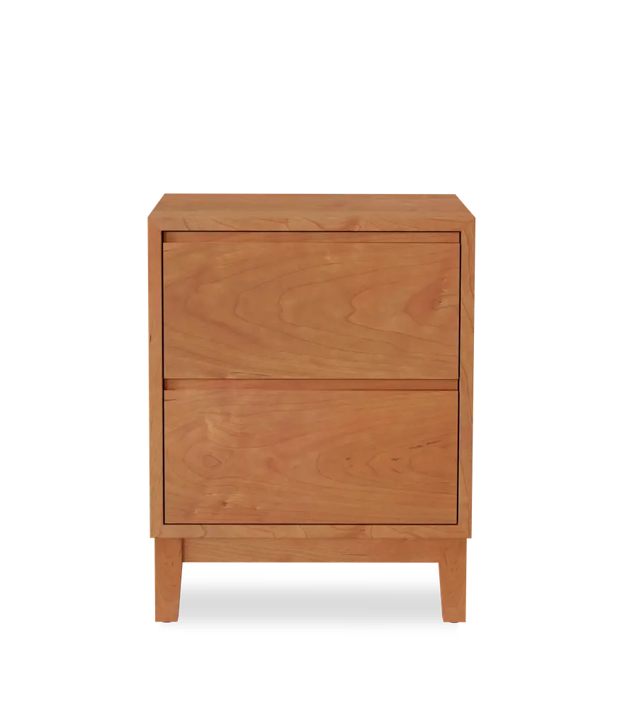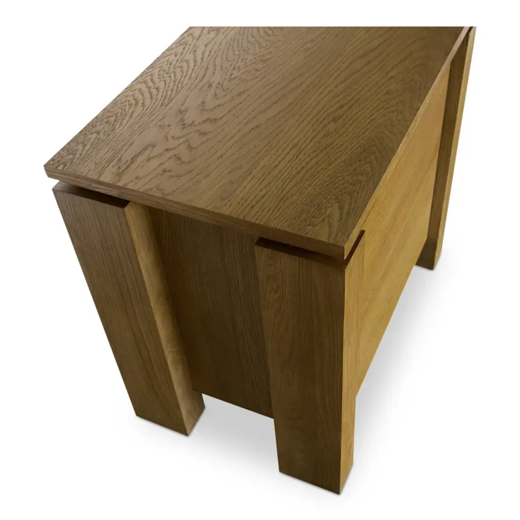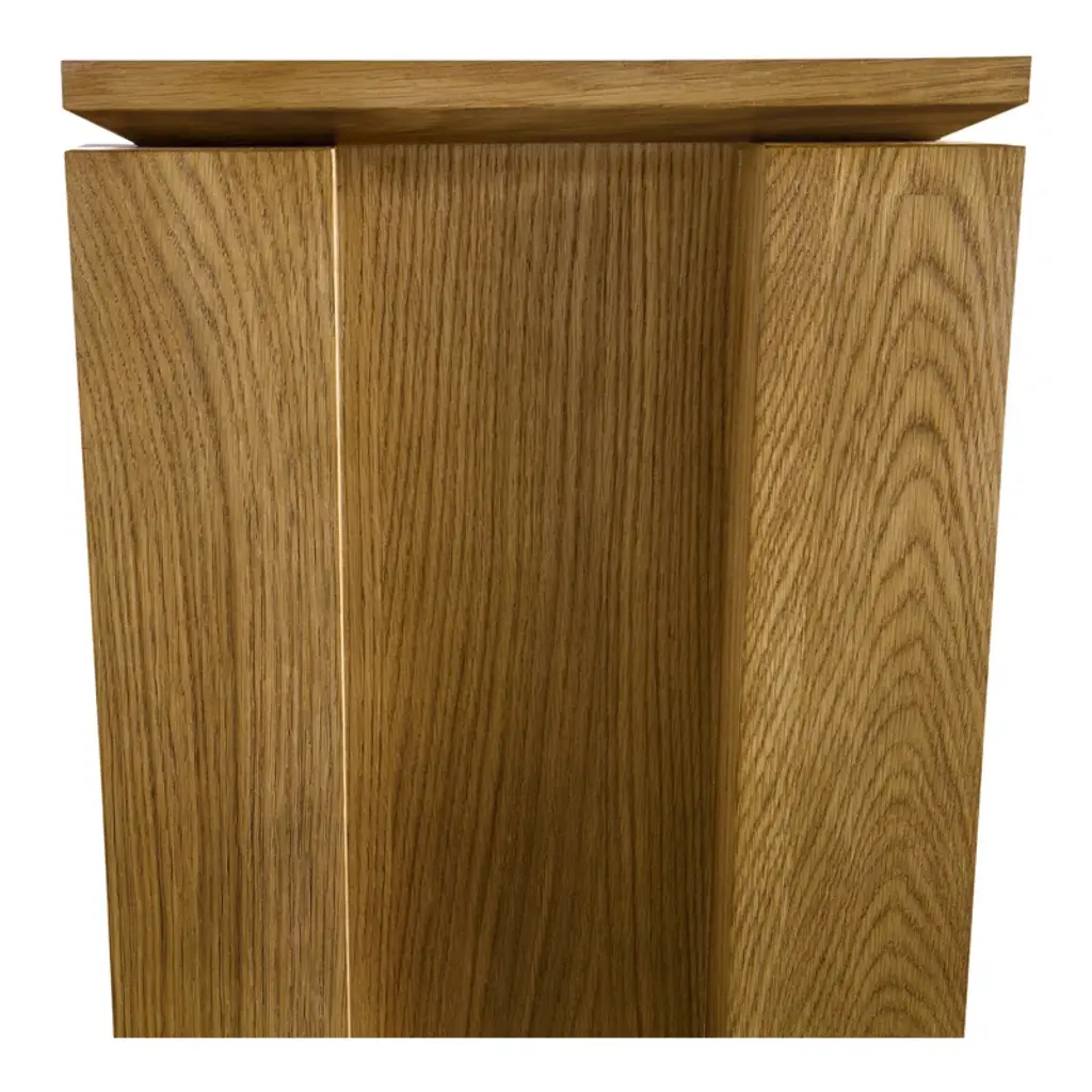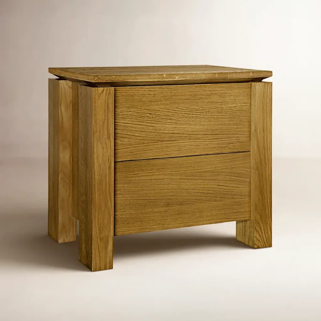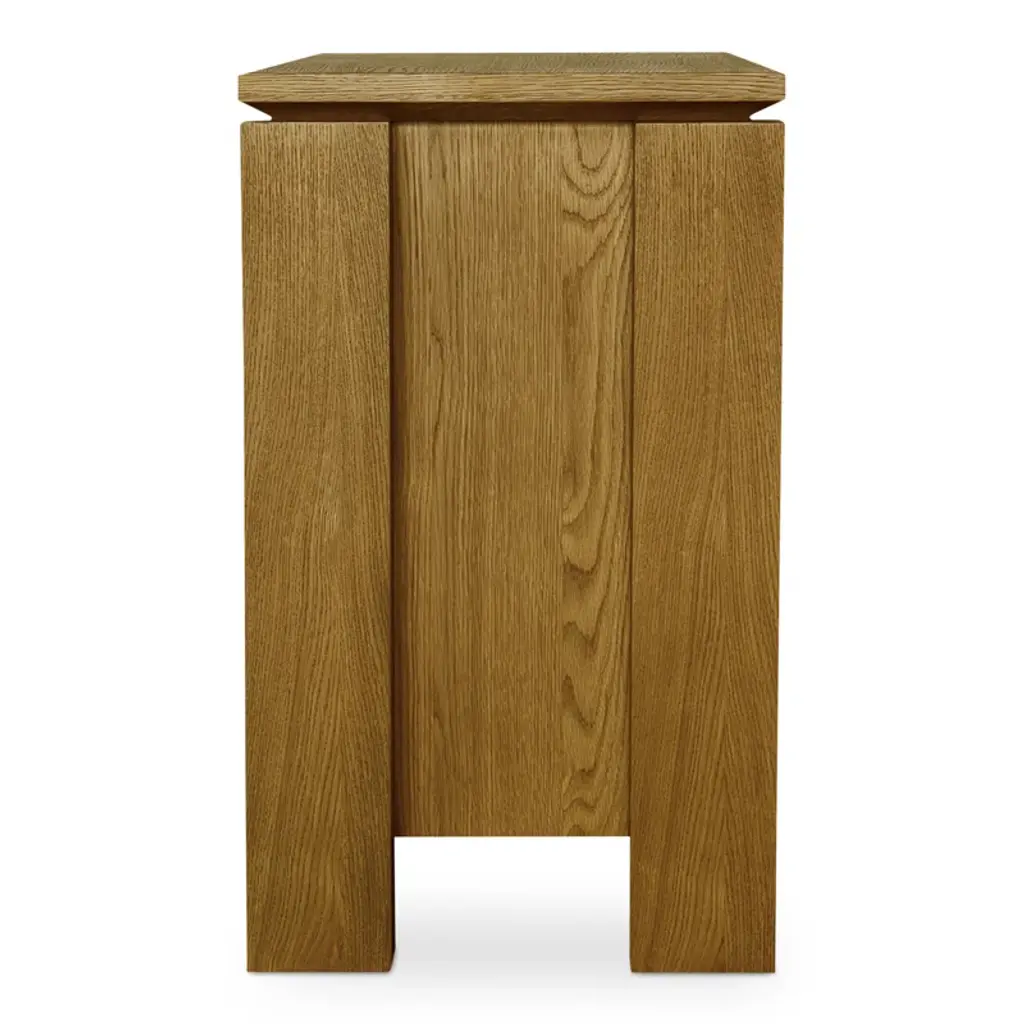 The Payton nightstand blends a blocky silhouette with a visually light, undercut top that appears to float on its strong, thick legs. Crafted from solid oak and clean oak veneer door fronts, its mid-tone brown oak finish, enhanced by wire brushing, offers a rustic flair that complements various interior styles.