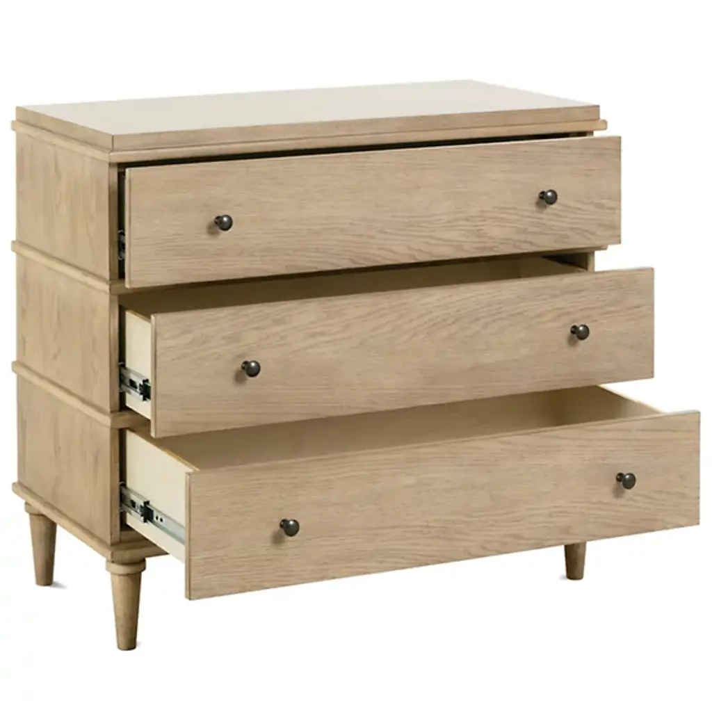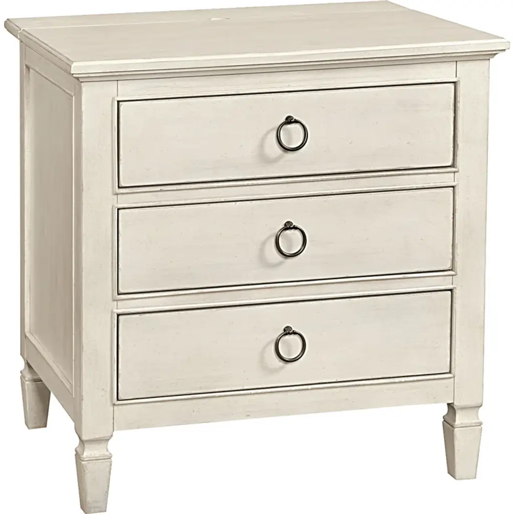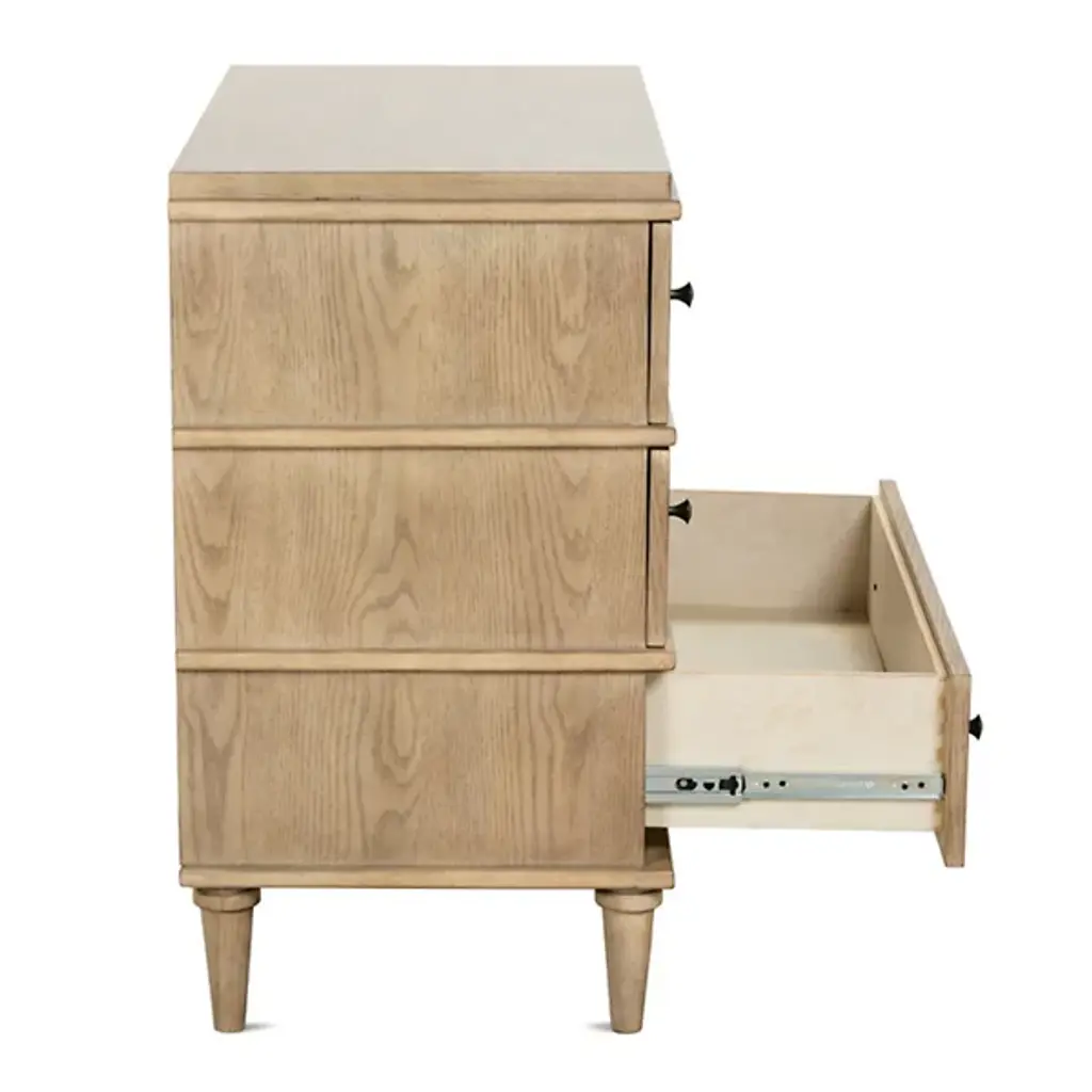 The Provence Night Stand from Rowe Furniture matches rustic modern style with unparalleled functionality. Made from solid rubberwood and surfaced in flat-cut white oak veneer, this nightstand features three drawers equipped with heavy-duty soft-close glides and English dovetail construction for durability and vintage appeal. Adjustable floor glides offer stability, making it a versatile piece for your bedroom. It combines clearly defined lines with rustic elements, giving this fixture unforgettable character.
