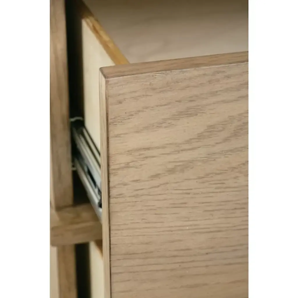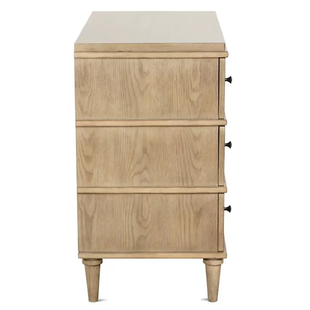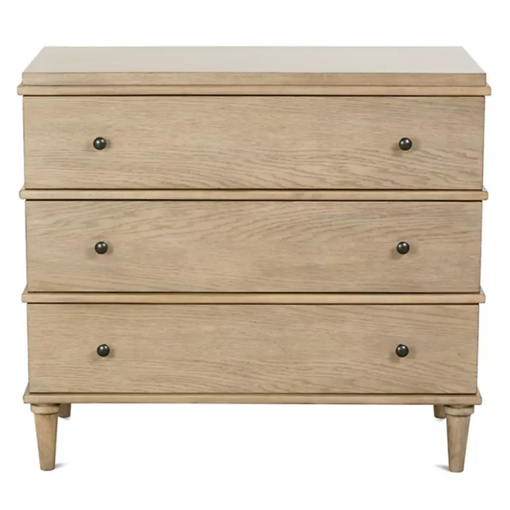 The Provence Night Stand from Rowe Furniture matches rustic modern style with unparalleled functionality. Made from solid rubberwood and surfaced in flat-cut white oak veneer, this nightstand features three drawers equipped with heavy-duty soft-close glides and English dovetail construction for durability and vintage appeal. Adjustable floor glides offer stability, making it a versatile piece for your bedroom. It combines clearly defined lines with rustic elements, giving this fixture unforgettable character.