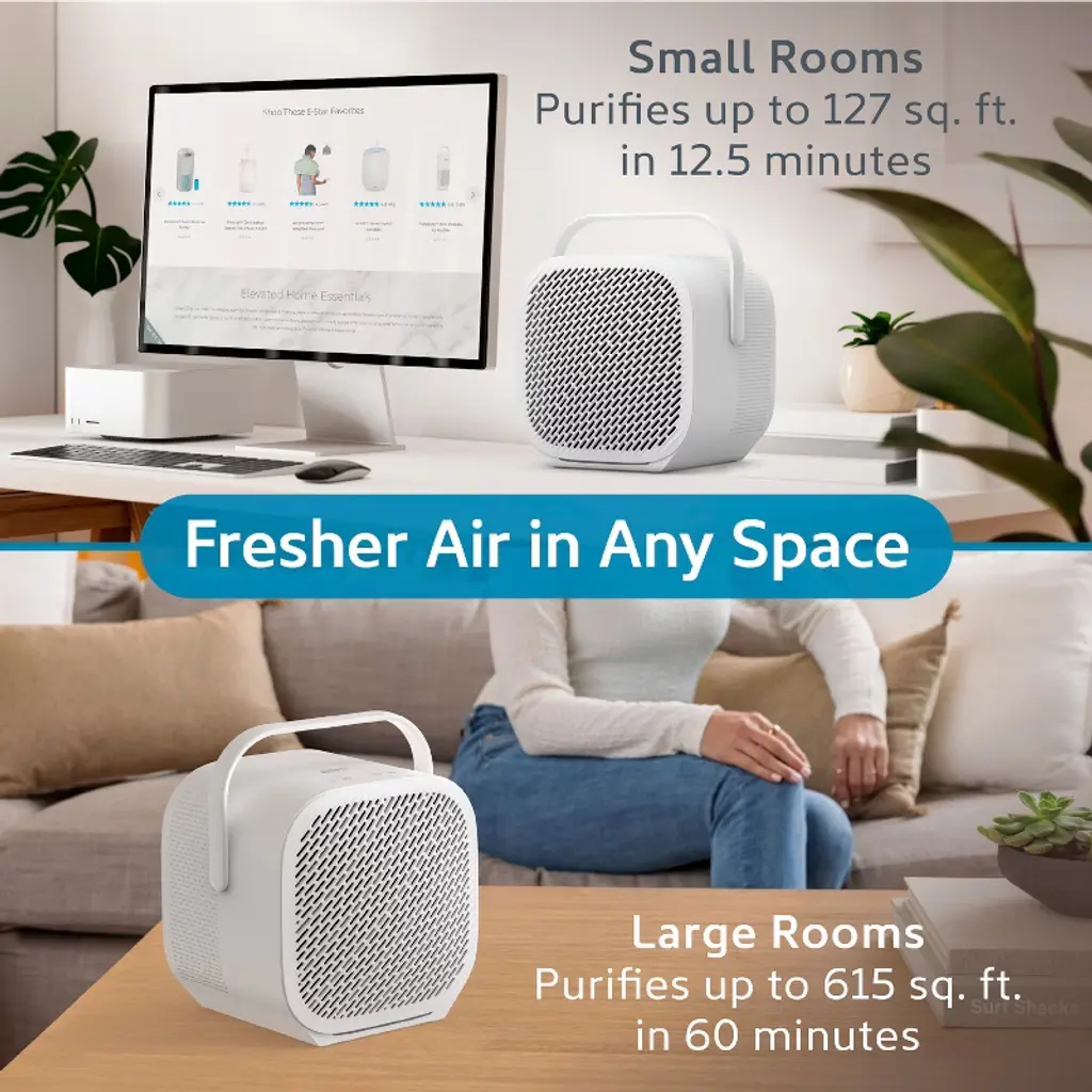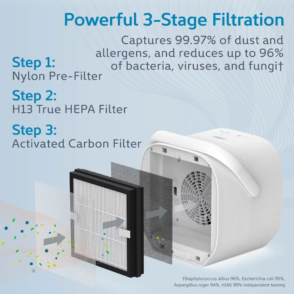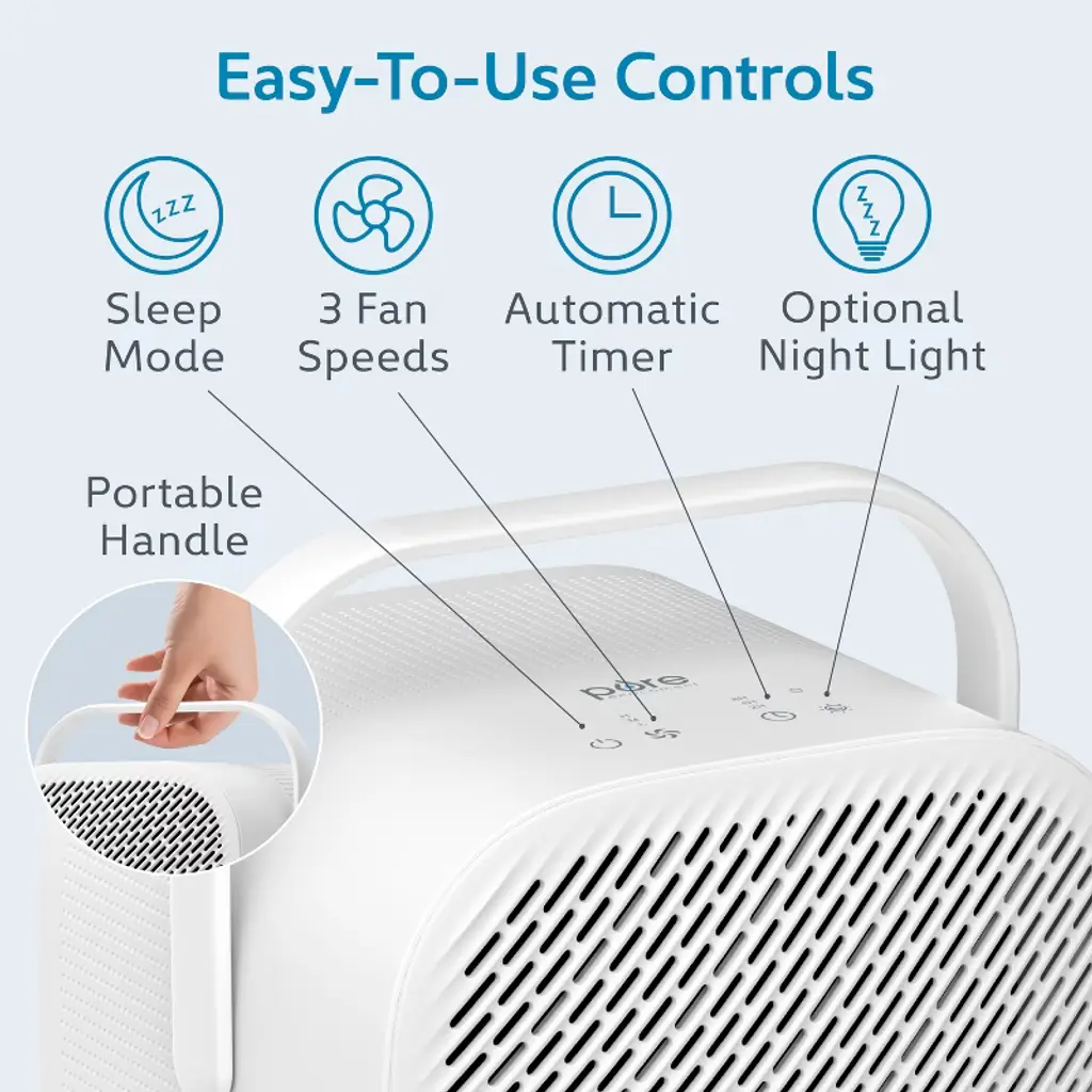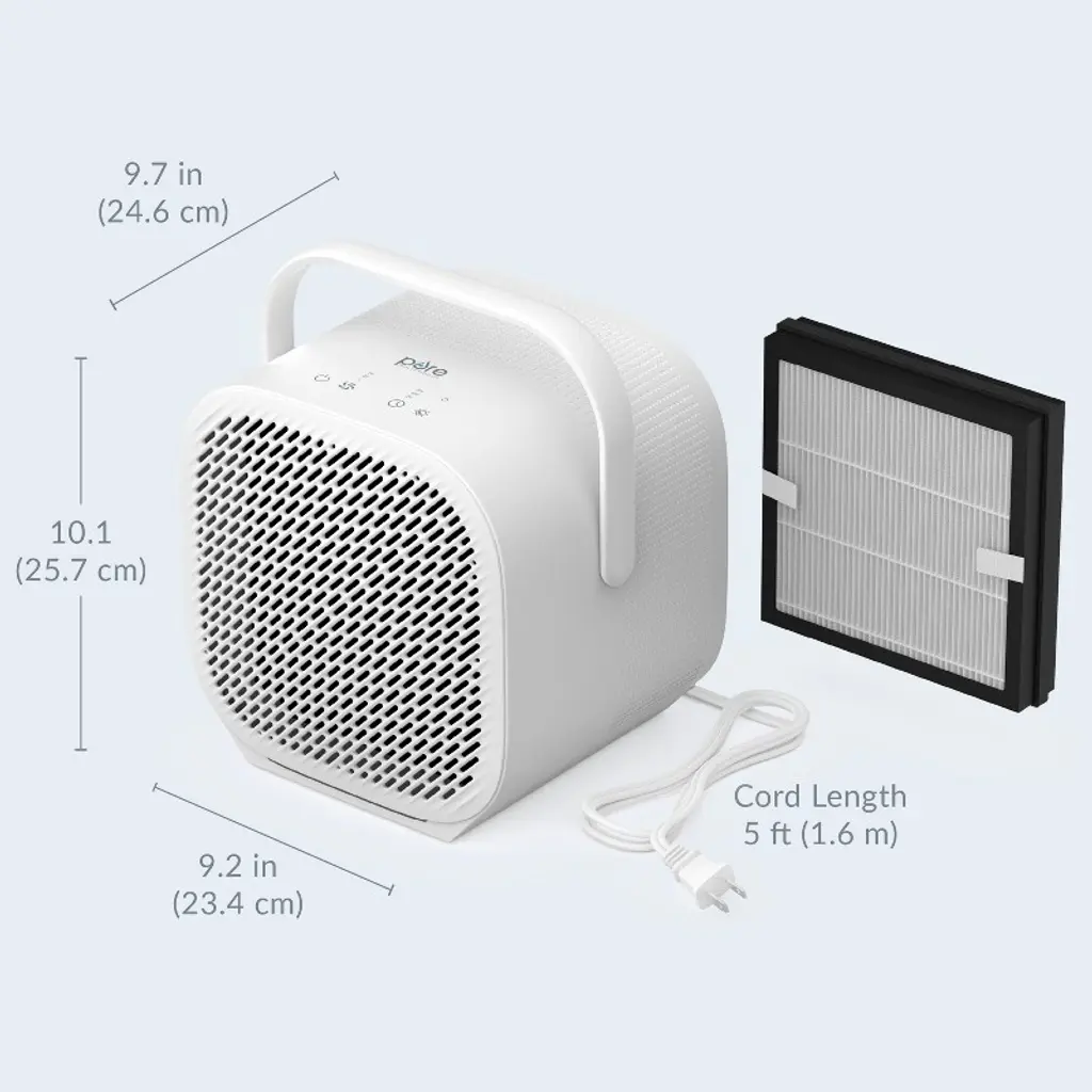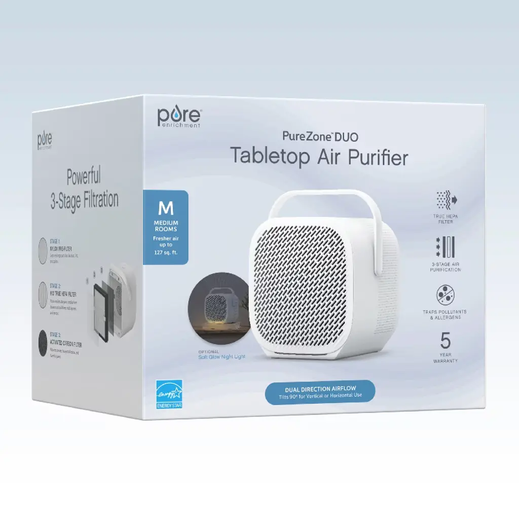 Enjoy fresher air for your family with the PureZone DUO Tabletop Air Purifier. This HEPA air purifier is the perfect solution for cleaner, fresher air in your home or workspace. With its powerful 3-stage filtration system, including a Nylon Pre-Filter, H13 True HEPA Filter, and Activated Carbon Filter, this air purifier for small to large rooms helps to eliminate odors, smoke, dust, and pollen, making it ideal for those with allergies or sensitivities. The portable air purifier adapts to your needs with dual-direction airflow, allowing you to use it horizontally in larger spaces or vertically in tighter areas. Designed as a tabletop air purifier, it features a compact, portable design that fits seamlessly on any desk, countertop, or nightstand. Perfect as a mini air purifier for desks or small spaces, it offers customizable settings like 3 fan speeds, a timer, and an optional nightlight with 3 brightness levels. Whisper-quiet and Energy Star-certified, this air purifier ensures you can enjoy clean air without noise or distractions, whether you're working, relaxing, or sleeping.Versatile Dual-Direction Airflow: Adjust the purifier to tilt 90° for horizontal use in large spaces or vertical use in smaller areas like desks and countertops.Designed for Portability: This small air purifier features a sleek, compact design, quiet operation, and a handle, making it ideal as a mini desk air purifier for home or office.Personalized Cean Air Comfort: Enjoy 3 fan speeds, a timer, sleep mode, and an optional nightlight, ensuring effective odor and pollen control while you rest or work.Sleek, Quiet, and Portable: Designed for modern living, the Energy-Star Certified compact purifier features a convenient handle for effortless placement in any space. It's whisper-quiet operation and efficient performance makes it perfect for bedrooms, offices, or dorms. 5-Year Manufacturer’s Warranty: Backed by Pure Enrichment’s 5-year manufacturer’s warranty and reliable customer support, this tabletop air purifier delivers trusted performance and long-lasting durability.
