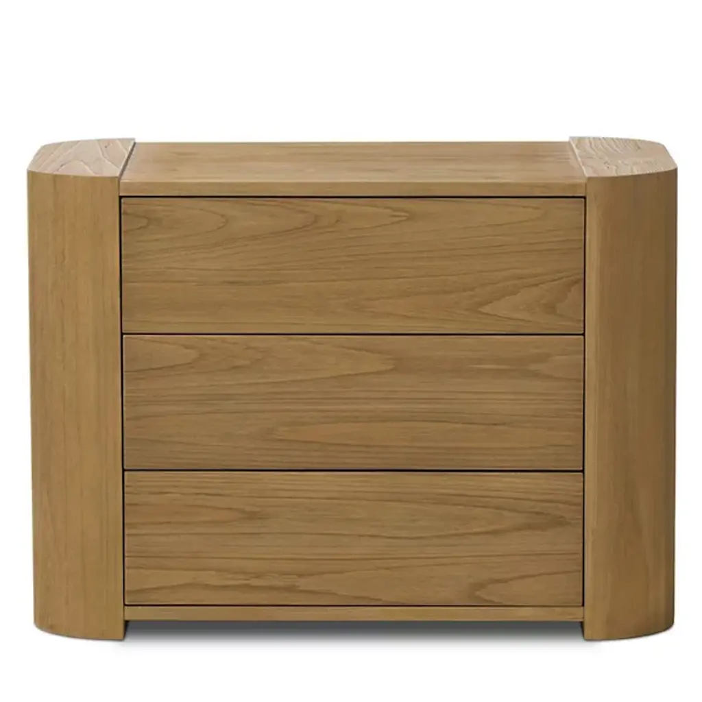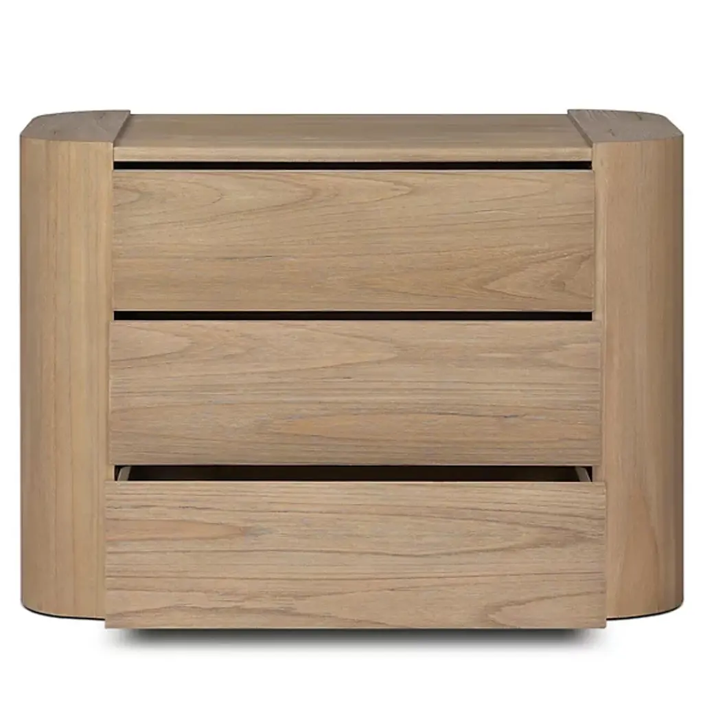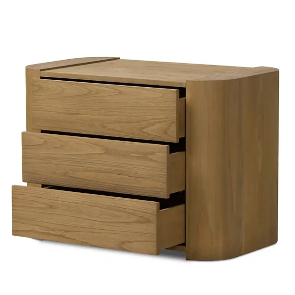 The Radius Nightstand from Four Hands brings soft, minimalist style to bedroom spaces through thick sungkai veneer construction that highlights natural wood beauty. Sandblasted finishing enhances the grain's texture and depth, creating visual interest across the gently curved form. Rounded corners soften the geometric lines, producing an approachable aesthetic that complements various design styles. This nightstand’s three push-latch drawers offer discreet storage for nighttime essentials without disrupting the clean surface flow.