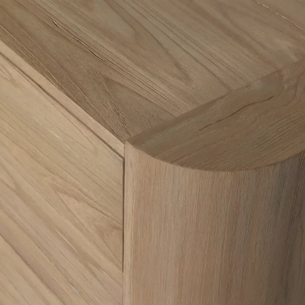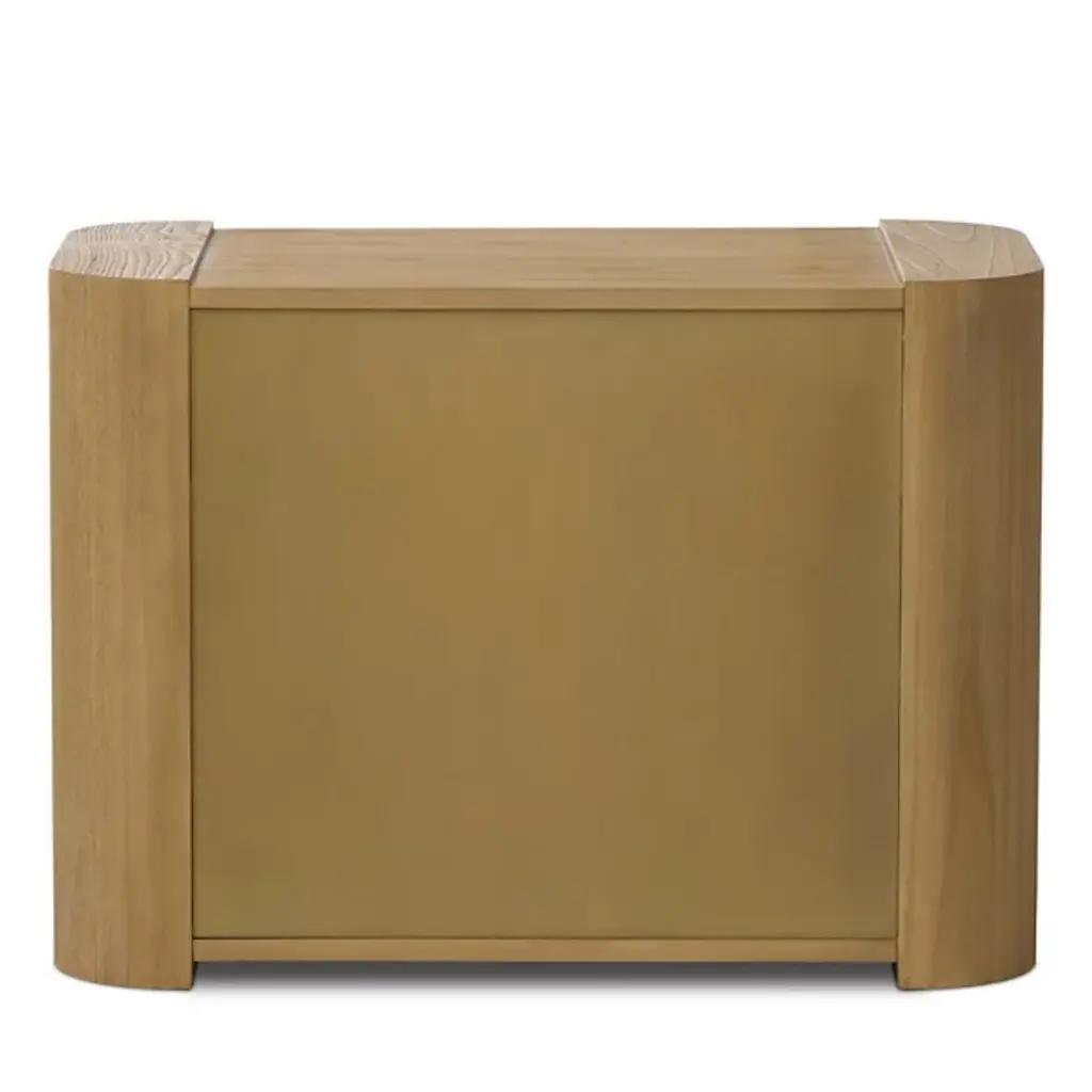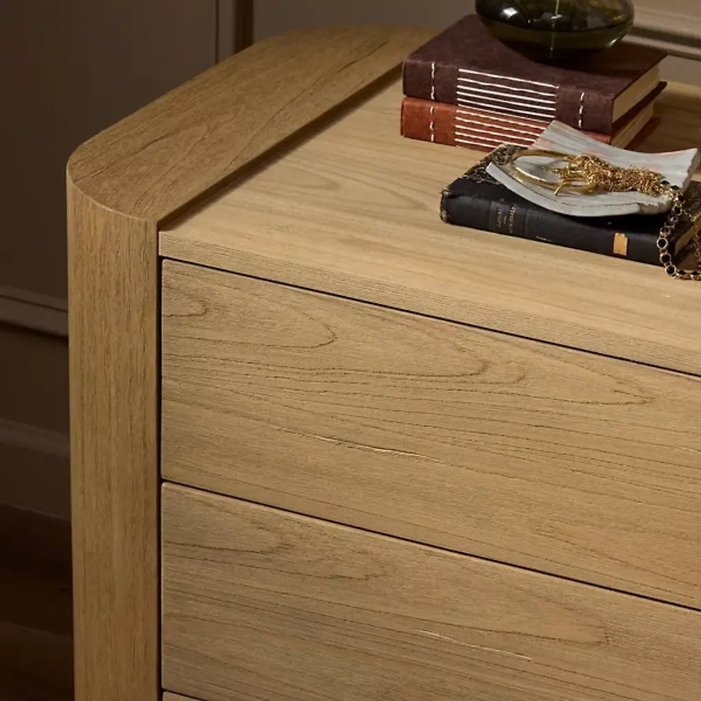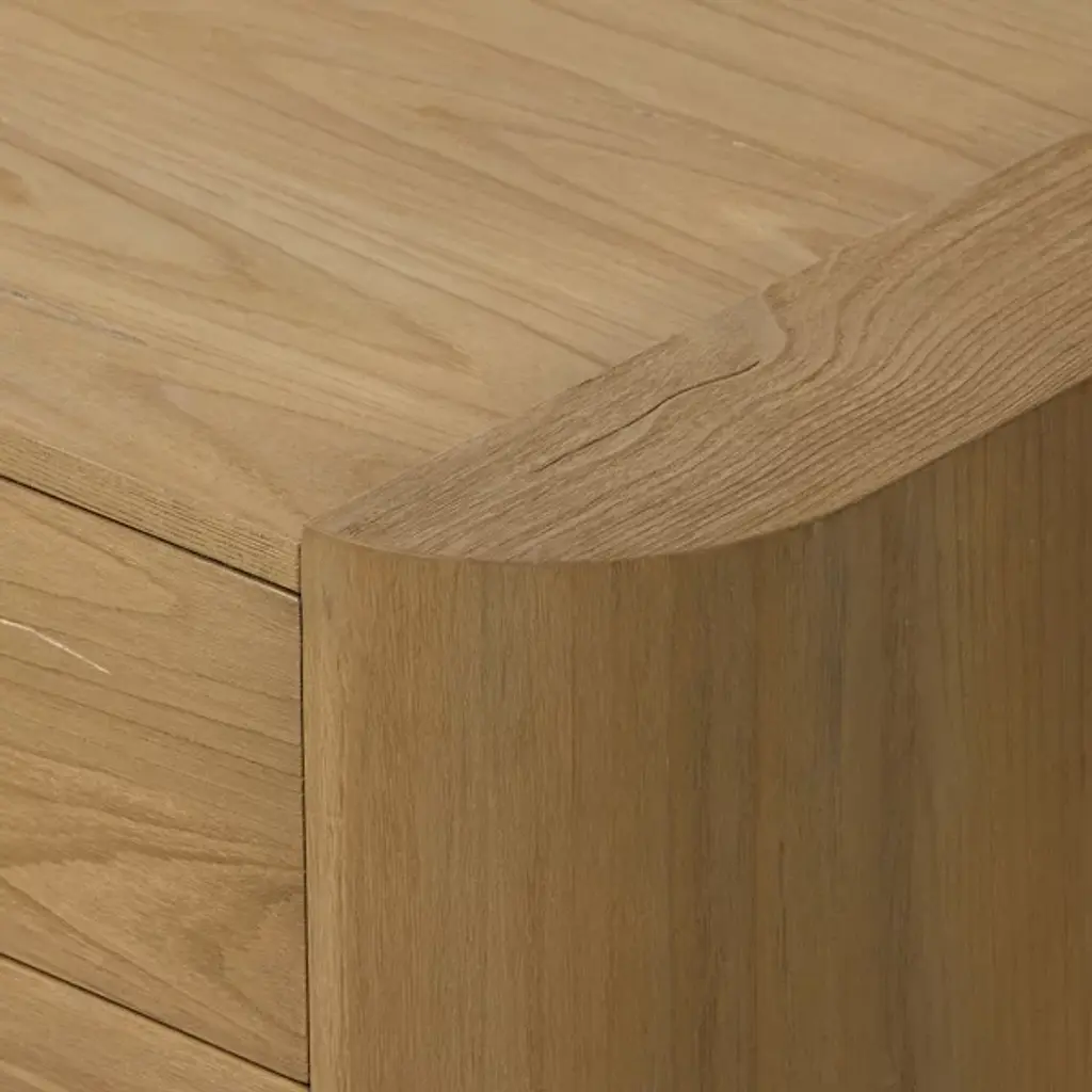 The Radius Nightstand from Four Hands brings soft, minimalist style to bedroom spaces through thick sungkai veneer construction that highlights natural wood beauty. Sandblasted finishing enhances the grain's texture and depth, creating visual interest across the gently curved form. Rounded corners soften the geometric lines, producing an approachable aesthetic that complements various design styles. This nightstand’s three push-latch drawers offer discreet storage for nighttime essentials without disrupting the clean surface flow.