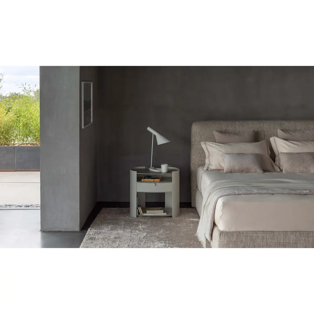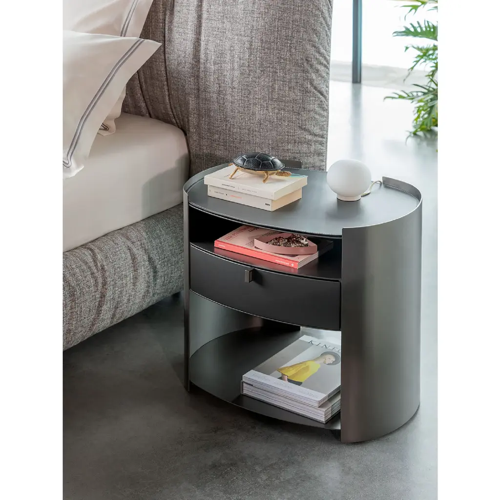 Introducing the Flou Lotus Raised-Edge Metal Nightstand - a perfect balance of elegance and functionality. Its curved metal structure provides stability and strength, while the minimal edges and thickness give a light and airy feel. Available in various finishes, it features a drawer and three shelves, making it a practical addition to any bedroom. Complete the look with a matching hide pad for the raised-edge top.