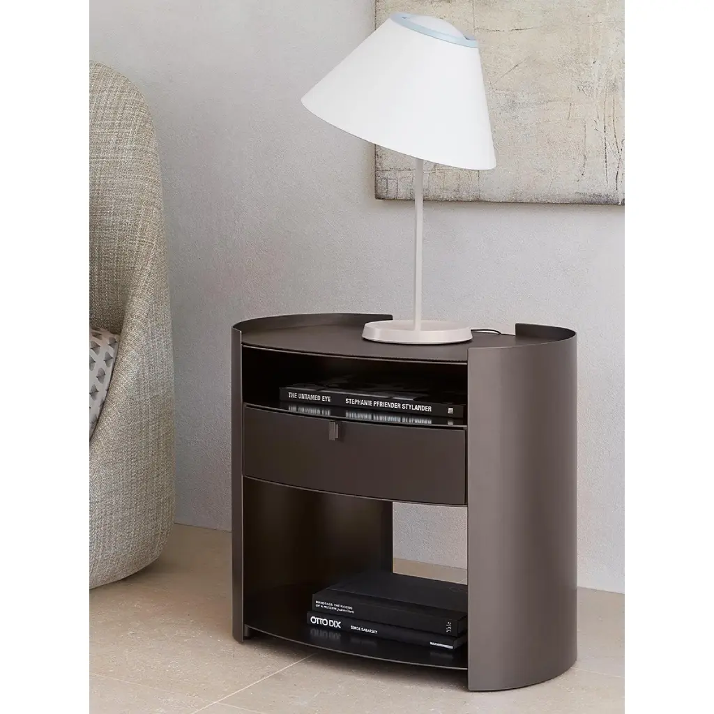 Introducing the Flou Lotus Raised-Edge Metal Nightstand - a perfect balance of elegance and functionality. Its curved metal structure provides stability and strength, while the minimal edges and thickness give a light and airy feel. Available in various finishes, it features a drawer and three shelves, making it a practical addition to any bedroom. Complete the look with a matching hide pad for the raised-edge top.