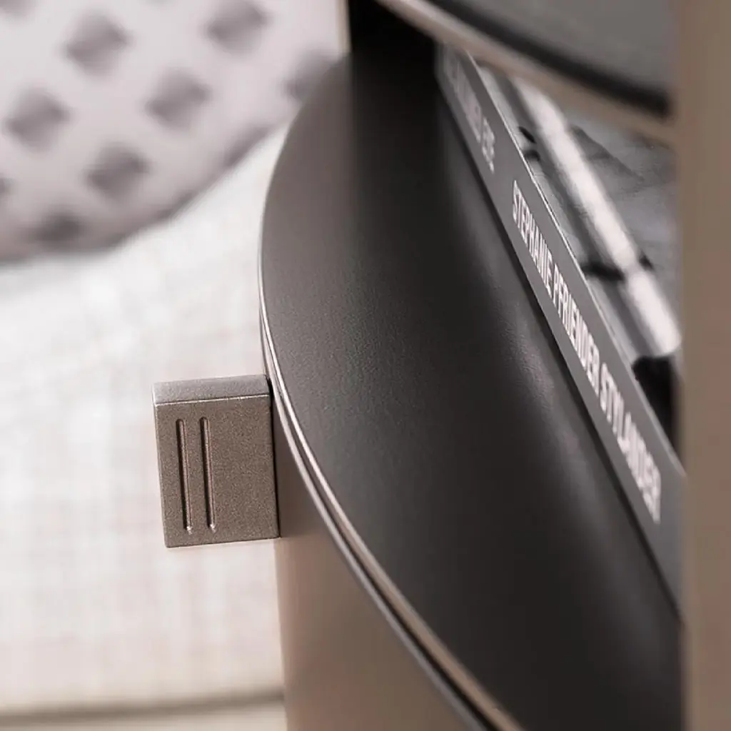 Introducing the Flou Lotus Raised-Edge Metal Nightstand - a perfect balance of elegance and functionality. Its curved metal structure provides stability and strength, while the minimal edges and thickness give a light and airy feel. Available in various finishes, it features a drawer and three shelves, making it a practical addition to any bedroom. Complete the look with a matching hide pad for the raised-edge top.