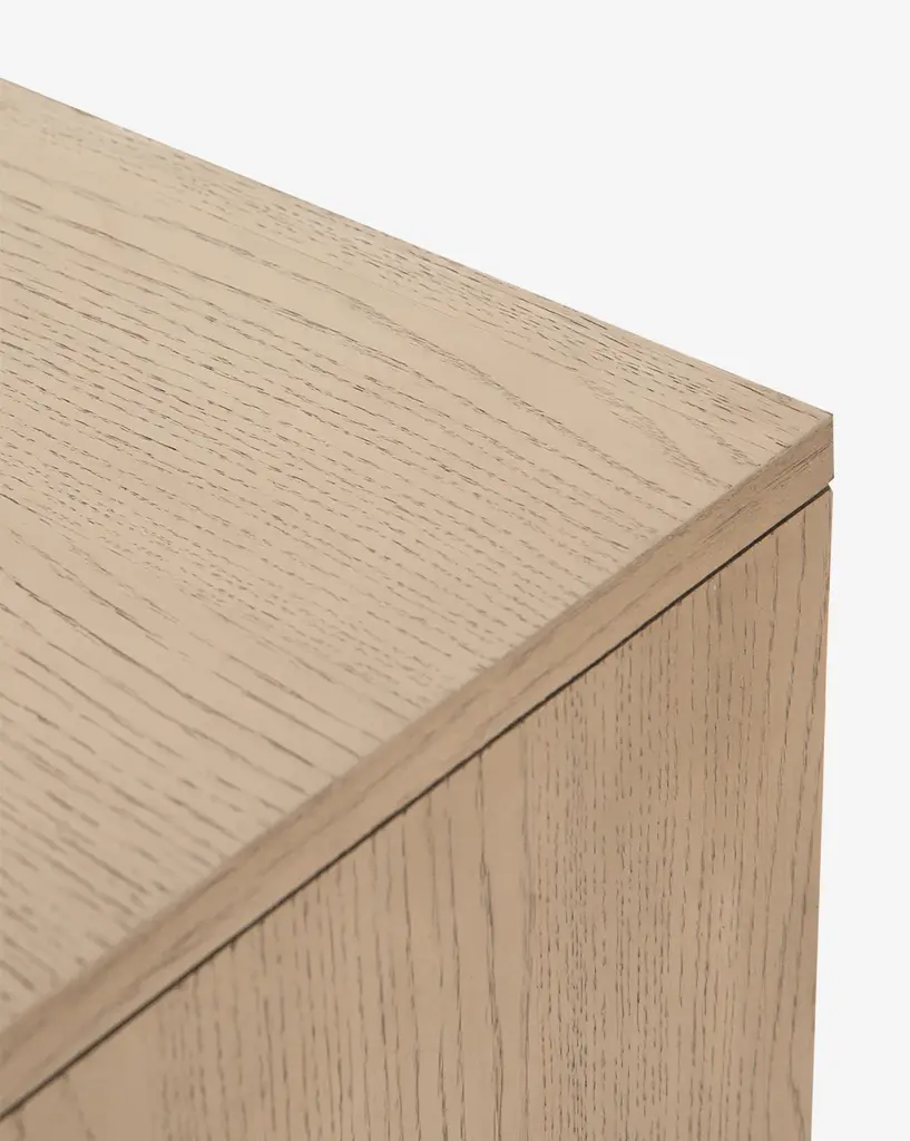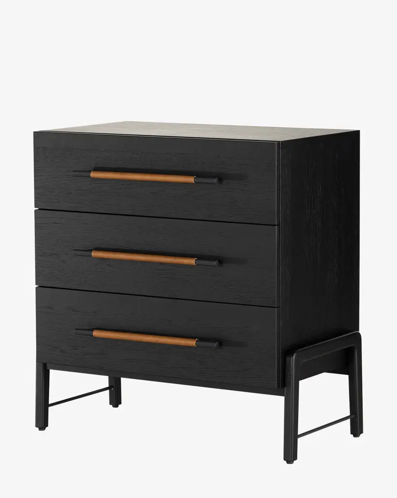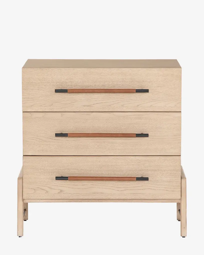 Featuring a stunning material mix, the Ralston 3-Drawer Nightstand brings both form and function to your bedroom design. Crafted with an oak frame, this nightstand is finished with iron hardware wrapped in tan top-grain leather creating a sophisticated look and feel.