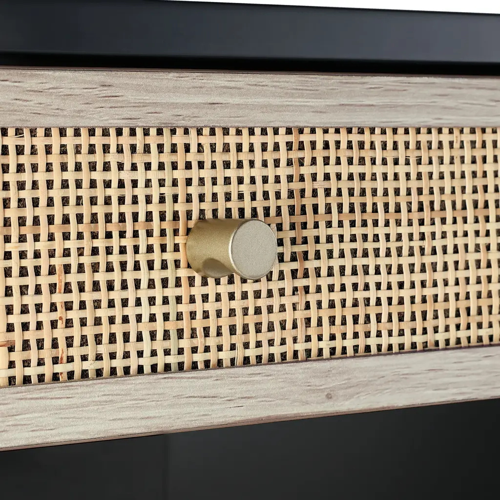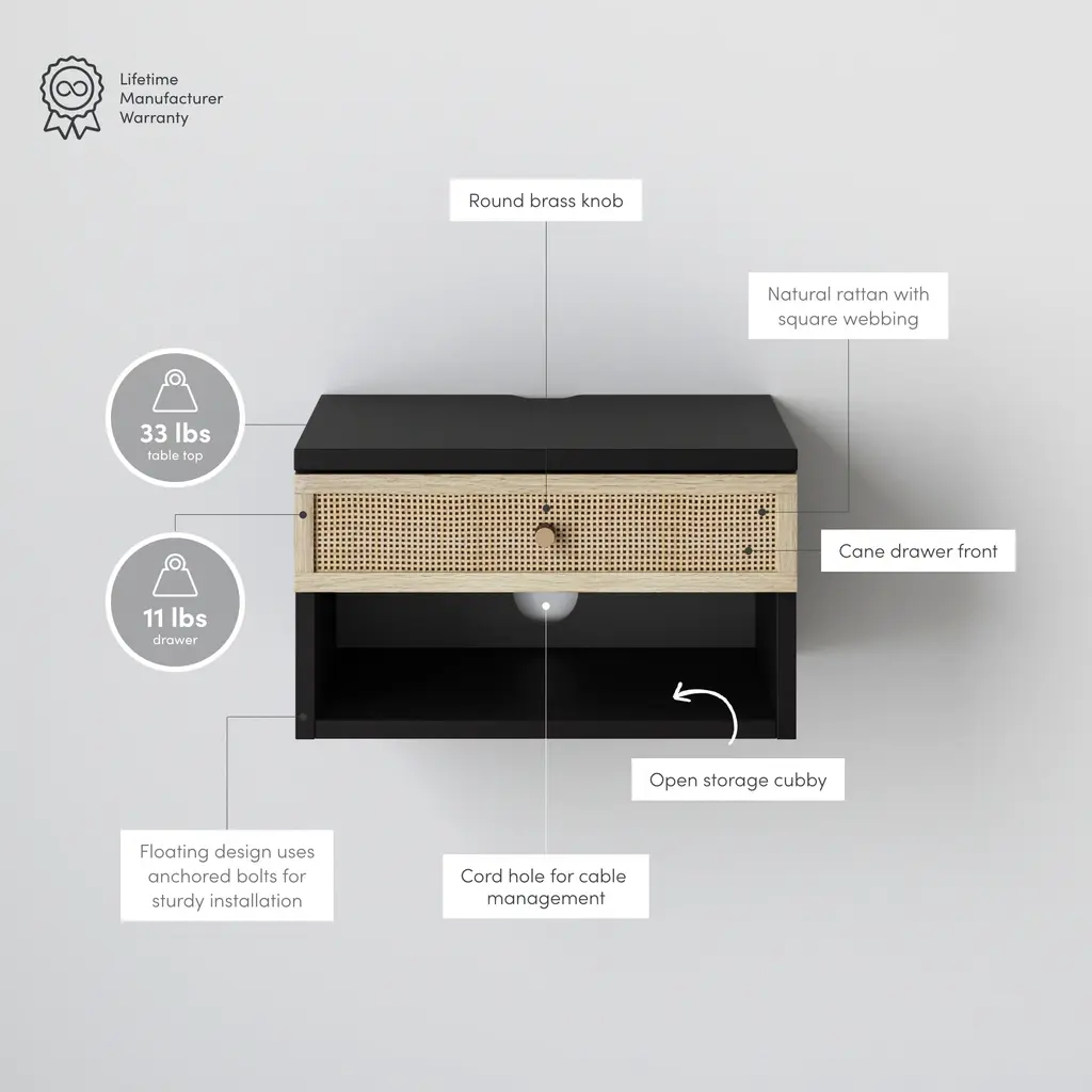 Our Jackson Floating Side Table is what boho dreams are made of. Finished with a natural rattan drawer front and a black cabinet body, Jackson makes a perfect backdrop for your side table decor. There's even a closed drawer for storing away your not-so-pretty electronics. Reach in the open cubby and you'll find a cord hole for cable management—never worry about an uncharged cell phone or laptop again! Its dreamy floating design allows you to position the table at any wall height that works for you, with sturdy structure that can support up to 33 lbs. on the table top and 11 lbs. in the drawer.