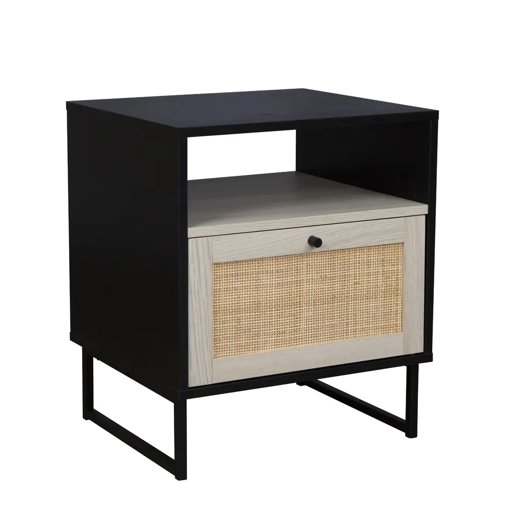 Rattan & Wood Storage Nightstand Black