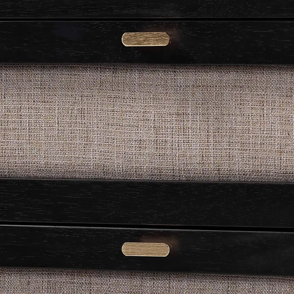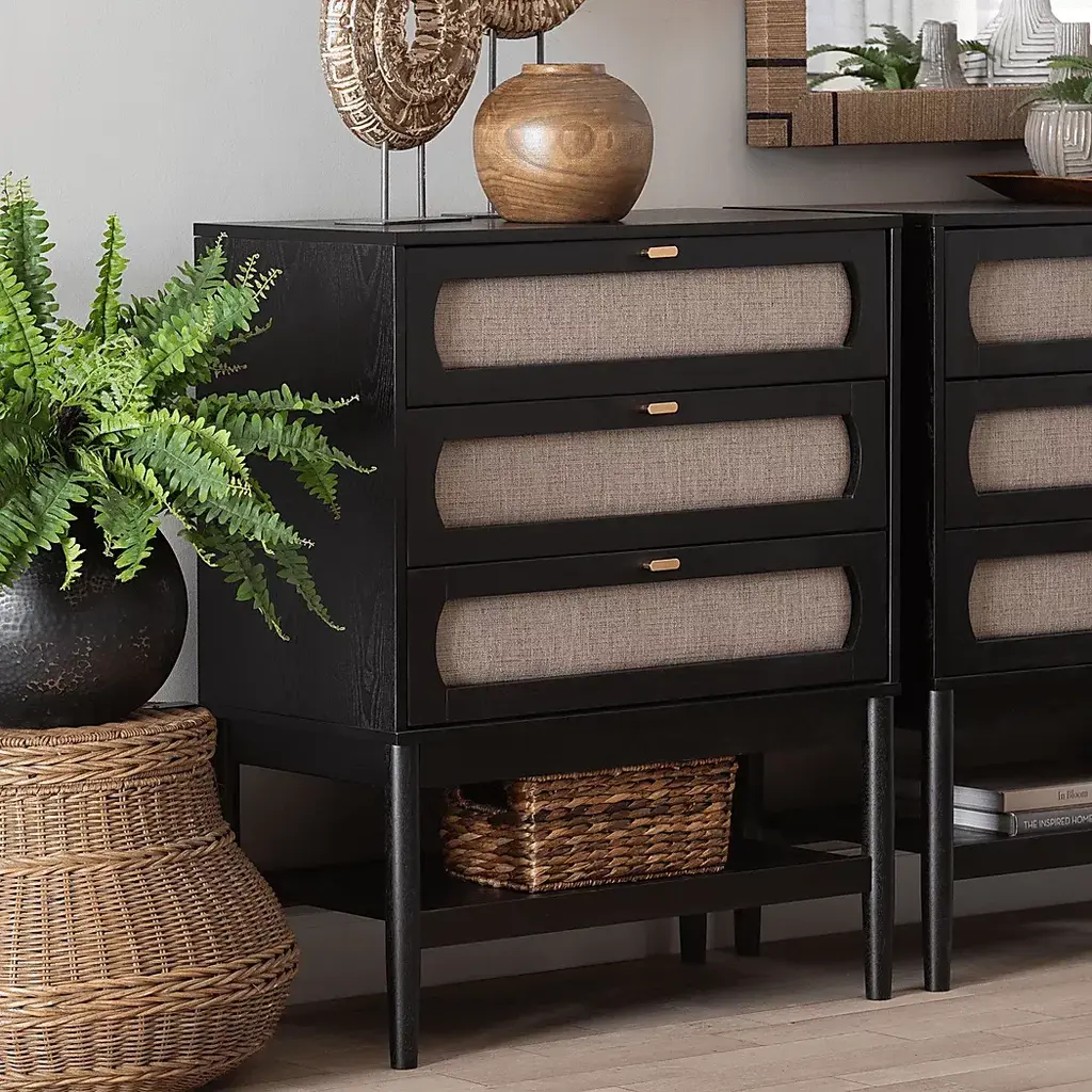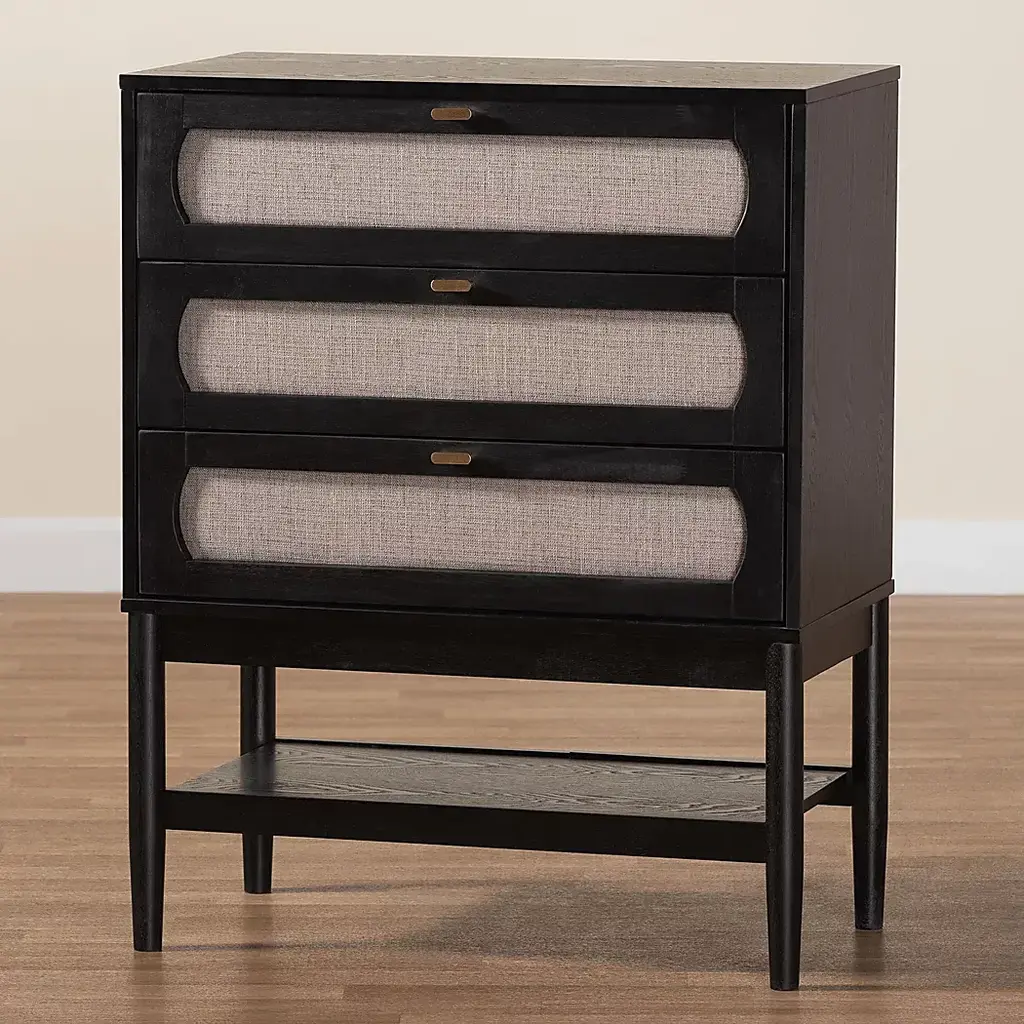Savor a tranquil ambiance while organizing your bedside with the Ravenfly black chest. This mid-century inspired piece is crafted from sturdy wood while each drawer front is upholstered in soothingly soft fabric. Three interlocking drawers offer convenient storage space for clothes while reserving the open shelf and tabletop as fantastic display areas. The Ravenfly is adorned with a sleek metal drawer pull that radiates minimalist charm. Tapered legs accentuate the sleek geometry of the piece, making the Ravenfly a fantastic bedside accessory. Customer assembly is required.