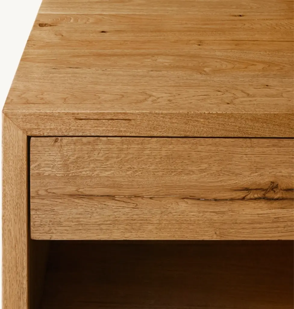 A slimmed-down take on our iconic Reclaimed Oak collection, this nightstand from artisan Nils Verhoeven features a minimalist form set within a slender frame. Hand crafted from reclaimed oak timbers from decades-old buildings in Europe, each unadorned piece retains the natural character of the wood, bearing the occasional knot, nick or crack that makes it uniquely one of a kind. SHOP THE ENTIRE COLLECTION