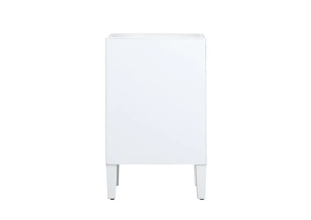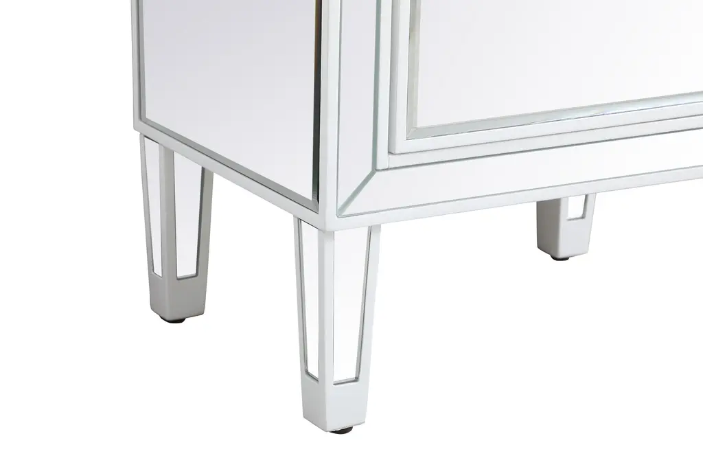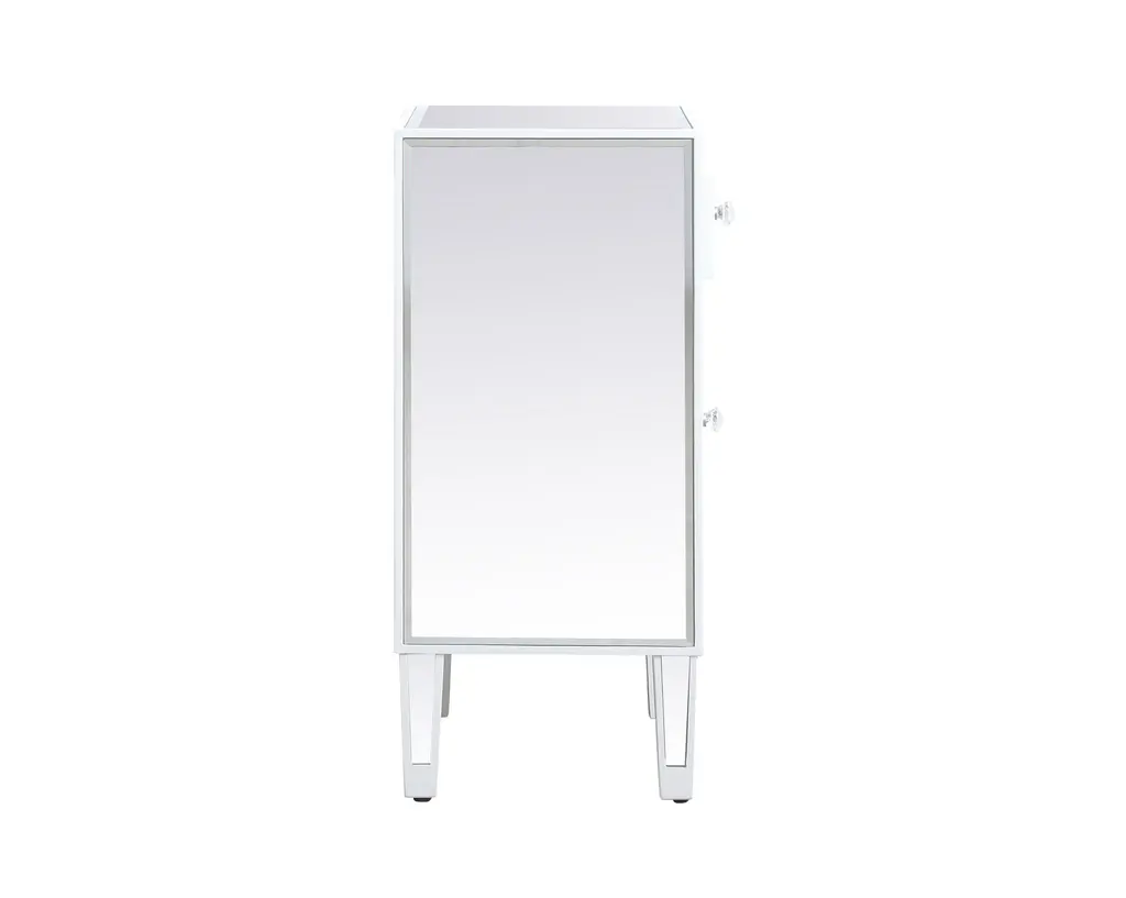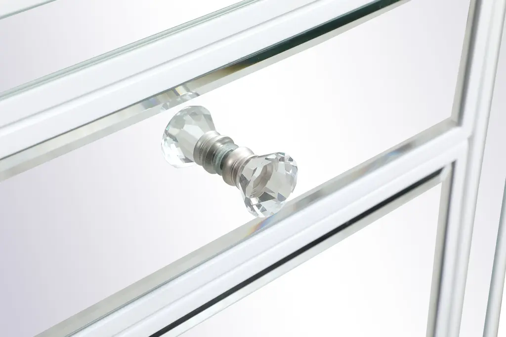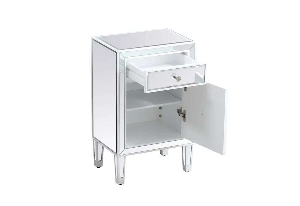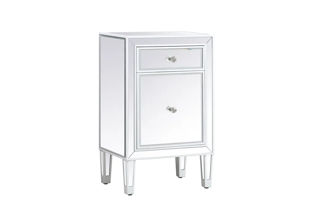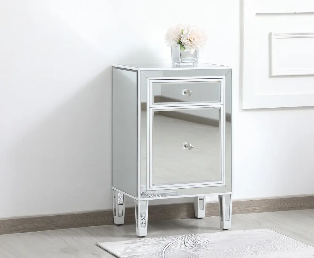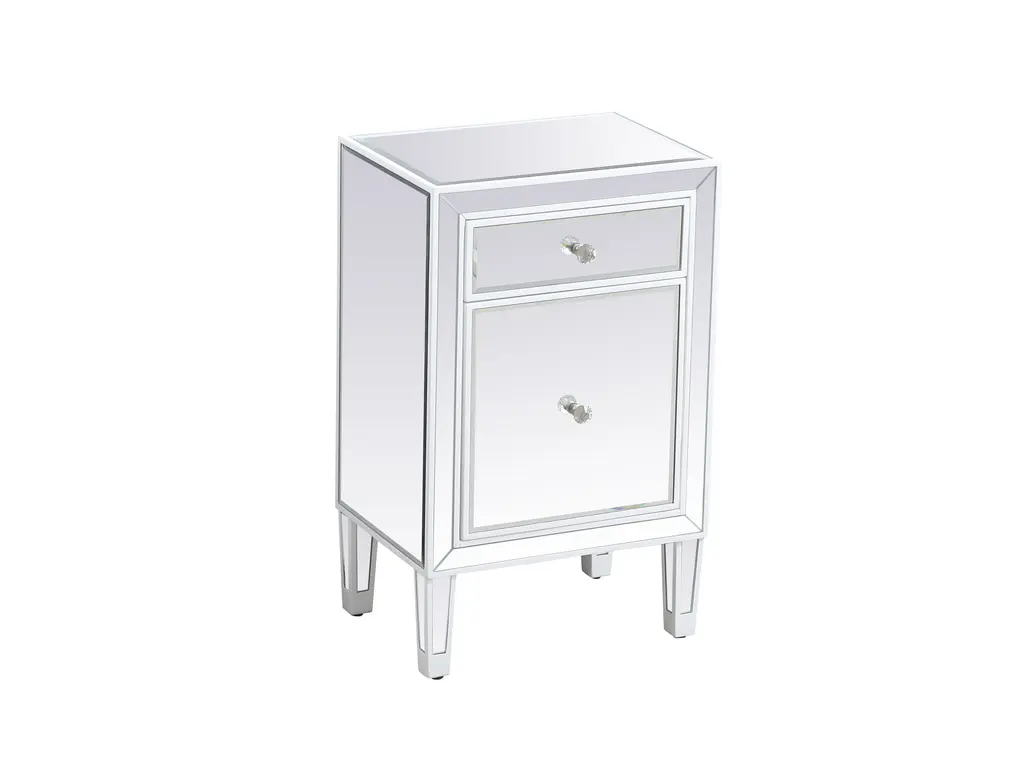 Add a touch of class to your bedroom or any room with this stunning accent chest or nightstand. With beaming mirrored surfaces, it opens up the visual space in the room while imbuing it with glamour. This functional contemporary chest comes with one drawer, one door, sparkling crystal knob, and gracefully tapered legs.