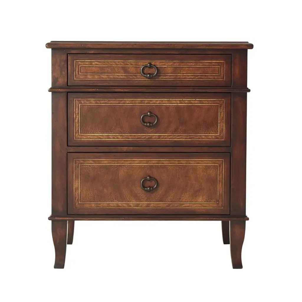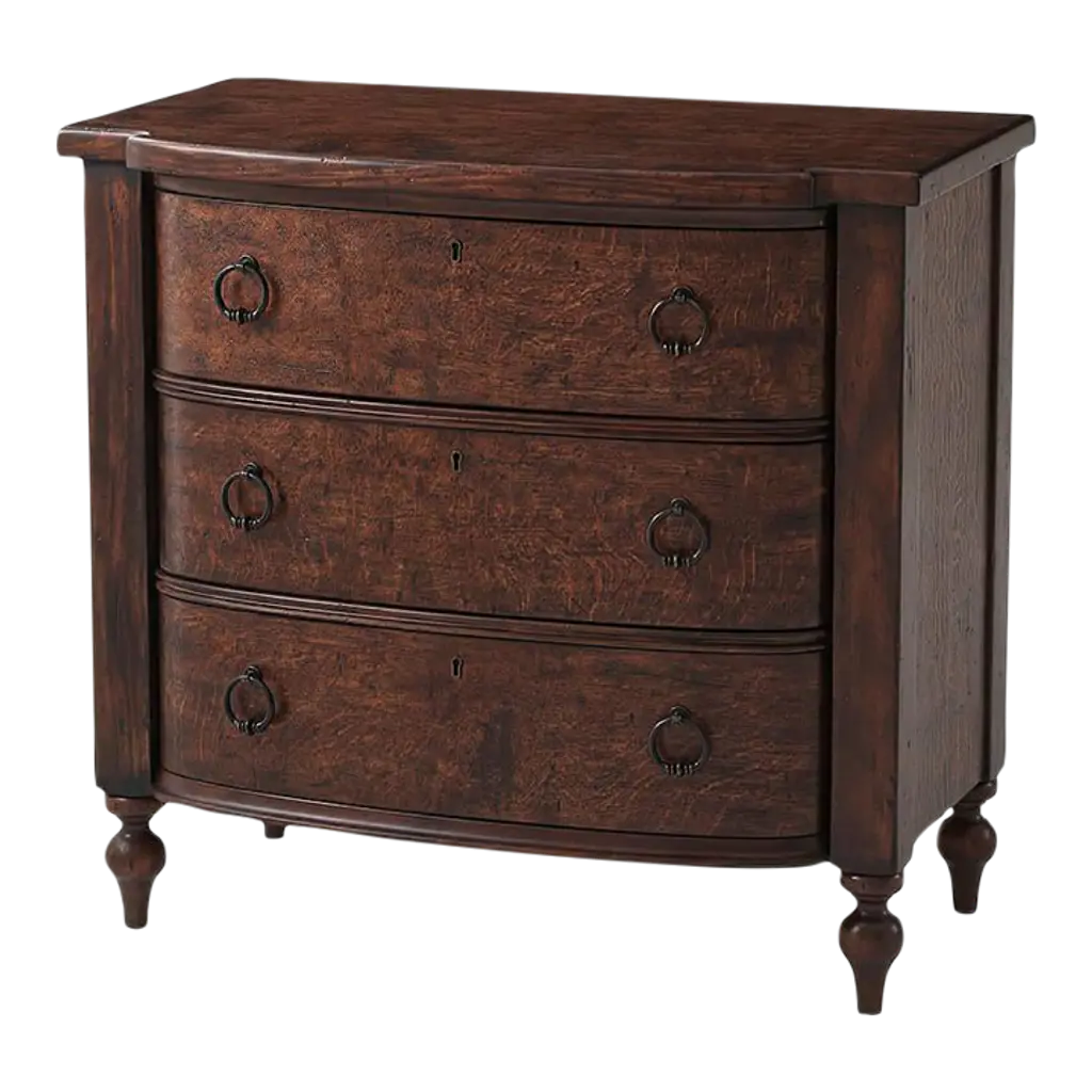 A Regency style reclaimed oak veneered and mahogany nightstand with D form drawer faces, a shaped top, and four finely turned legs supporting bold pilasters, with oil rubbed escutcheons and pulls on every drawer.Dimensions: 34" W x 20" D x 32" H.