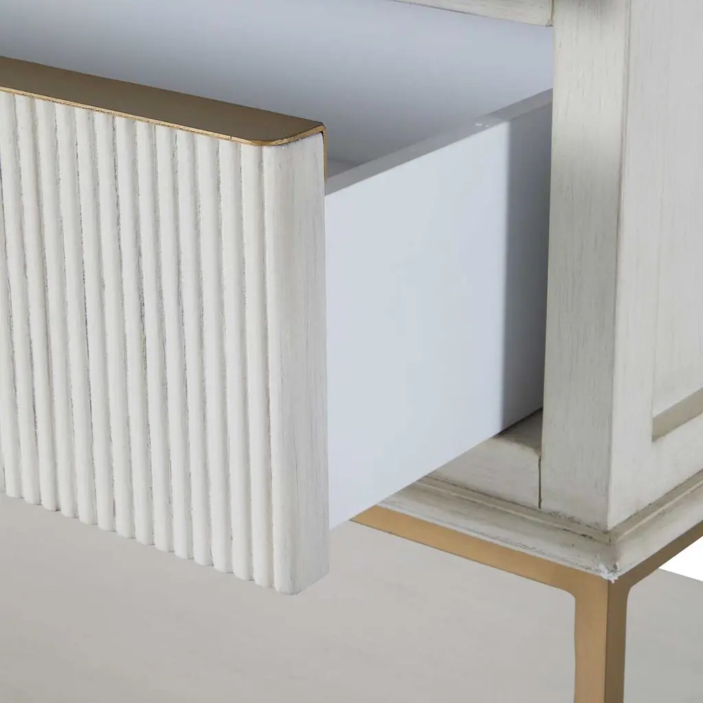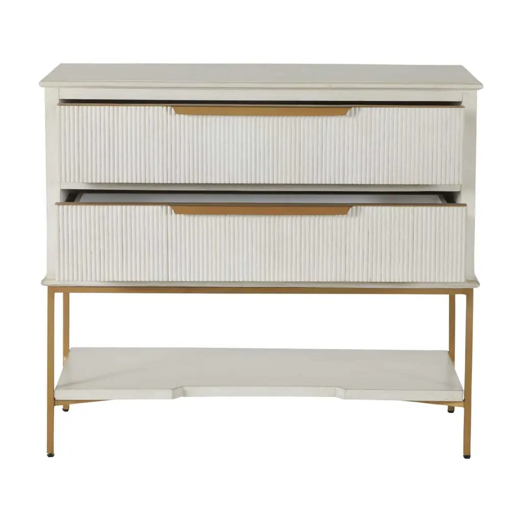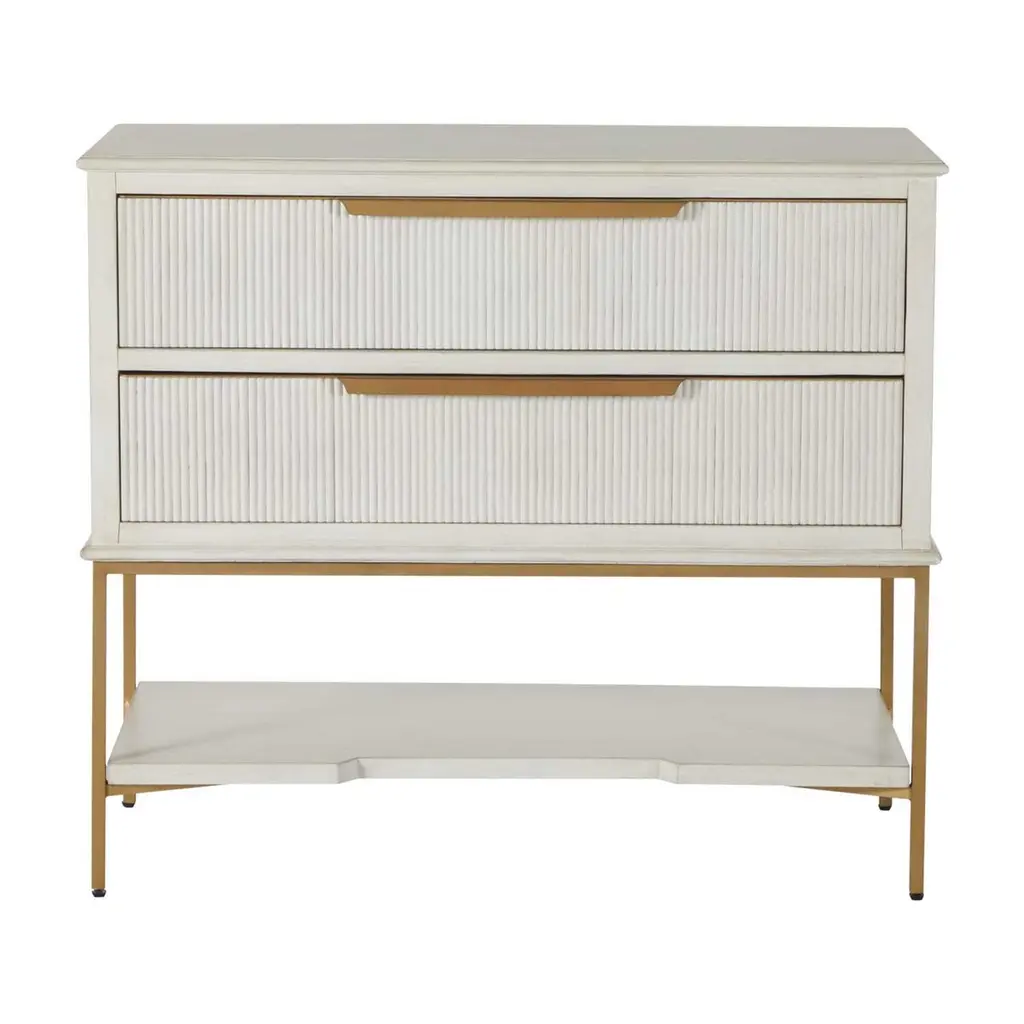 This transitional nightstand gets a contemporary touch with clean, modular styling. A simple gold metal frame supports the Riggs Nightstand which features two ribbed-front drawers plus a bonus shelf for extra storage or display. This product uses natural or handmade materials. Differences in color and pattern should be expected.