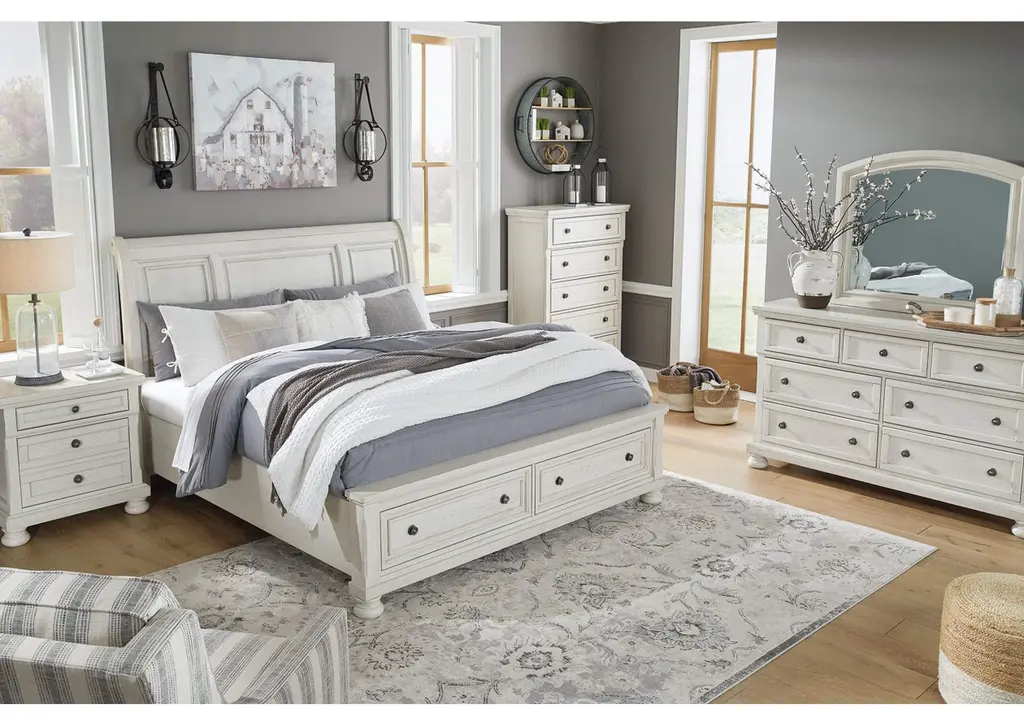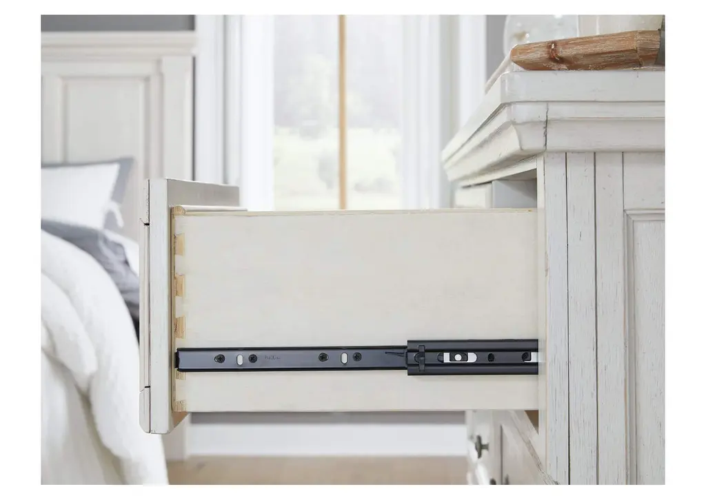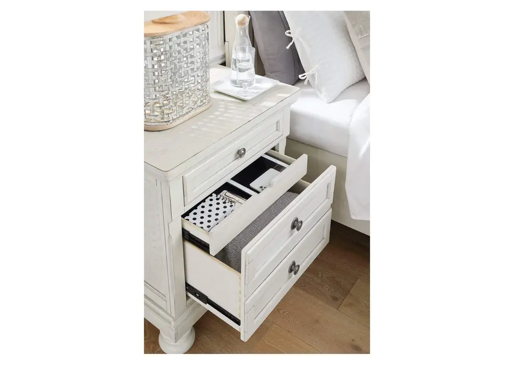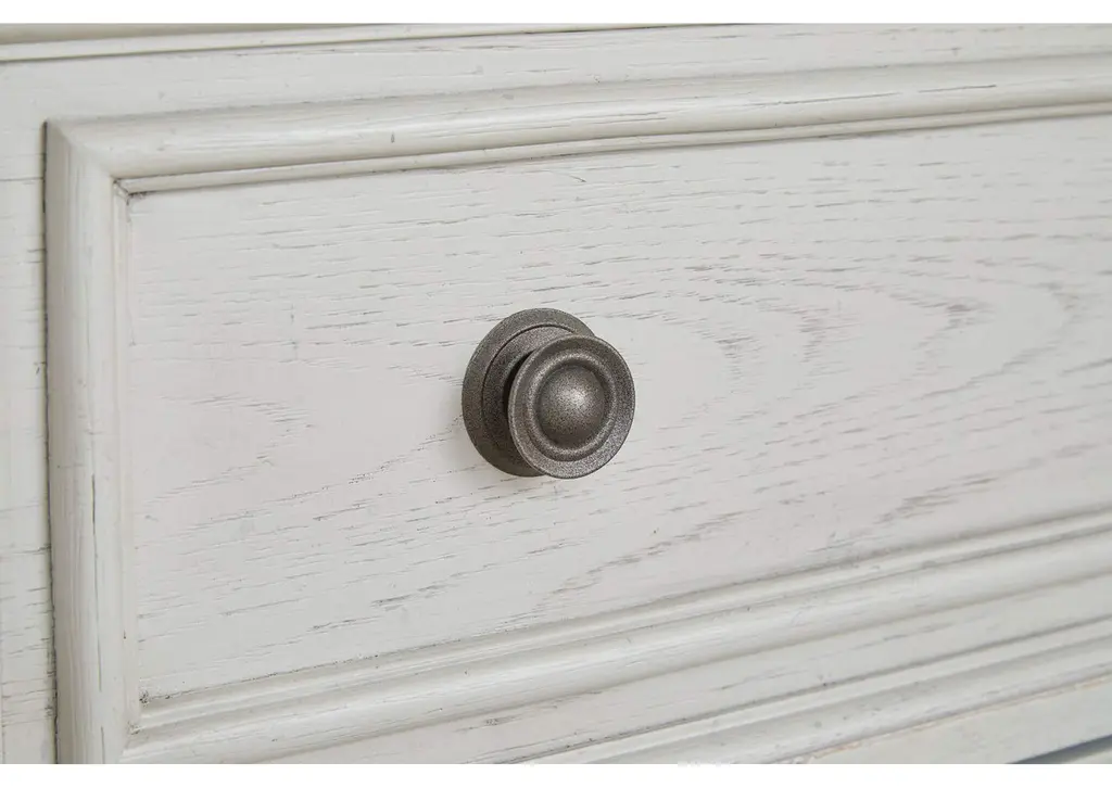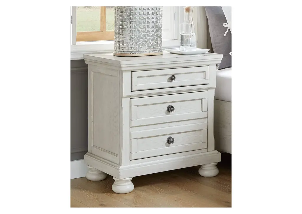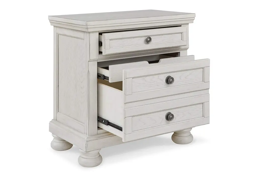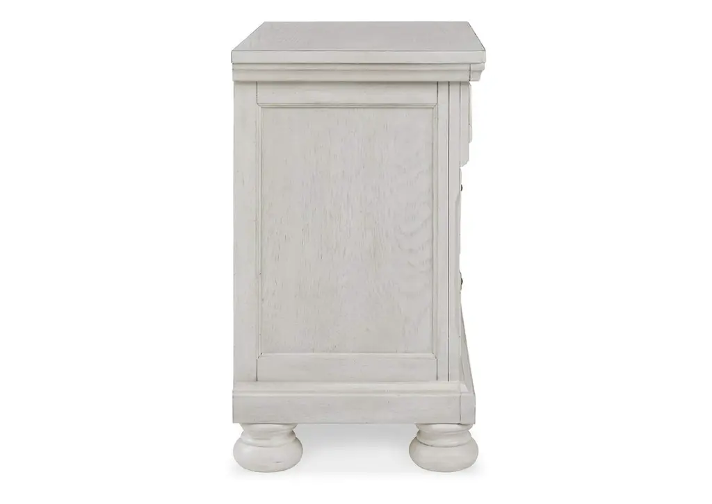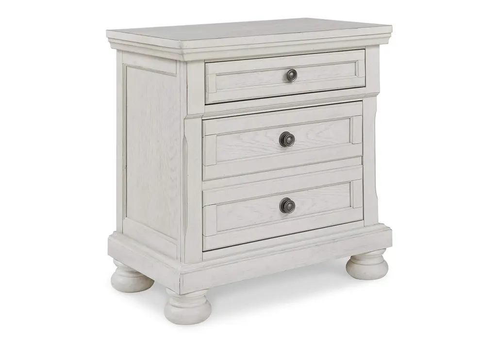 Elegant, timeless furnishings take your bedroom to the next level. Nothing does that better than the Robbinsdale nightstand. The antiqued white finish with a wonderful grain texture radiates sophistication, while the dark bronze-tone hardware adds an ornate touch. Felt finishing in the top drawer and a pull-out tray inside the lower drawer round out the piece for the ultimate tasteful bedroom. Weight 96.000 lbs. (43.2kgs.)