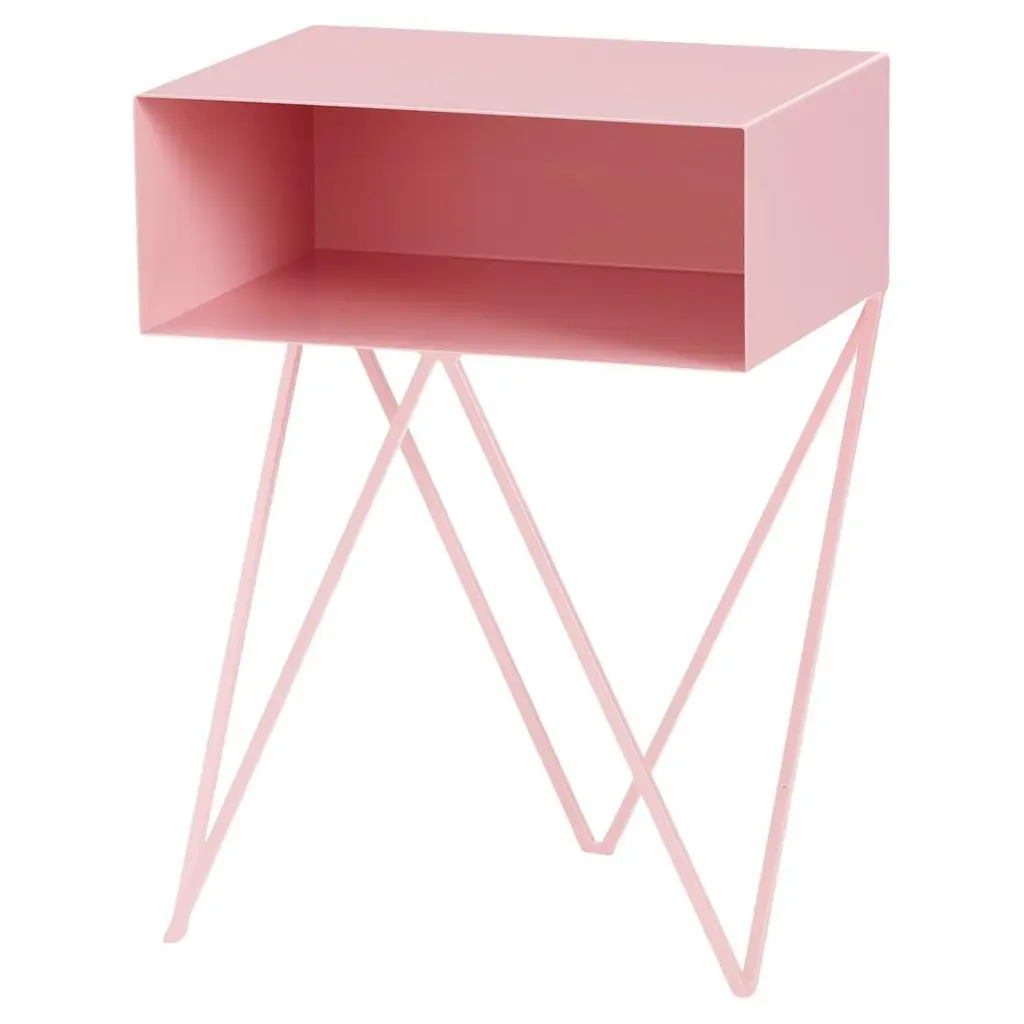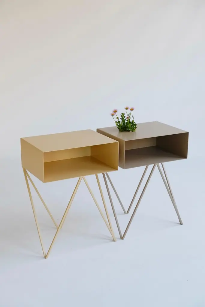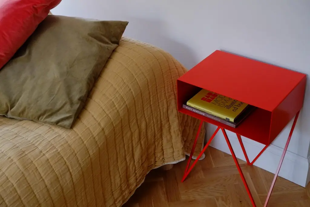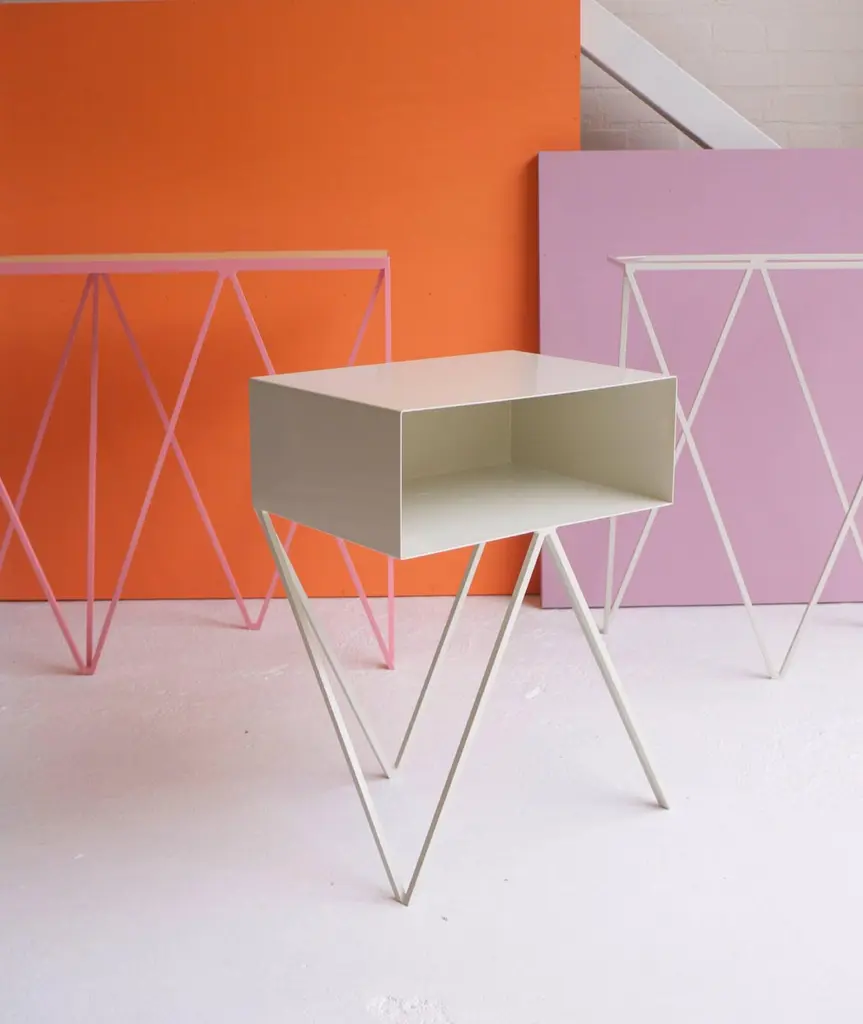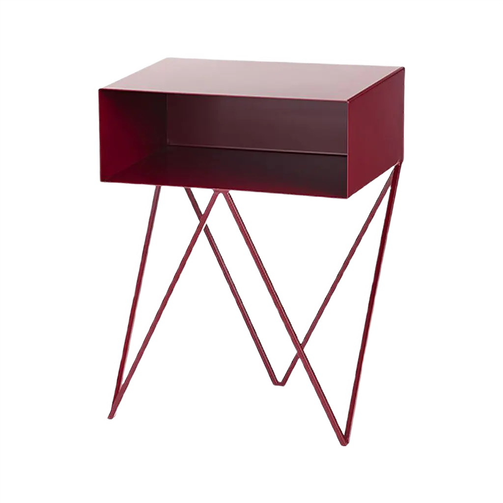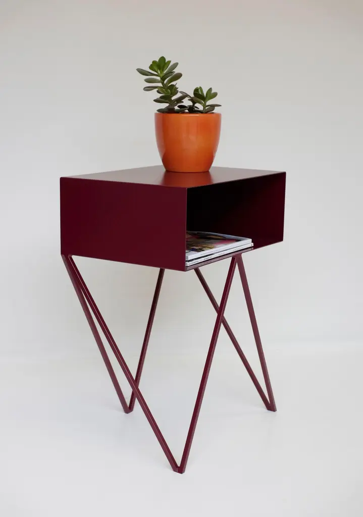 Our all-time best-seller the Robot side table features an open shelf on zig zag legs. A fun and functional design made of solid steel, powder-coated in burgundy or beetroot, as we like to call it. The clean lines look great against period details as well as in modern spaces. Perfect as a bedside table, nightstand or end table for a sofa in the living room.Measurements: approx. 45cm wide, 33cm deep, 60,5cm high. 17cm high inside the shelf.Colour samples available to order from our storefront - LU2894331610202 All &New products are manufactured in Britain in small batches. They have plenty of character as every weld is different. The result is a collection of furniture that celebrates those little imperfections that make objects beautiful.Worldwide delivery is available.Mirka and Jo &New Modern British FurnitureZig-zag-legs/ Registered design. Community design registration number: 002391813-0001.