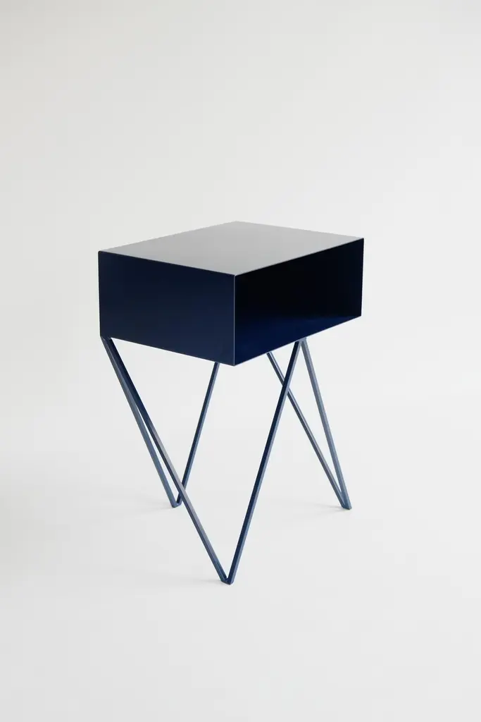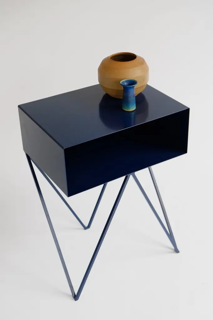 Our all-time best-seller the Robot side table features an open shelf on zig zag legs. A fun and functional design made of solid steel, powder-coated in dark blue. The clean lines look great against period details as well as in modern spaces. Perfect as a bedside table, nightstand or end table for a sofa in the living room.Measurements: approx. 45cm wide, 33cm deep, 60,5cm high. 17cm high inside the shelf.Colour samples available to order from our storefront - LU2894331610202 All &New products are manufactured in Britain in small batches. They have plenty of character as every weld is different. The result is a collection of furniture that celebrates those little imperfections that make objects beautiful.Worldwide delivery is available.Mirka and Jo &New Modern British FurnitureZig-zag-legs/ Registered design. Community design registration number: 002391813-0001.