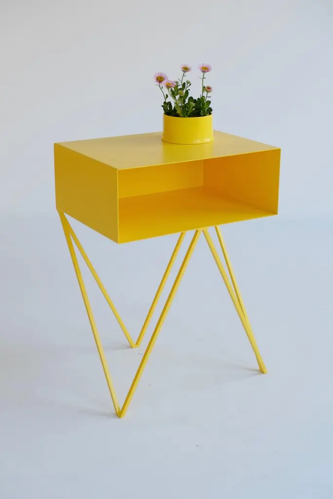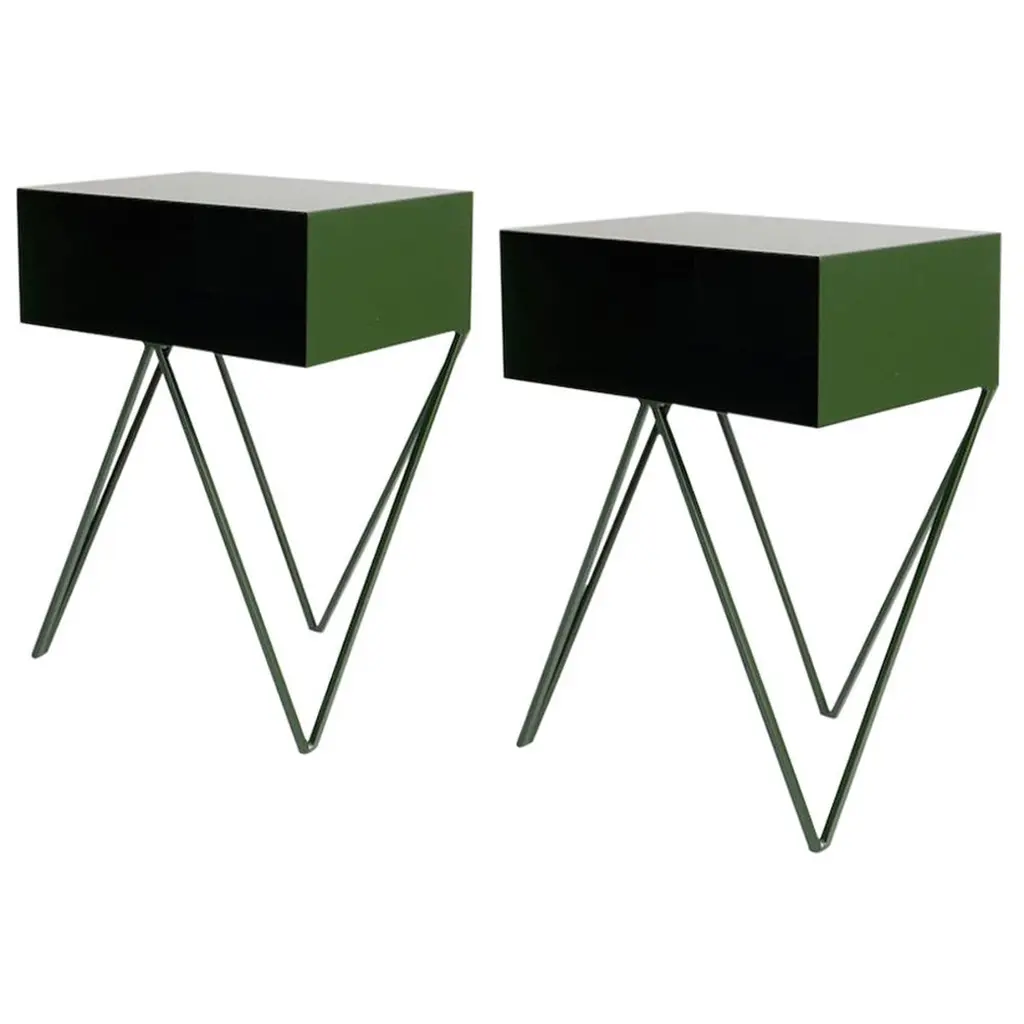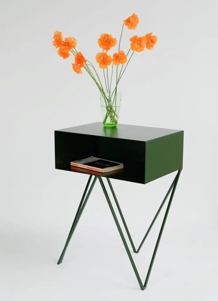 Our all-time best-seller the Robot side table features an open shelf on zig zag legs. A fun and functional design made of solid steel, powder-coated in dark green. The clean lines look great against period details as well as in modern spaces. Perfect as a bedside table, nightstand or end table for a sofa in the living room.Measurements: approx. 45cm wide, 33cm deep, 60,5cm high. 17cm high inside the shelf.Colour samples available to order from our storefront - LU2894331610202 All &New products are manufactured in Britain in small batches. They have plenty of character as every weld is different. The result is a collection of furniture that celebrates those little imperfections that make objects beautiful.Worldwide delivery is available.Mirka and Jo &New Modern British FurnitureZig-zag-legs/ Registered design. Community design registration number: 002391813-0001.