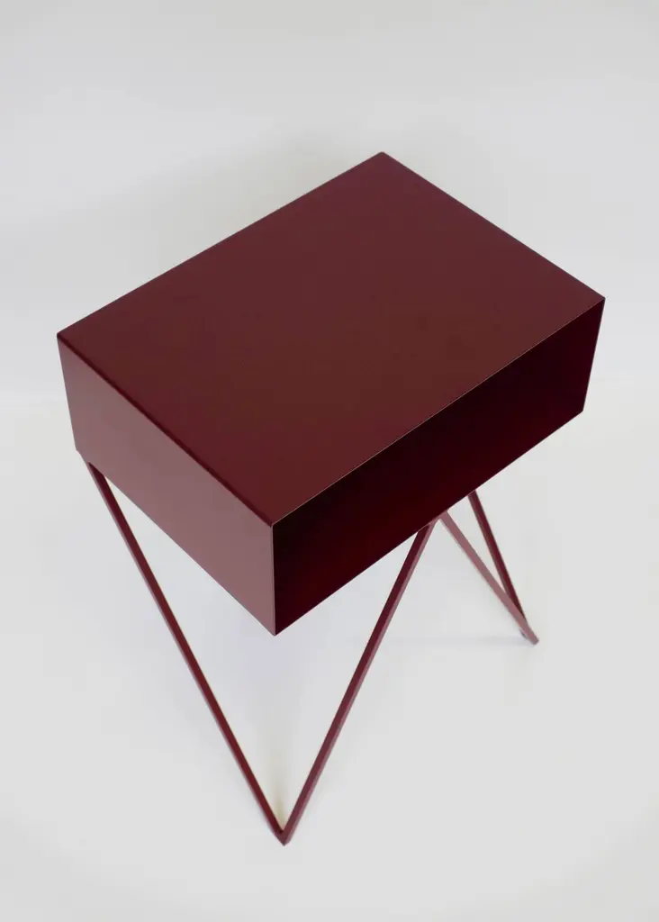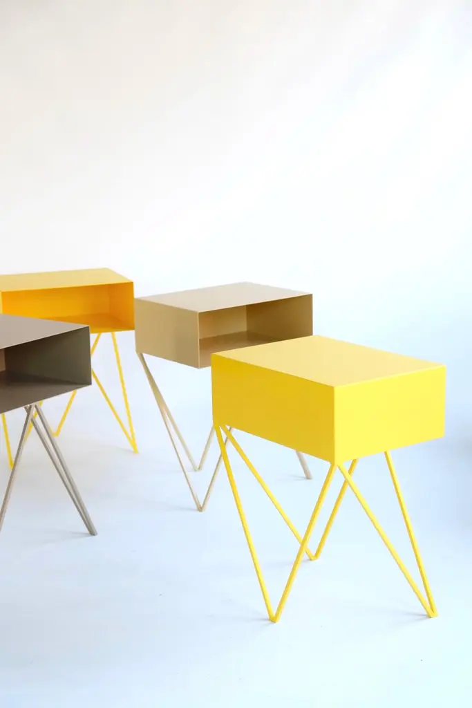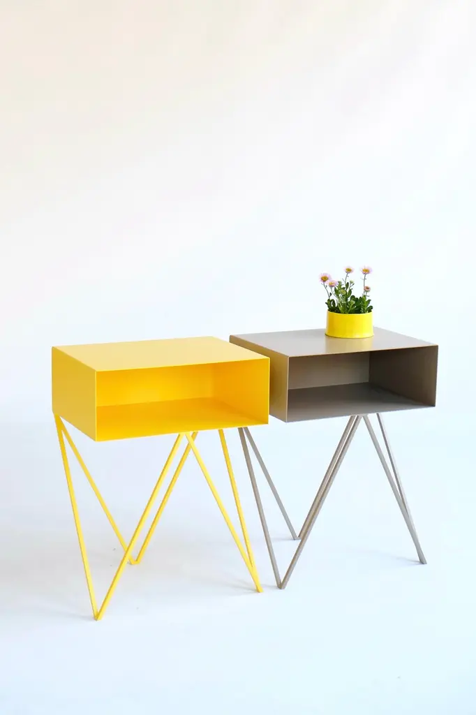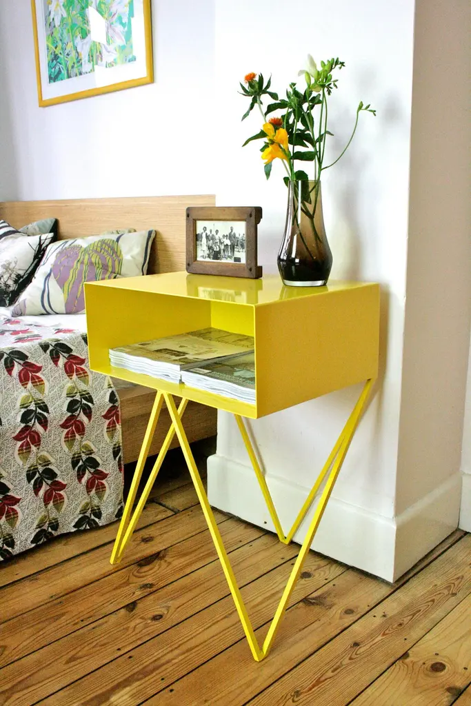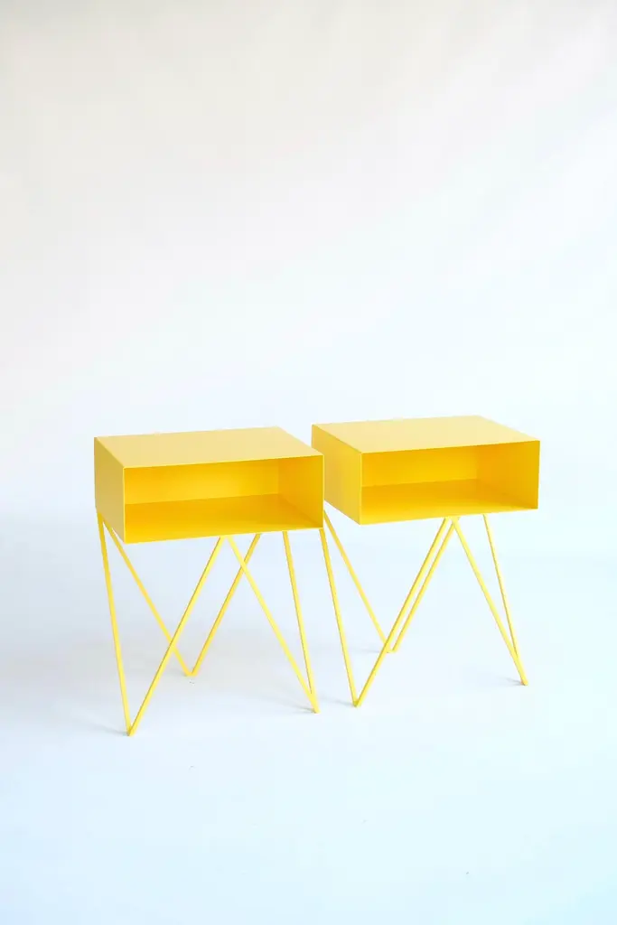 Our all-time best-seller the Robot side table features an open shelf on zig zag legs. A fun and functional design made of solid steel, powder-coated in yellow. The clean lines look great against period details as well as in modern spaces. Perfect as a bedside table, nightstand, or end table for a sofa in the living room.Measurements: approx. 45cm wide, 33cm deep, 60,5cm high. 17cm high inside the shelf.Colour samples available to order from our storefront - LU2894331610202 All &New products are manufactured in Britain in small batches. They have plenty of character as every weld is different. The result is a collection of furniture that celebrates those little imperfections that make objects beautiful.Worldwide delivery is available.Mirka and Jo &New Modern British FurnitureZig-zag-legs/ Registered design. Community design registration number: 002391813-0001.