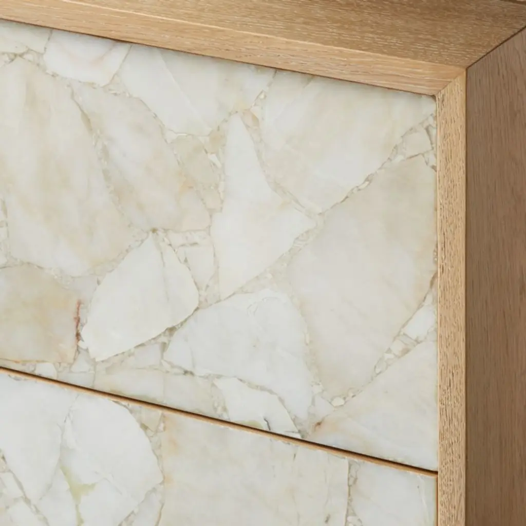 Jannis Ellenberger's agate nightstand highlights an organic mix of materials. Solid oak certified sustainable by the Forest Stewardship Council frames the piece, while crushed agate fronts two push-to-open drawers for a unique finish that's rich with tonal variation. CB2 exclusive.