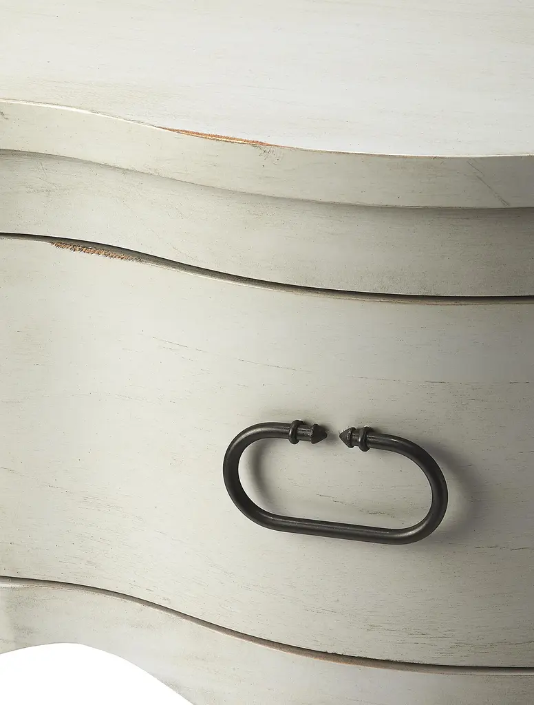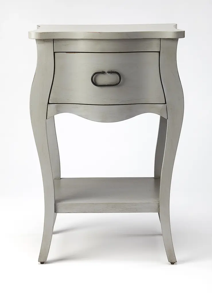 Crafted from mango Wood solids and Wood products in a neutral finish, this nightstand is perfect for stowing bedside essentials. This lovely nightstand showcases a single drawer with iron hardware, a scalloped apron and lower display shelf. Durably Constructed With: Mango Wood Solids, MDF, Mindi Veneer, Iron Product Construction Features: Metal Slide,Finish Distressing Product Assembled Measurement & Weight: 28.0" H x 18.0" W x 14.25" D -- 20.0 lbs. 200 lbs. Suggested weight capacity Item Arrives: Assembled Wood, like all natural materials, has inherent disparities in color and grain pattern. Variations in shade and markings are normal and can be expected with the natural materials used in the construction of this product. Photo may slightly differ from actual item in terms of color/finish due to the lighting during photo shoot or the monitor's display.