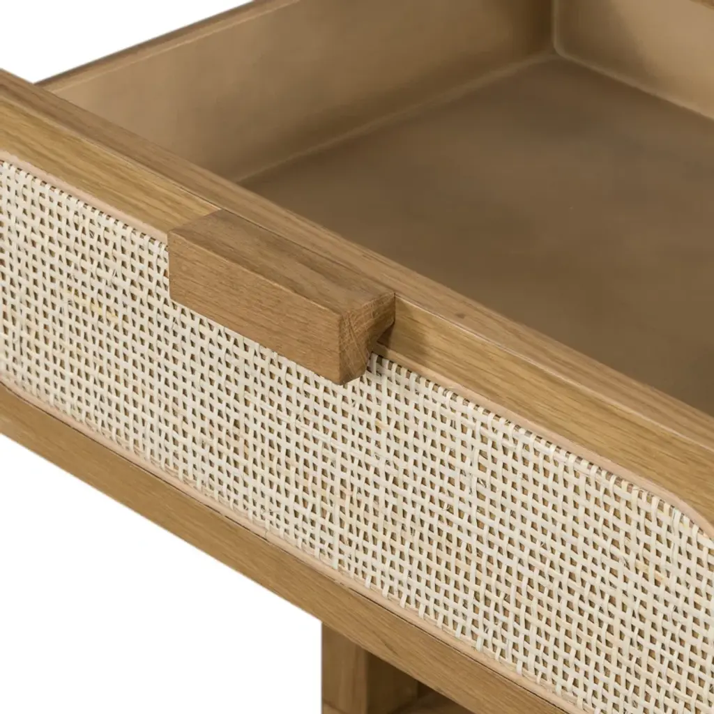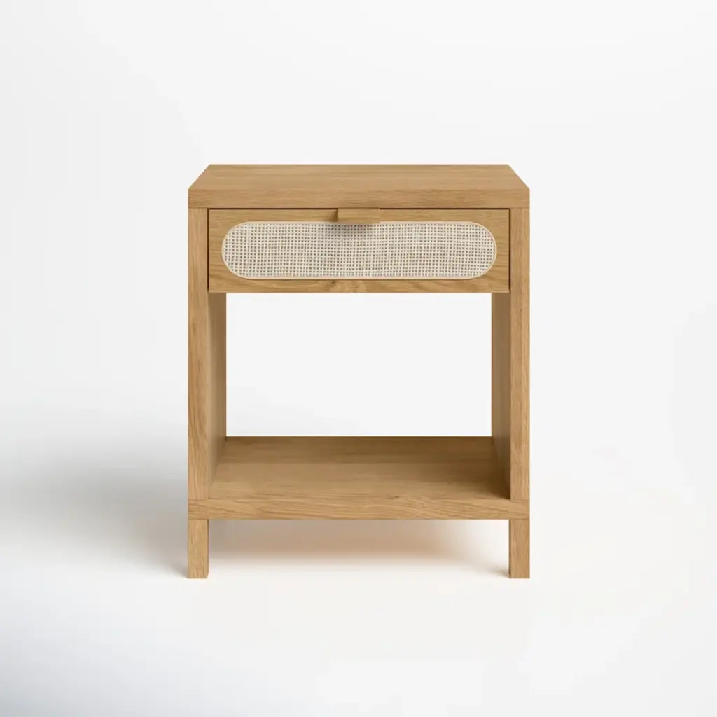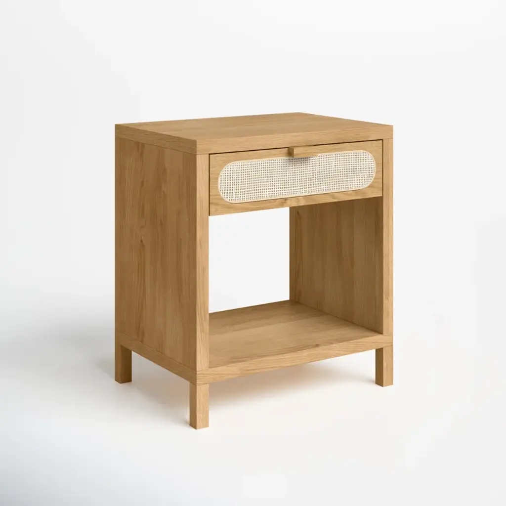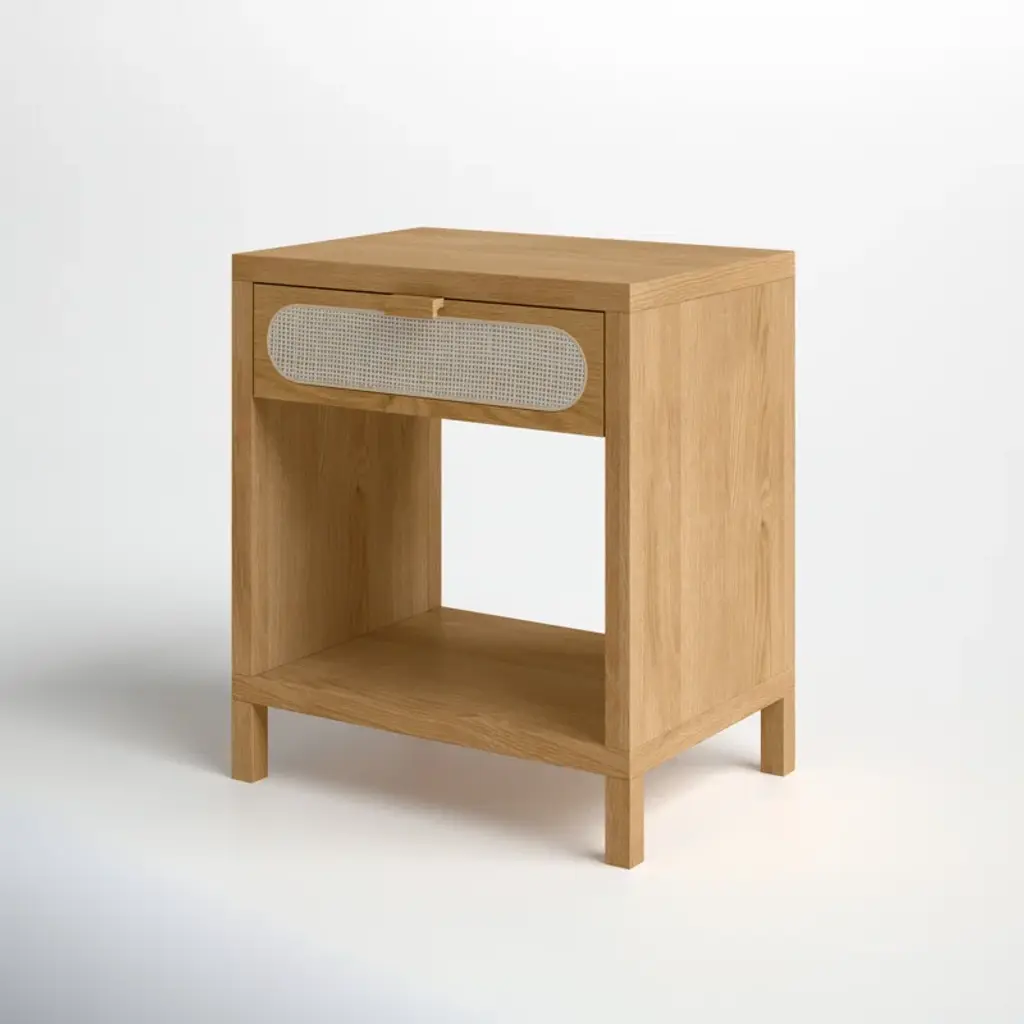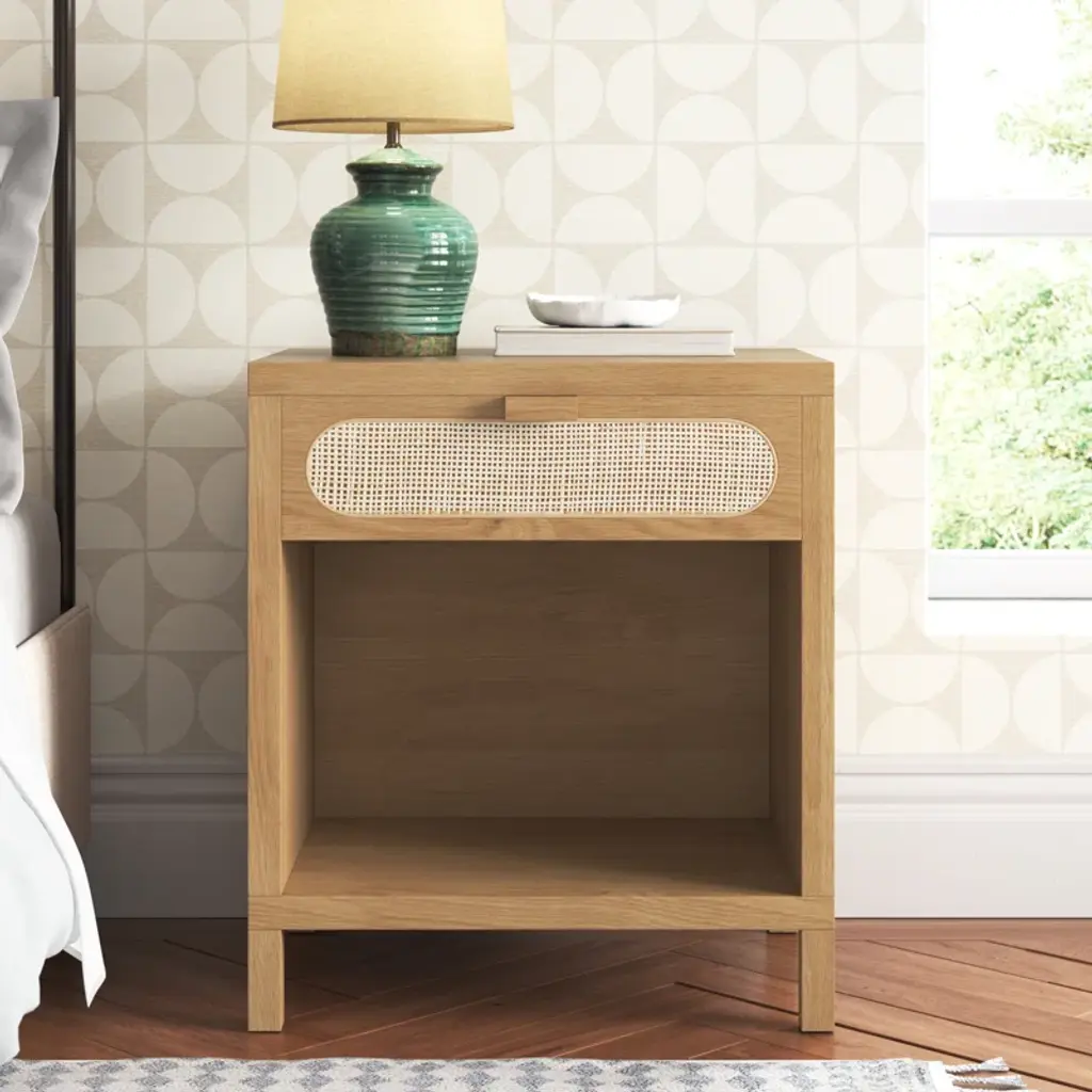 This 1-drawer nightstand has a soft, neutral look with lasting, on-trend modern details. It's made from solid and engineered wood with a natural honey oak finish. The single spacious drawer has a pill-shaped cane front for a subtle mixed-material element we love. The drawer boasts dovetail joinery, plus an eye-catching natural wood grain color variation throughout. We also love the airy, open shelf, which provides that must-needed, easily accessible storage for all your nighttime essentials. Plus, this nightstand arrives fully assembled for fuss-free installation.