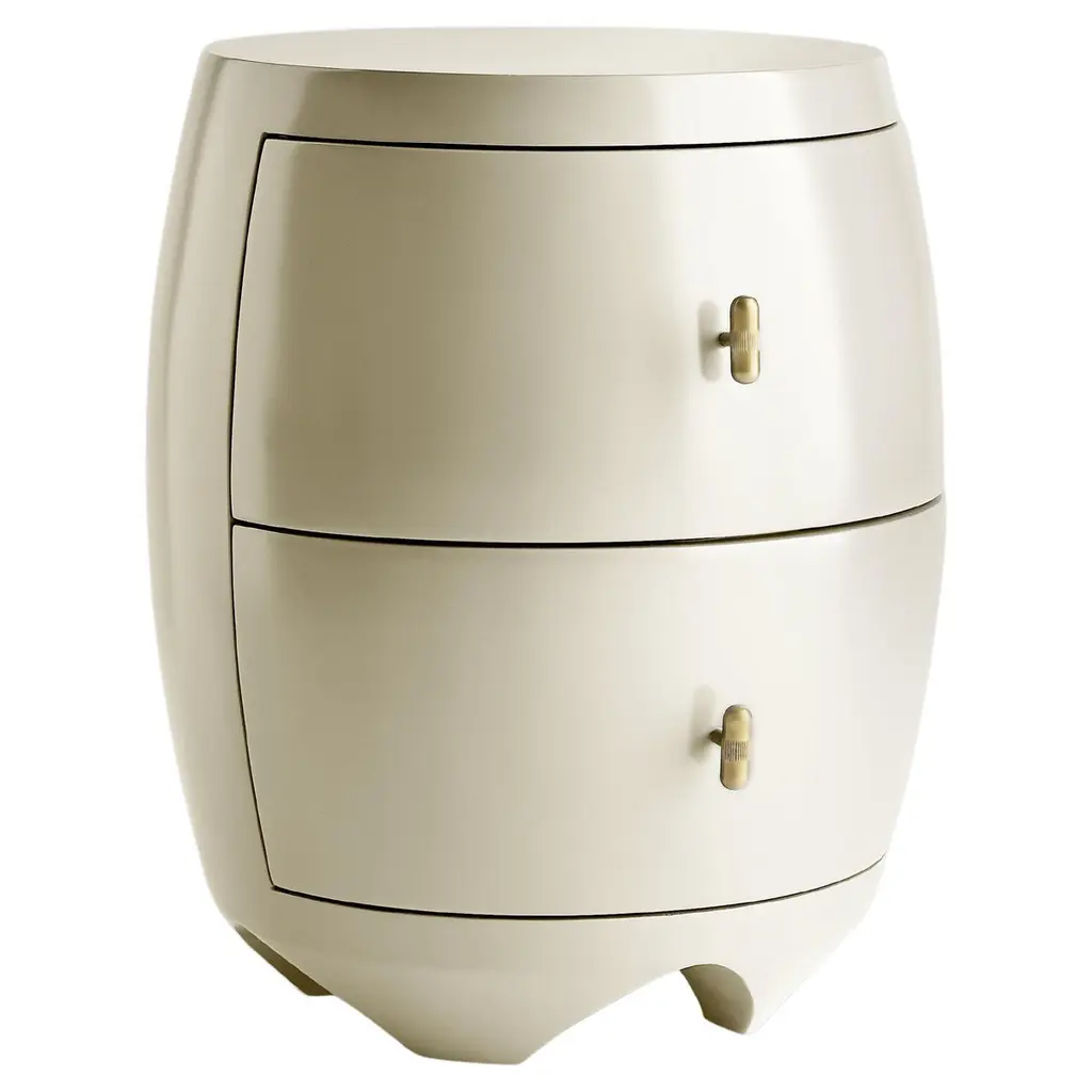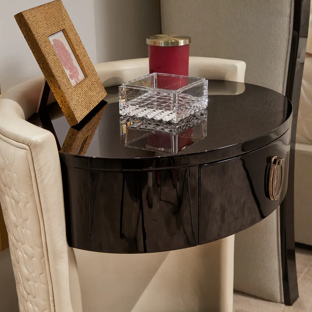 Designed to be seen from every angle, the Romantic Night Stand is a truly original style. On an oval base, the night stand is made from wood with a gorgeous lacquered finish. The table is then upholstered in leather and given a charming quilted finish. The night stand comes from a small collection of bedroom furnishings.