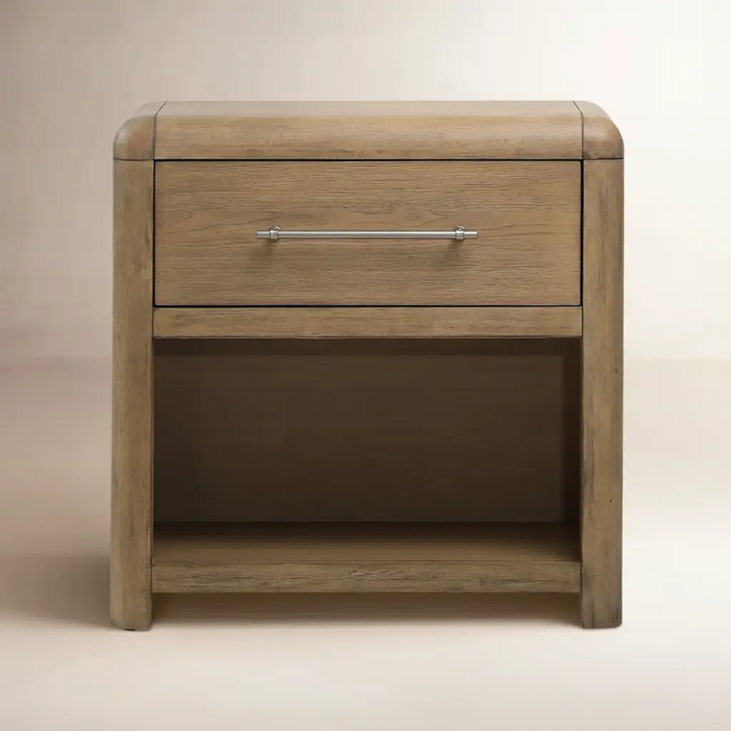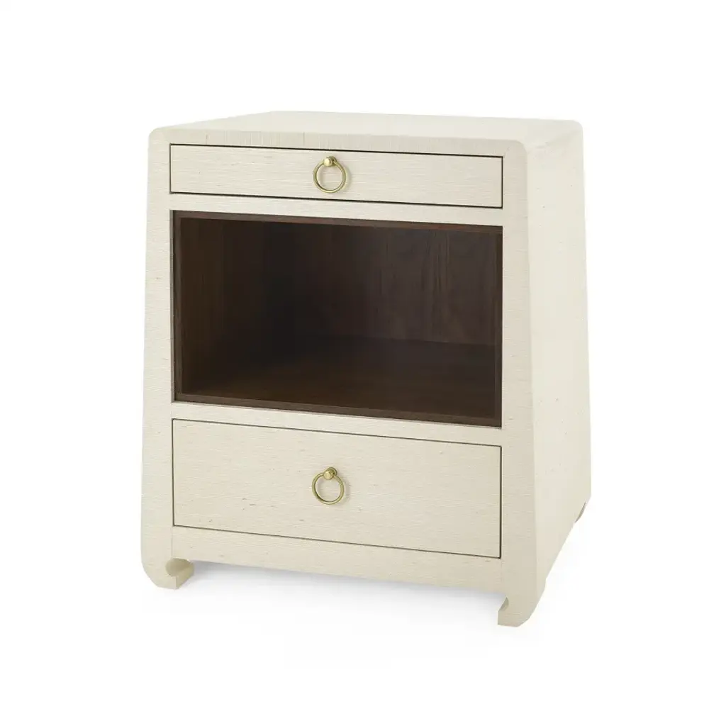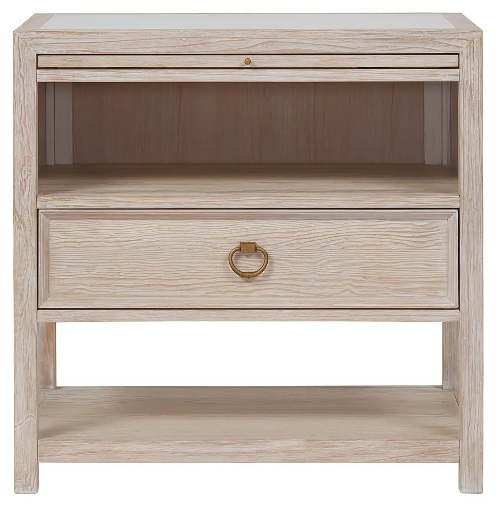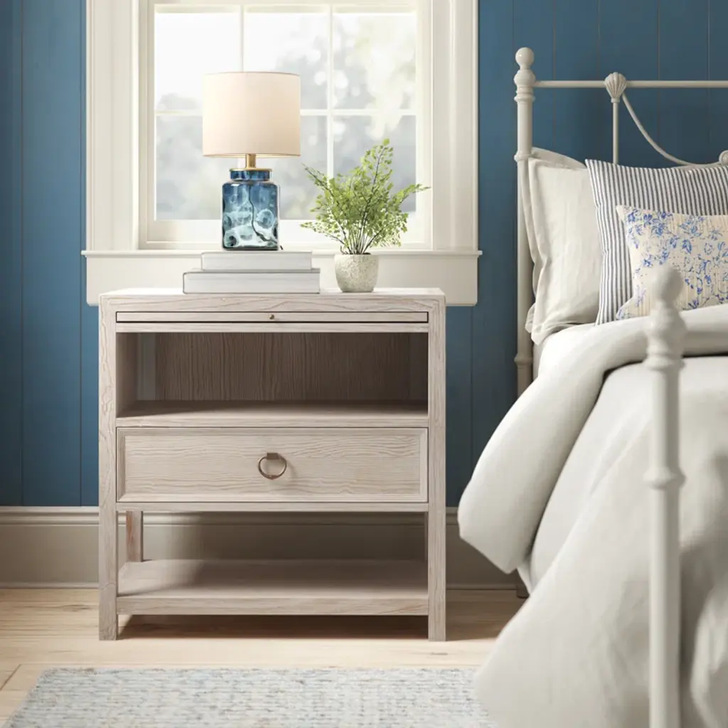 The perfect bedside companion, the getaway drawer nightstand marries the best of function and coastal style with open-air storage, a spacious drawer, smooth stone inset top, pull-out shelf and gold ring pull hardware