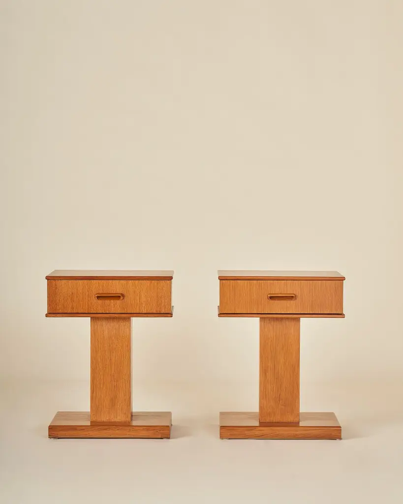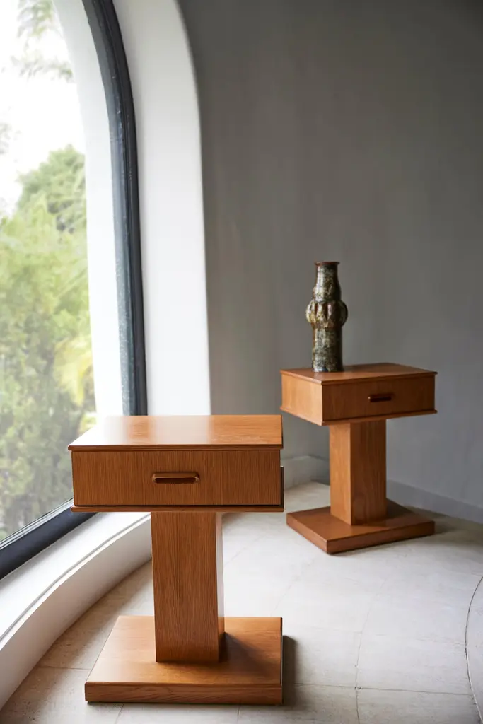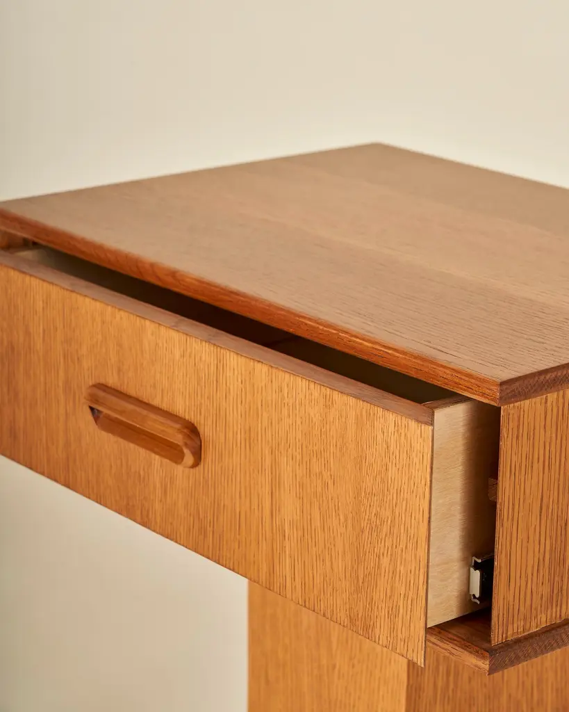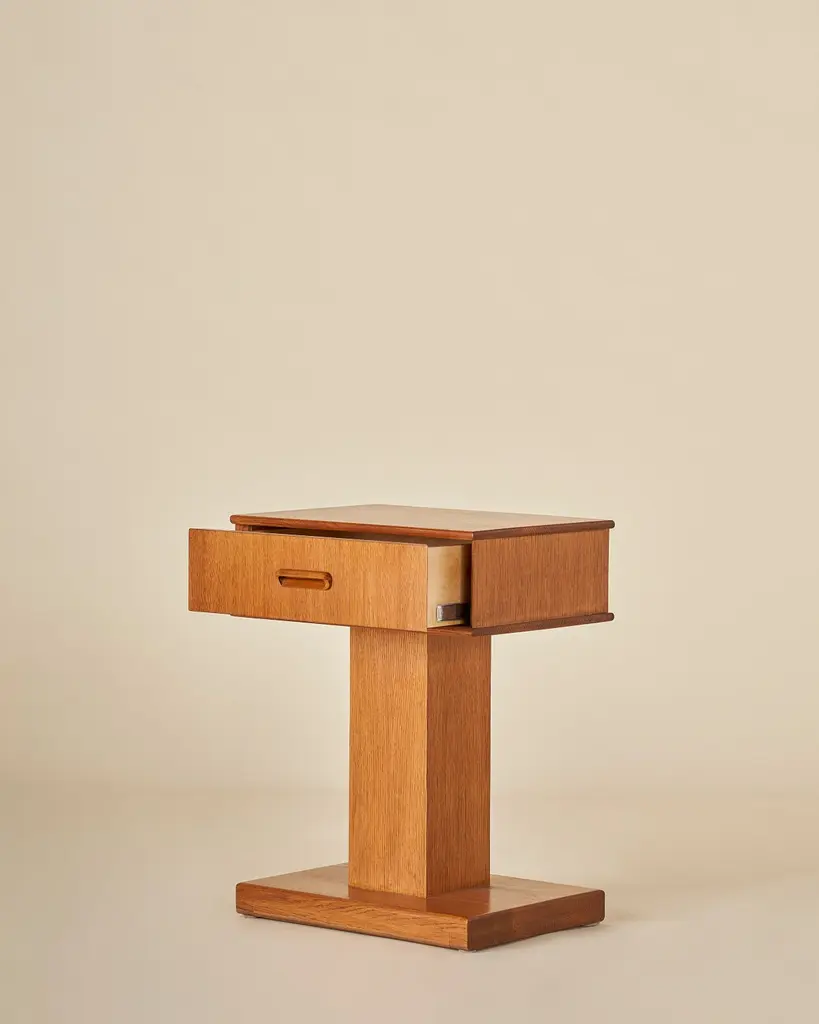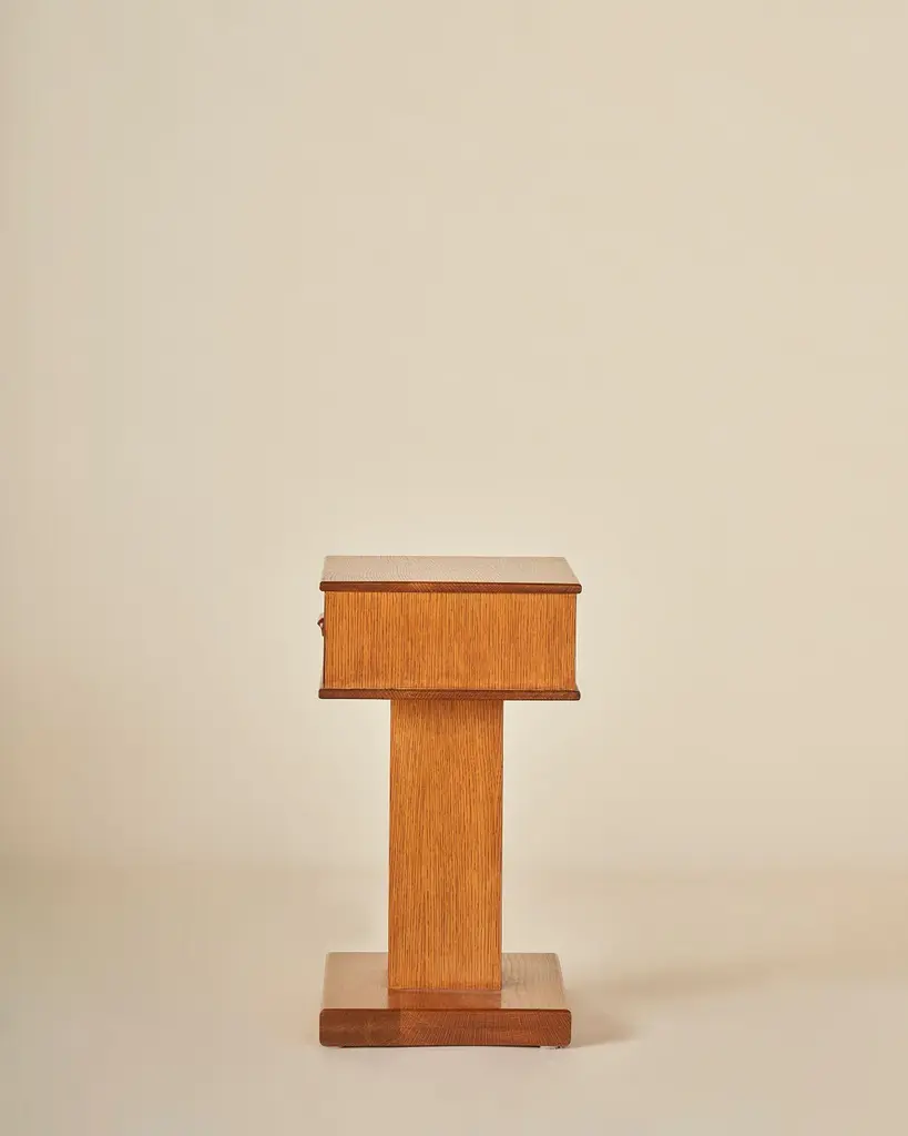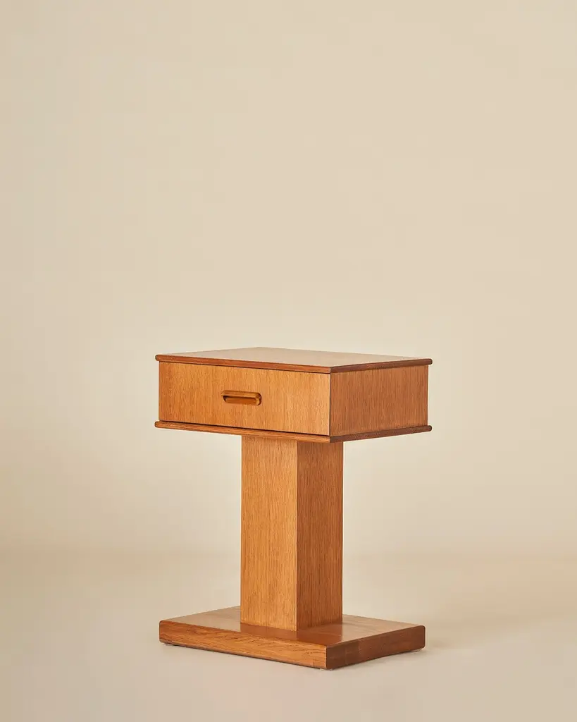 American White Oak pedestal nightstand or end table with a single drawer and integrated carved wood pull. Our timeless design is shown in Honeyed Oak. Our collection pays homage to the everlasting idea of home, a place that is alive as its own character in the story. Taking a reductionist approach to tradition, each piece pairs effortless silhouettes with honest materials and builds on the past with balance and grace. Good design ages well and takes on a life of its own.