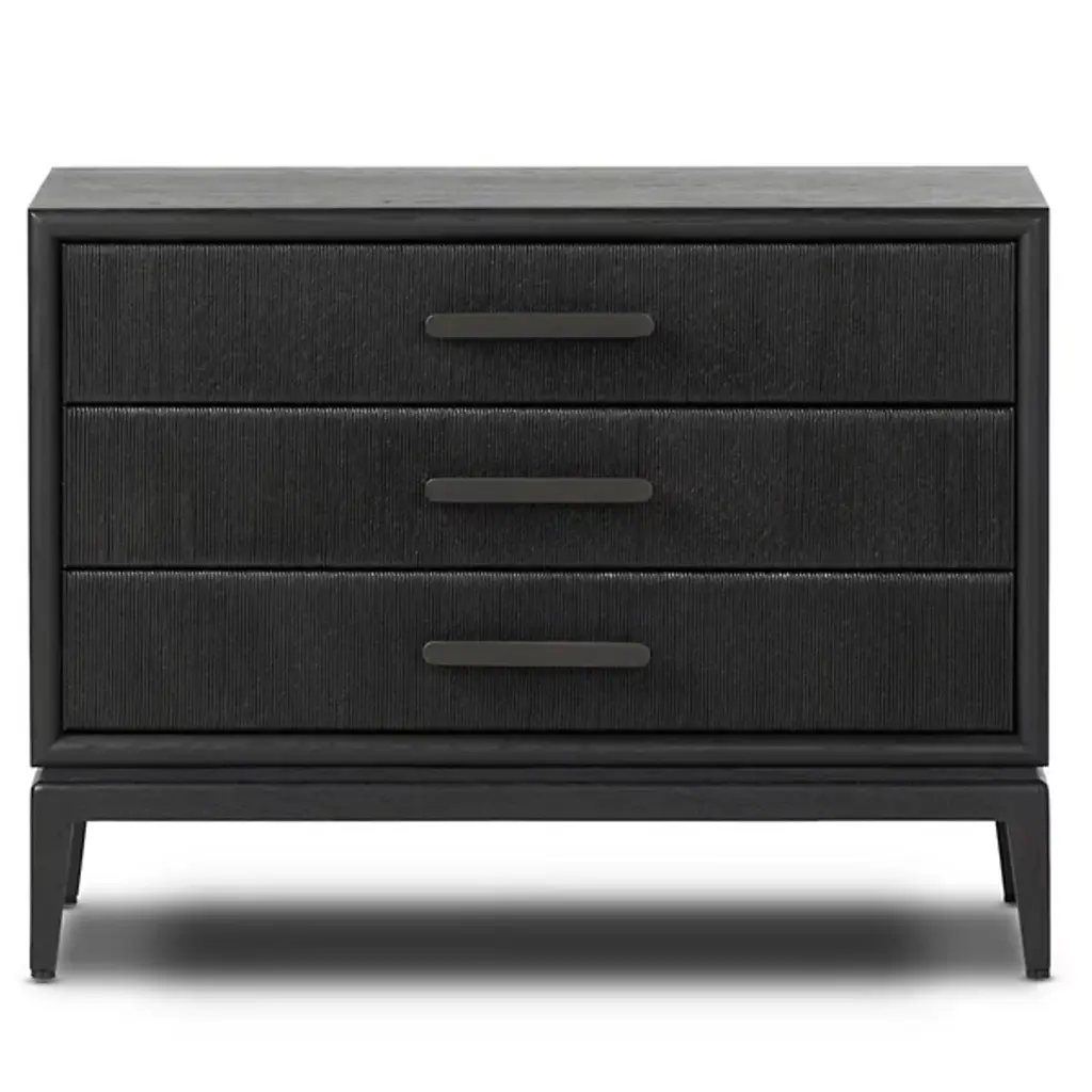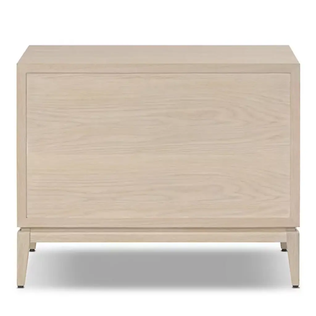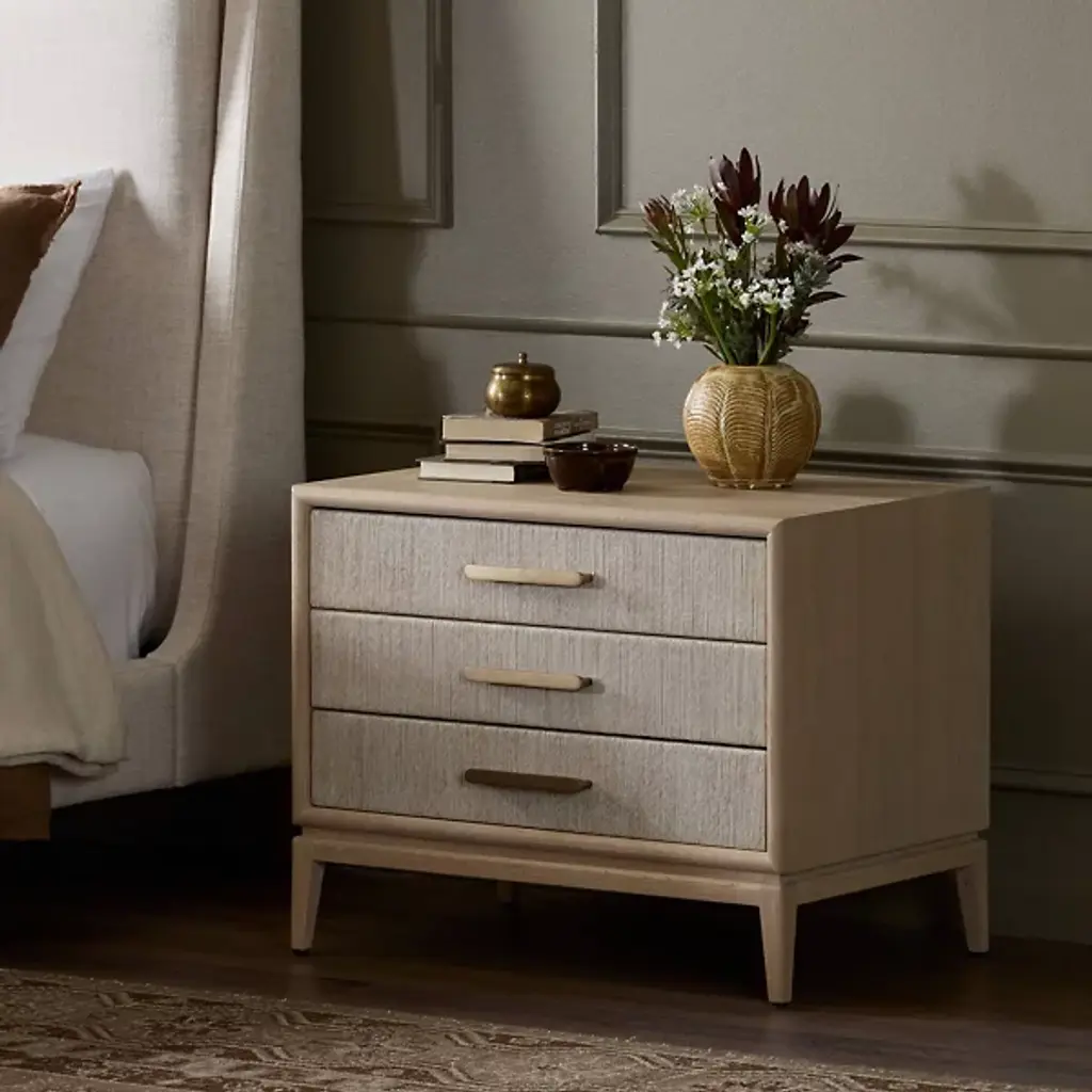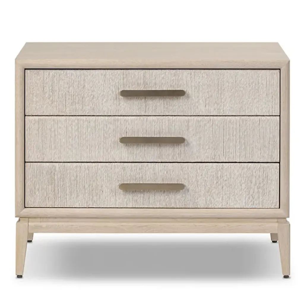 The Rosenell Closed Nightstand from Four Hands takes bedside storage to new heights with woven paper cord drawer fronts that create subtle dimension. Three spacious drawers provide ample space for nighttime essentials, while the smooth top surface offers room for your reading lamp and morning coffee. Built to support 100 pounds, the oak construction ensures lasting durability. The angled legs give the piece a sense of lightness while maintaining stability. The Nordic-inspired design makes this nightstand a useful yet refined addition to your bedroom setup.