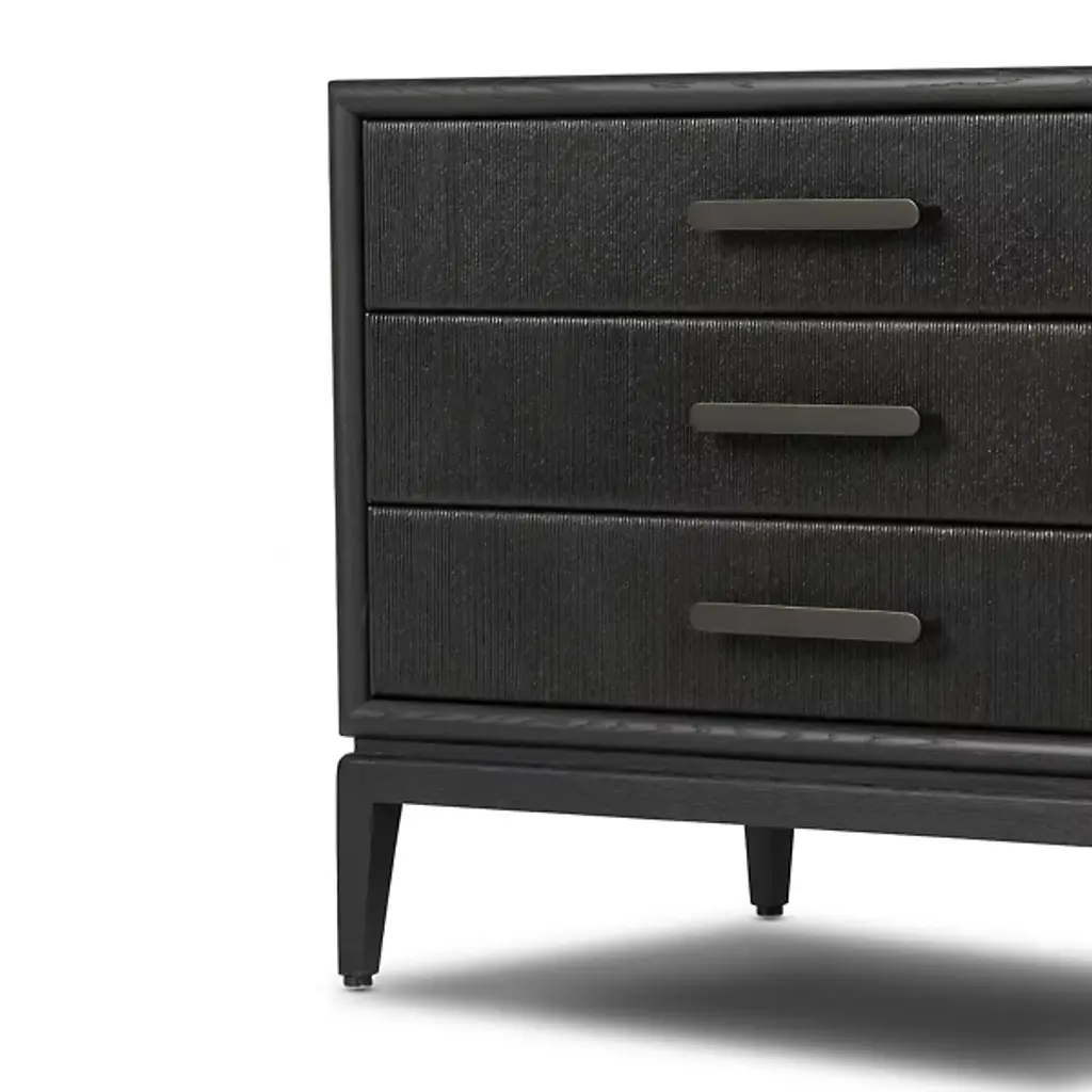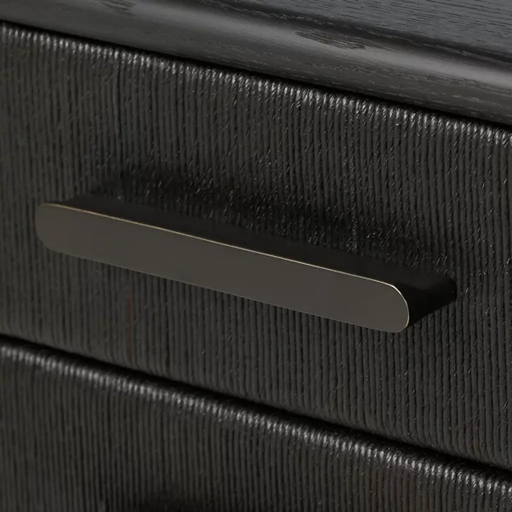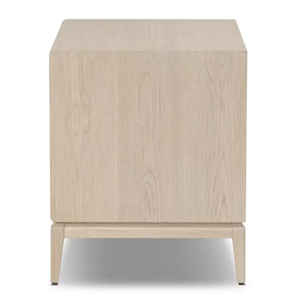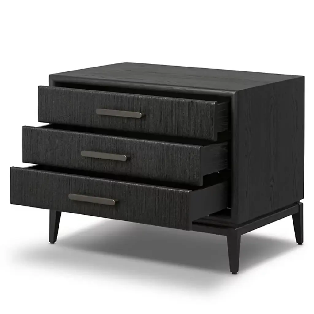 The Rosenell Closed Nightstand from Four Hands takes bedside storage to new heights with woven paper cord drawer fronts that create subtle dimension. Three spacious drawers provide ample space for nighttime essentials, while the smooth top surface offers room for your reading lamp and morning coffee. Built to support 100 pounds, the oak construction ensures lasting durability. The angled legs give the piece a sense of lightness while maintaining stability. The Nordic-inspired design makes this nightstand a useful yet refined addition to your bedroom setup.