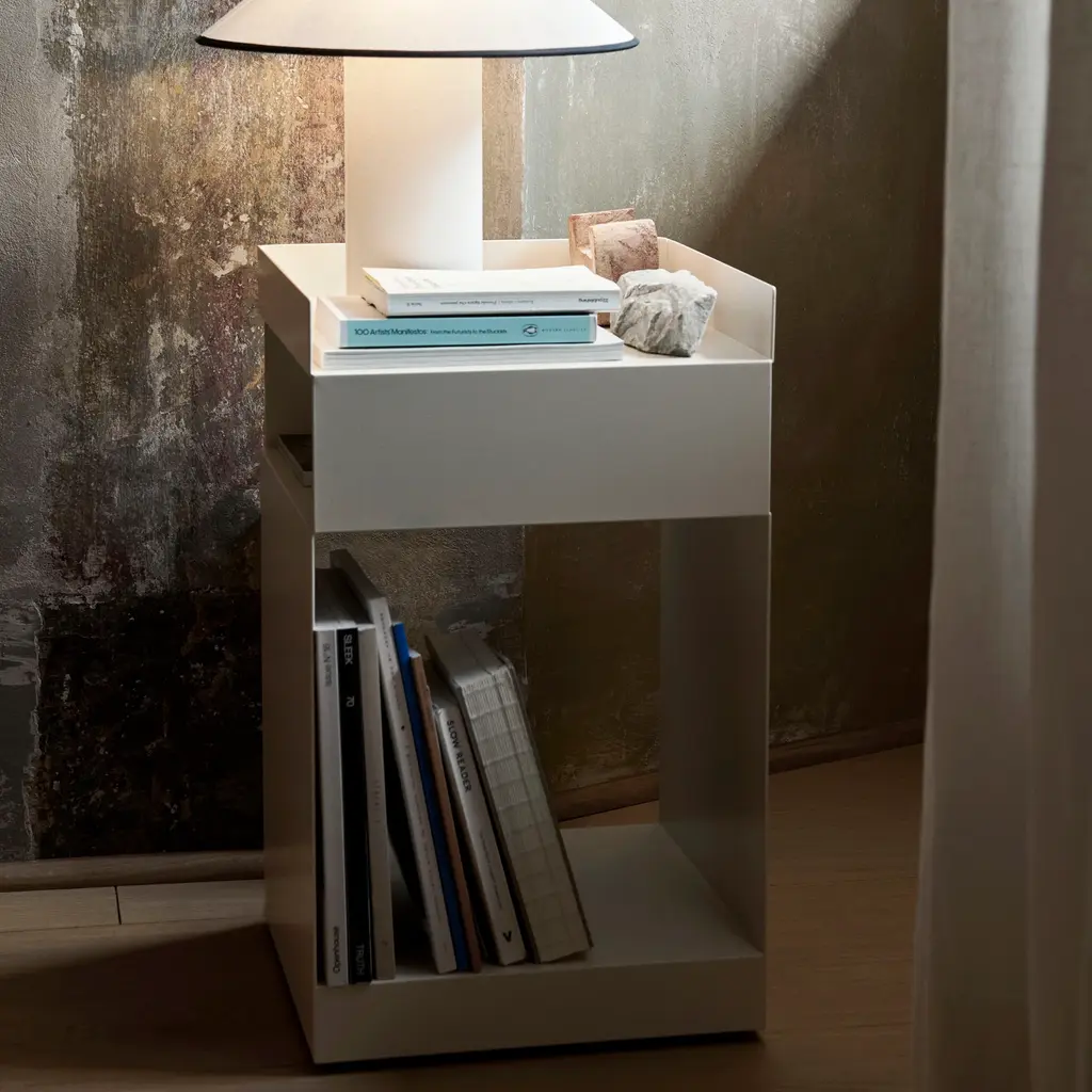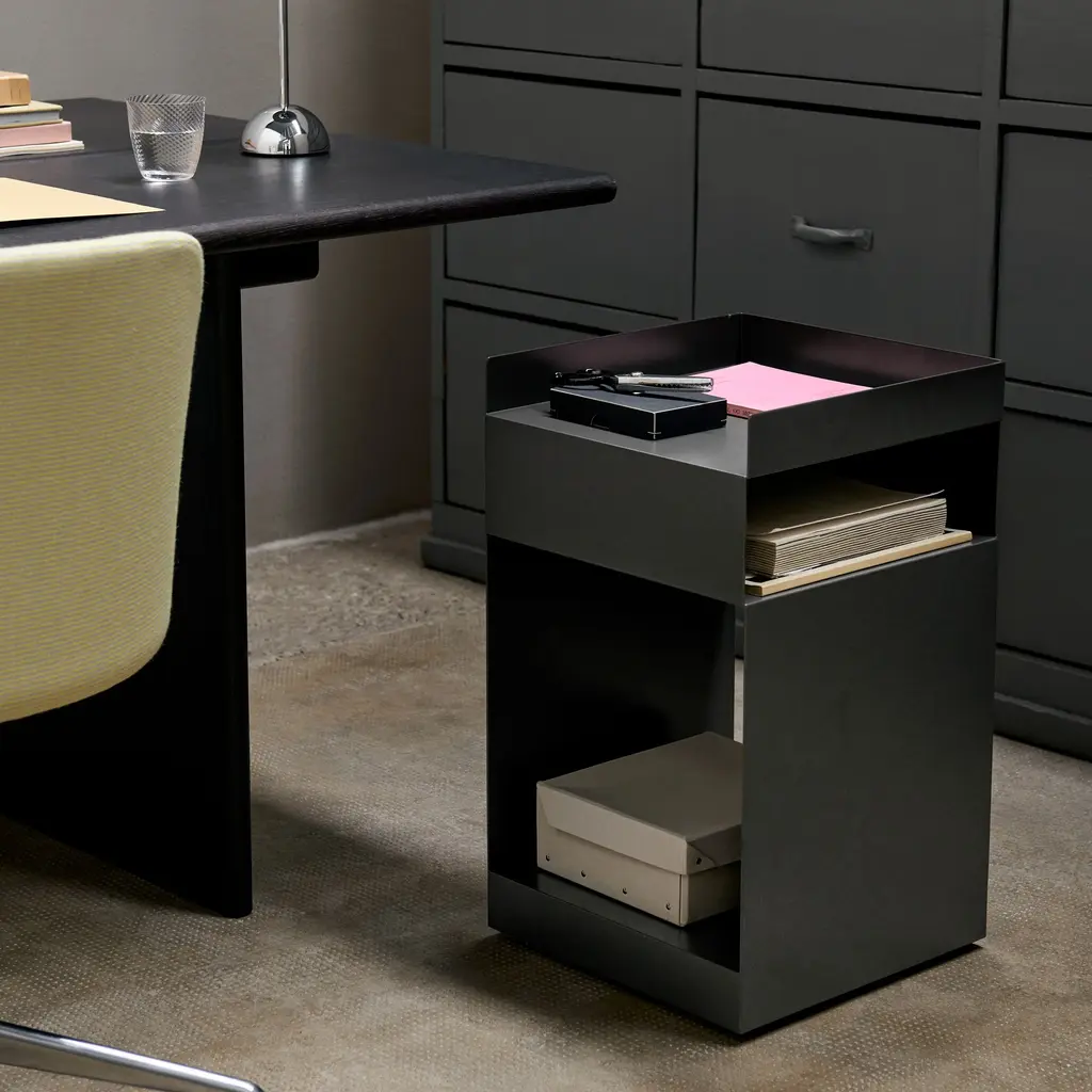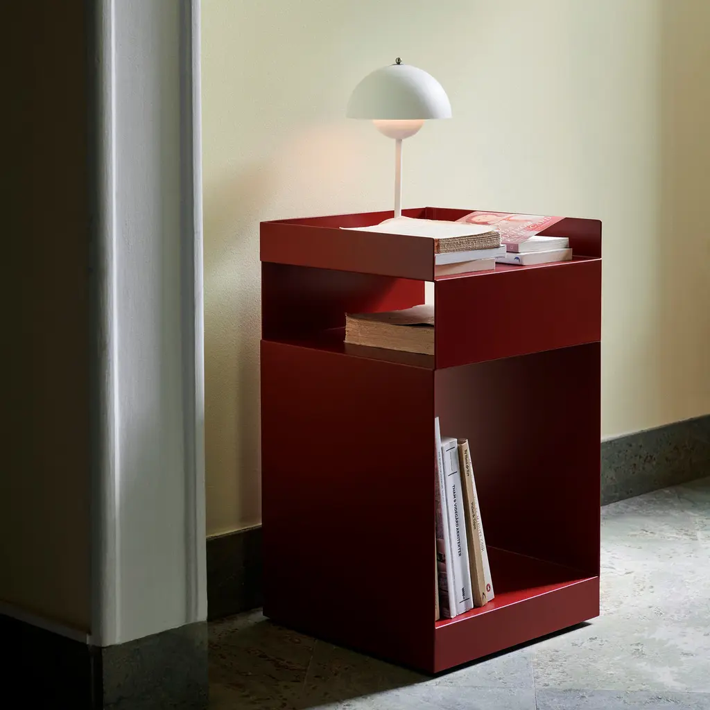 Concealed wheels allow for effortless migrating from corner to corner of a commercial or residential area with this multipurpose table-trolley. Space Copenhagen designers Signe Bindslev Henriksen and Peter Bundgaard Rützou bend with the times and the need for versatility and storage, making Rotate as ideal as a bedside table as it is next to a bathtub, or next to a sofa or desk. A single sheet of steel metal is cut into 2 pieces and bent to shape, then welded and powder coated for long-term durability.