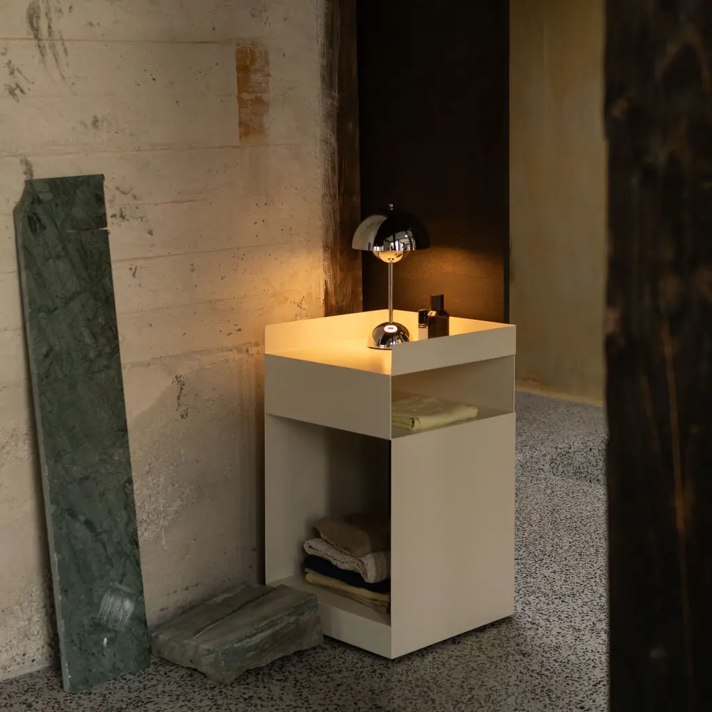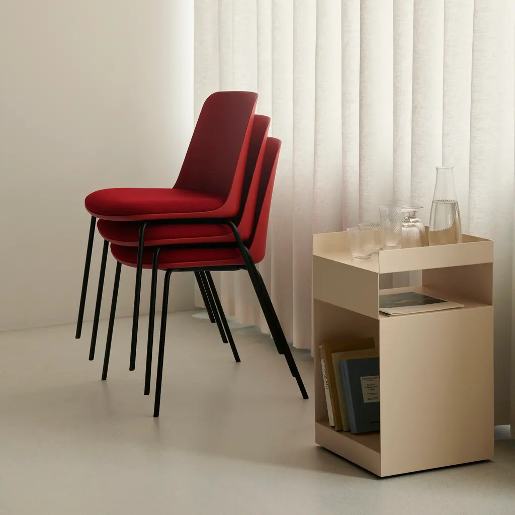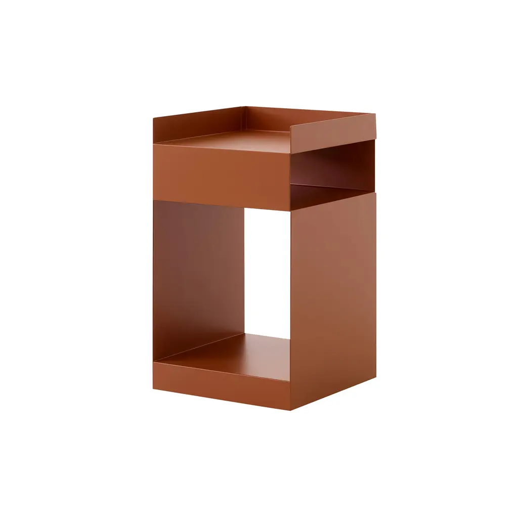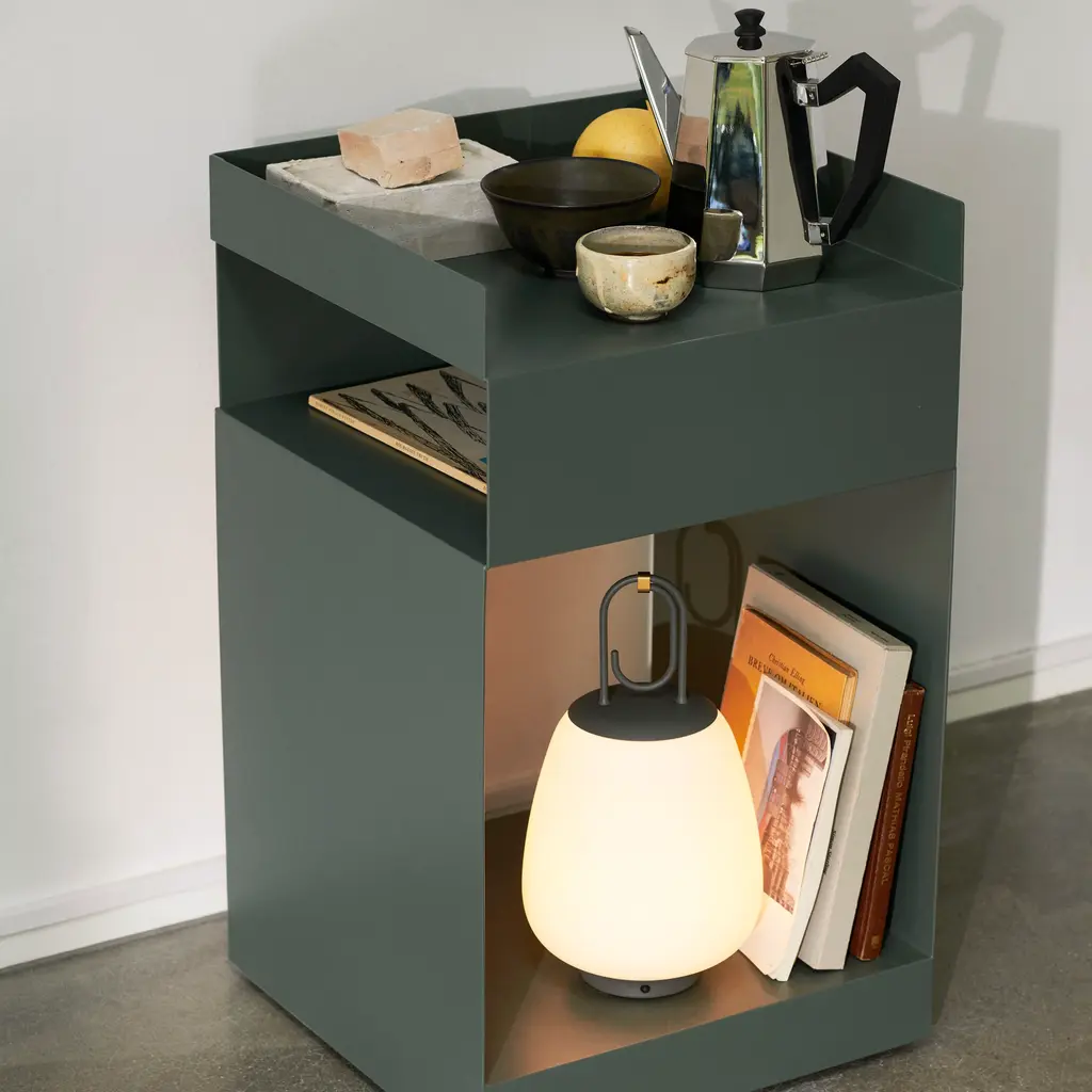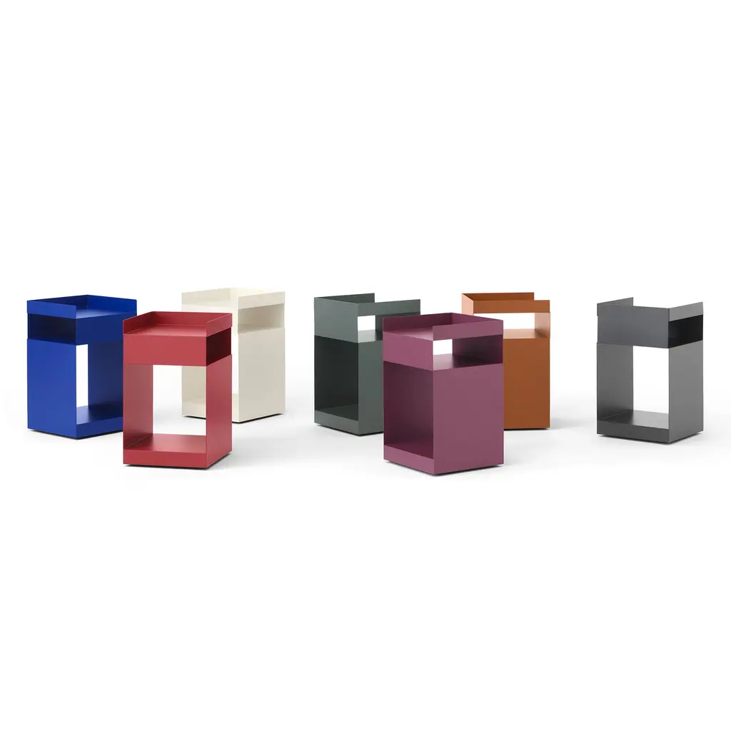 Concealed wheels allow for effortless migrating from corner to corner of a commercial or residential area with this multipurpose table-trolley. Space Copenhagen designers Signe Bindslev Henriksen and Peter Bundgaard Rützou bend with the times and the need for versatility and storage, making Rotate as ideal as a bedside table as it is next to a bathtub, or next to a sofa or desk. A single sheet of steel metal is cut into 2 pieces and bent to shape, then welded and powder coated for long-term durability.