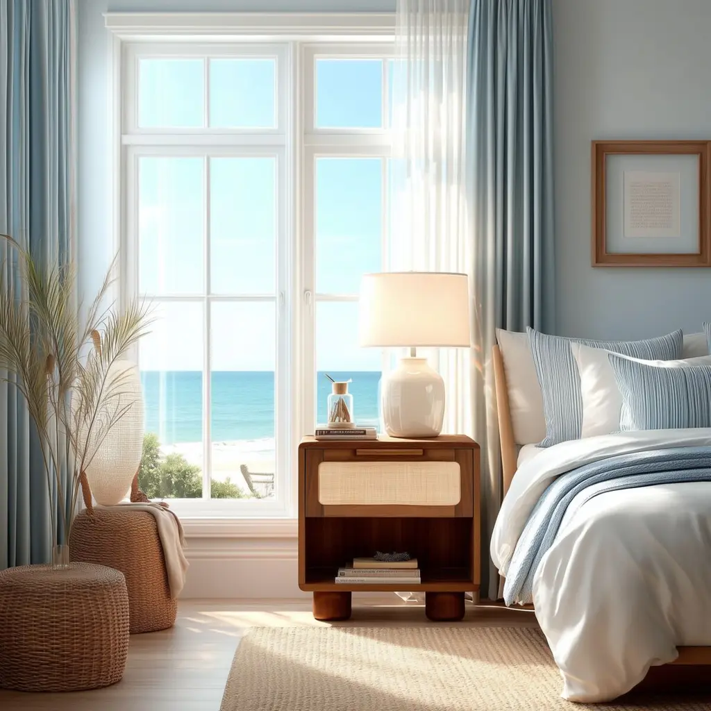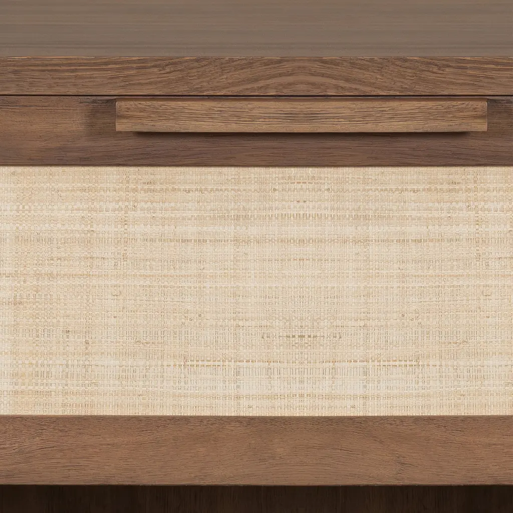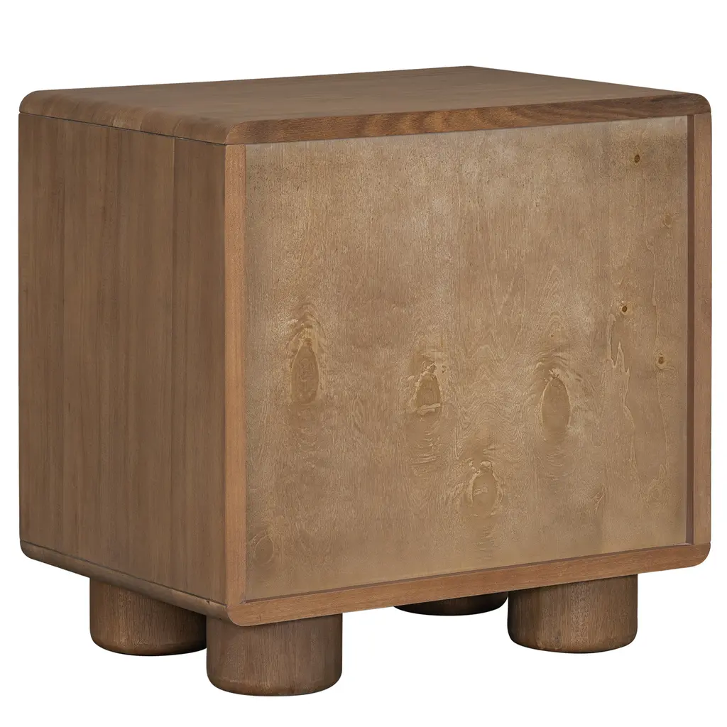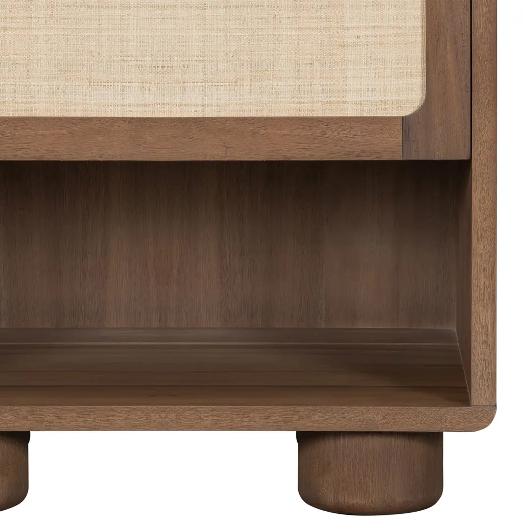 The beautifully rounded cylindrical legs support the gently curved square Rovinj nightstand. A rattan detail on the functional pull-out drawer adds a natural touch while maintaining a sleek, organic feel.