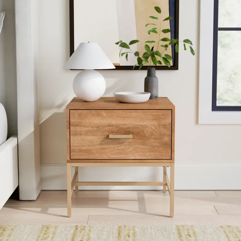 Our clean-lined, compact nightstand combines kiln-dried solid mango wood with a powder-coated metal frame for a dynamic look we love. The single drawer offers storage for nighttime essentials – keeping the top surface crisp, clutter-free, and available. Consider a pair for either side of your bed for a cohesive look in your bedroom.