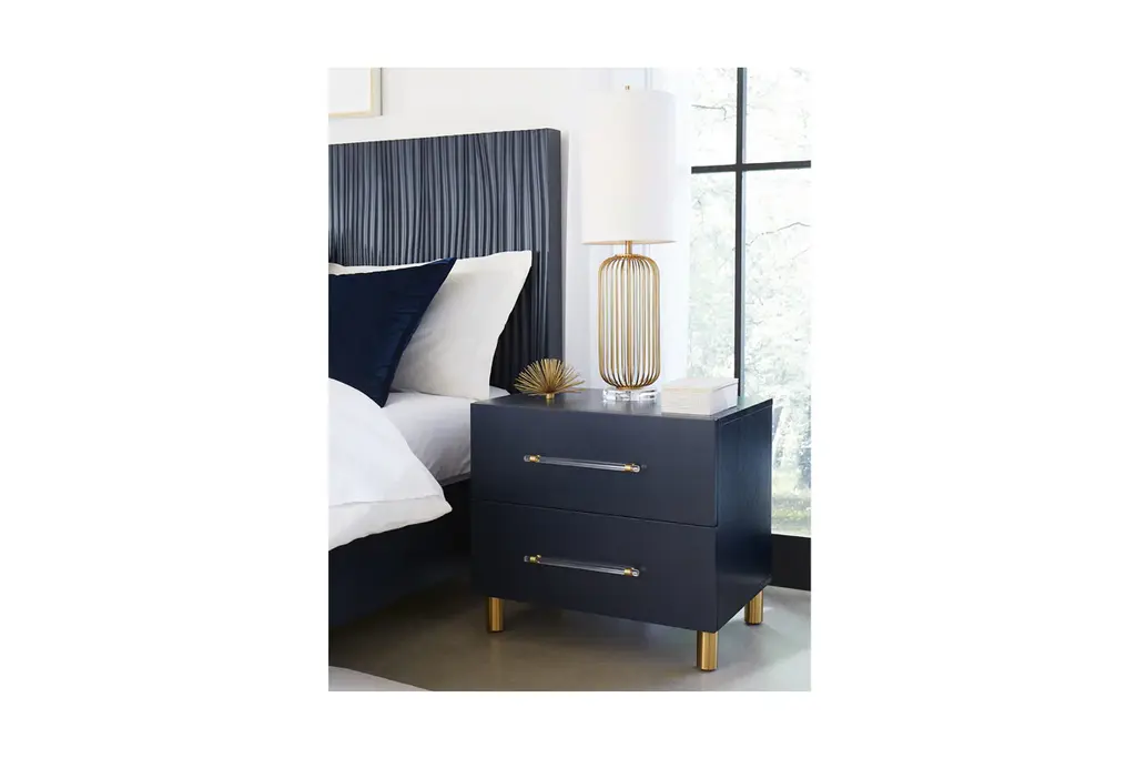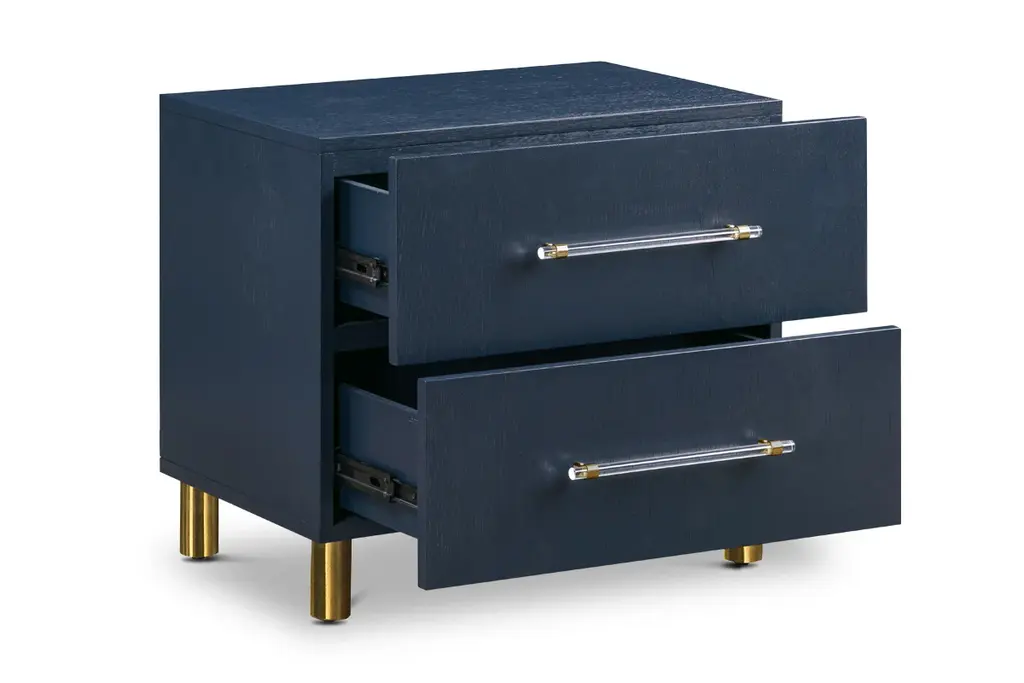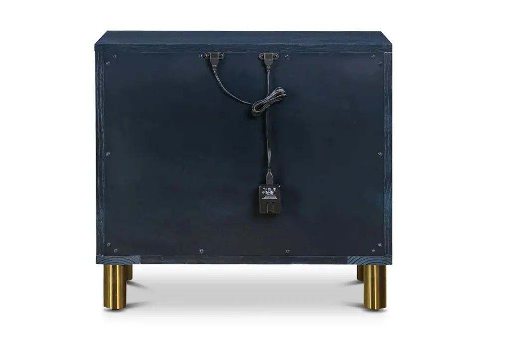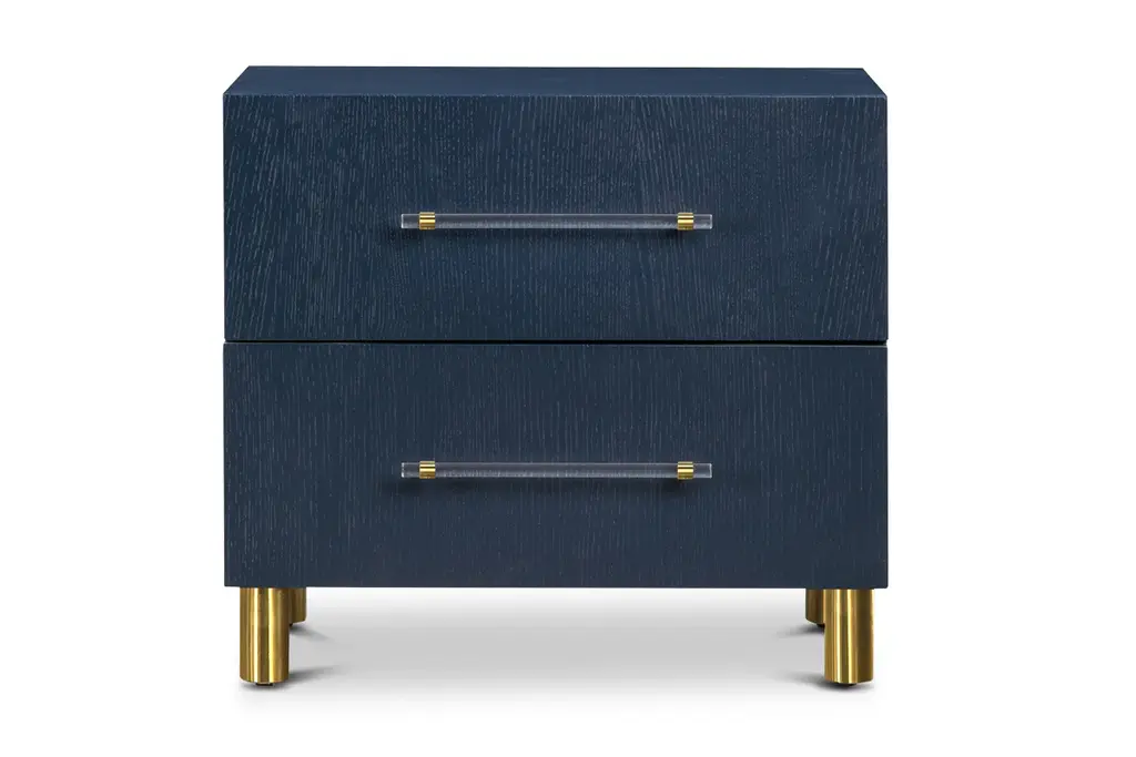 The Roxbury Nightstand adds a refreshing pop of color to your space with rich navy blue or light grey finishes. The navy blue version features brass legs and hardware, while the light grey version features stainless steel legs and hardware. This unique piece offers two drawers constructed with English dovetail joinery and smooth ball-bearing glides for easy access. It also includes two USB-A outlets for device charging, making it a practical and stylish addition to your bedside. Finished with a natural oak texture, the nightstand pairs seamlessly with the rest of the Roxbury collection or works beautifully on its own.