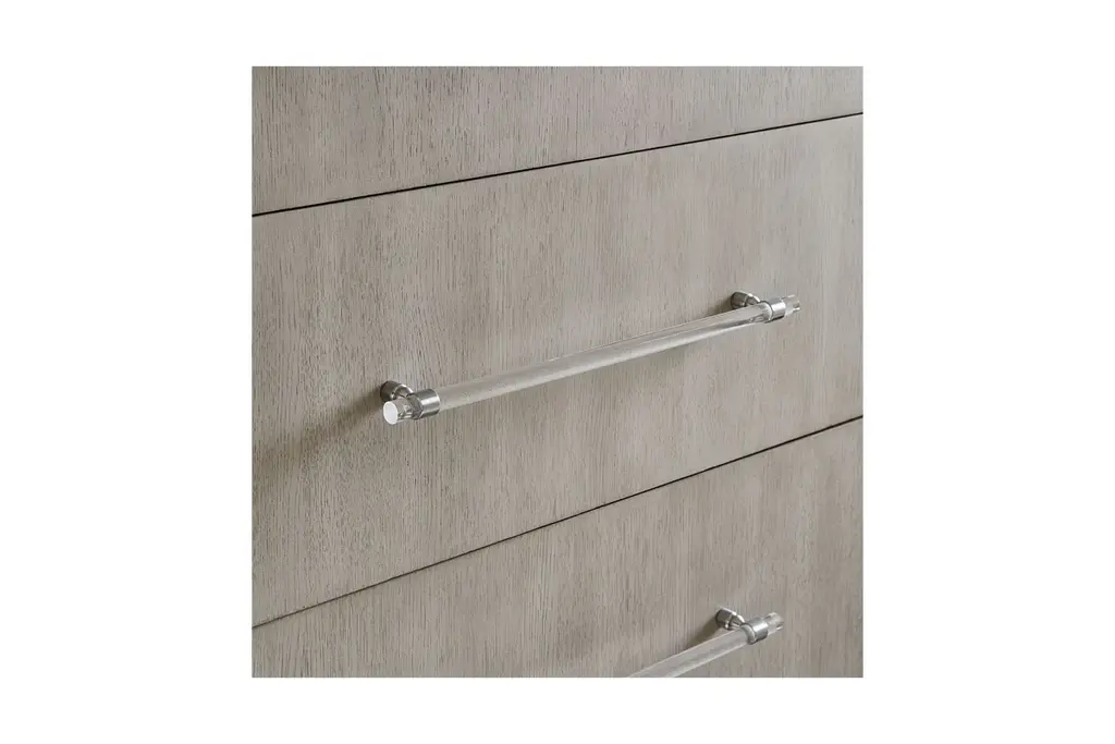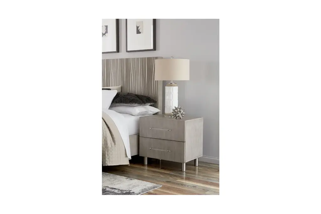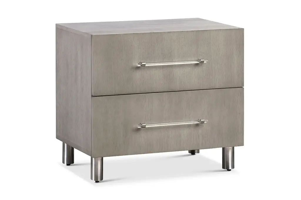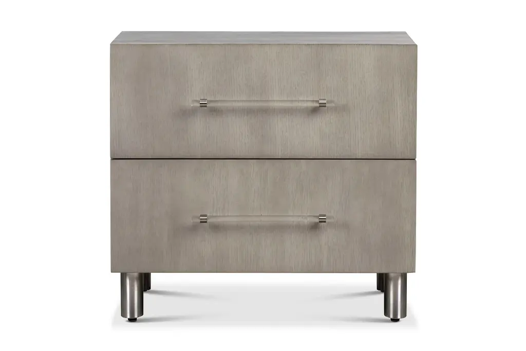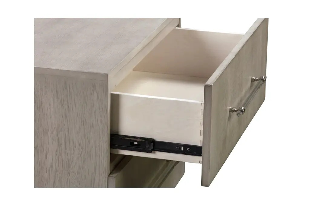 The Roxbury Nightstand adds a refreshing pop of color to your space with rich navy blue or light grey finishes. The navy blue version features brass legs and hardware, while the light grey version features stainless steel legs and hardware. This unique piece offers two drawers constructed with English dovetail joinery and smooth ball-bearing glides for easy access. It also includes two USB-A outlets for device charging, making it a practical and stylish addition to your bedside. Finished with a natural oak texture, the nightstand pairs seamlessly with the rest of the Roxbury collection or works beautifully on its own.