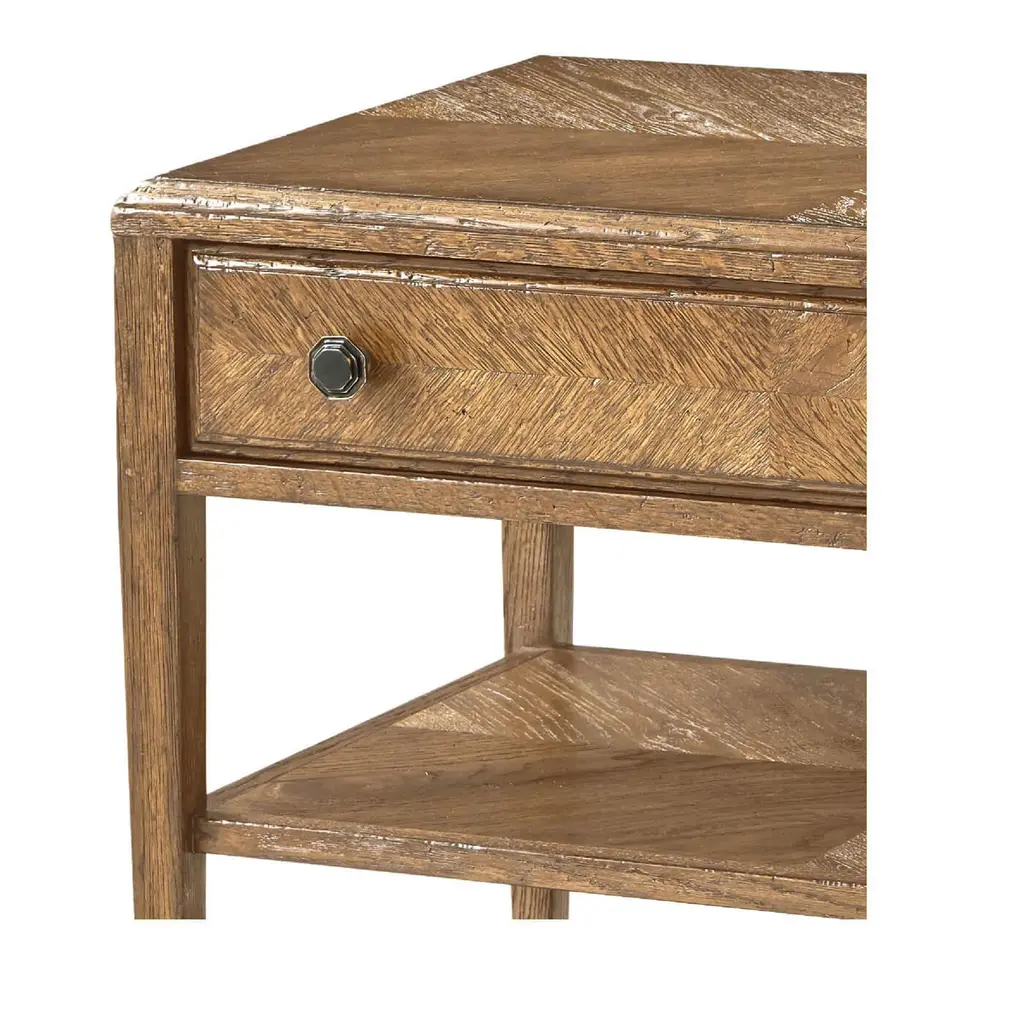 A Rustic oak two-tier nightstand with a light oak parquetry top that is mirrored on the two shelves below. It has one frieze drawer with a mirrored herringbone pattern and fine Verde Bronze handles. Dimensions: 29" W x 19.5" D x 28" H