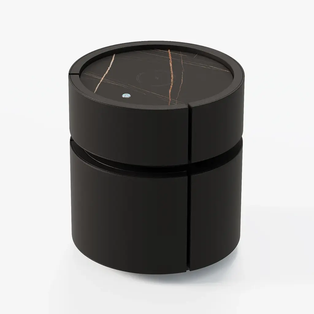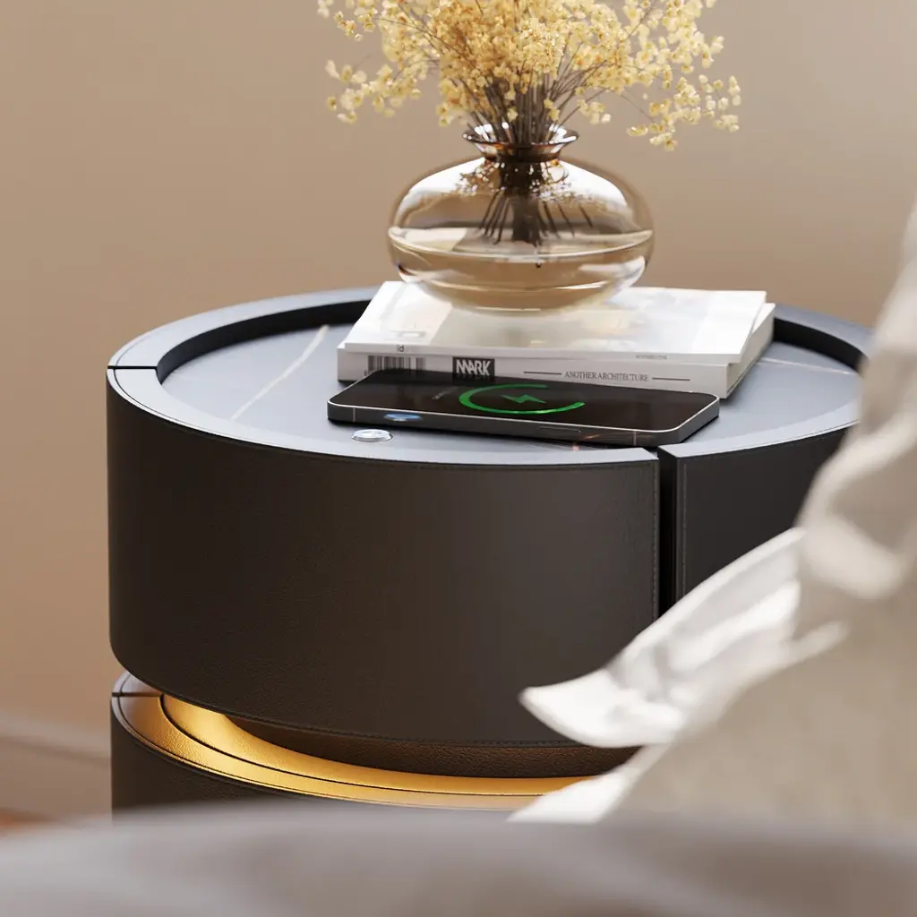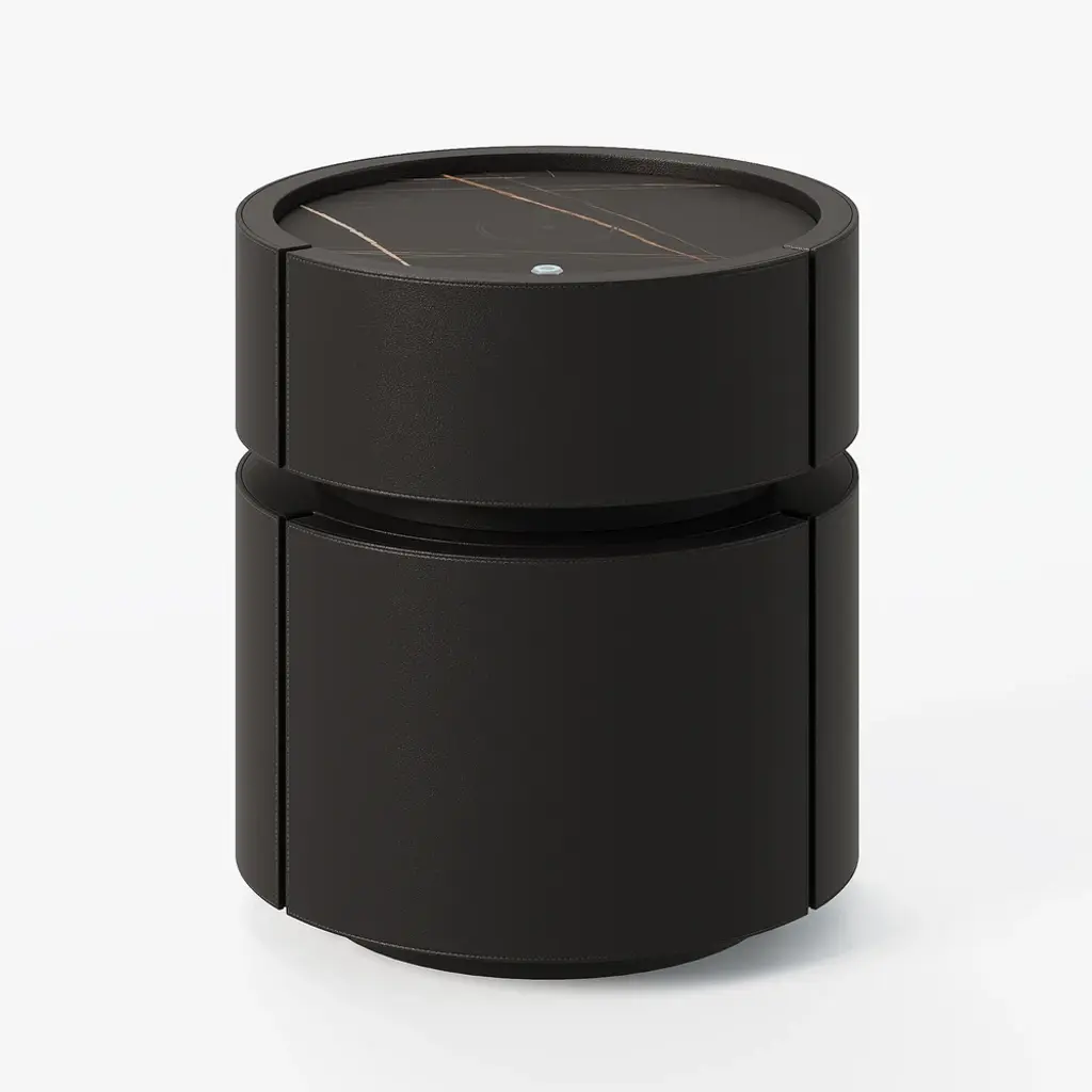 Elevate your bedroom with this sophisticated 2-drawer nightstand, crafted from premium saddle leather and topped with durable sintered stone. This smart furniture piece includes LED lighting for subtle ambiance and features wireless charging capabilities, seamlessly blending luxury with modern convenience. Ideal for keeping your devices charged and your essentials organized, this nightstand is a perfect blend of form and