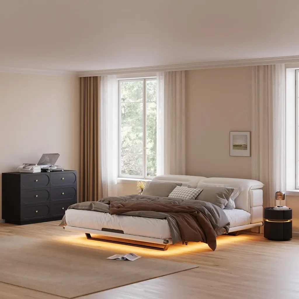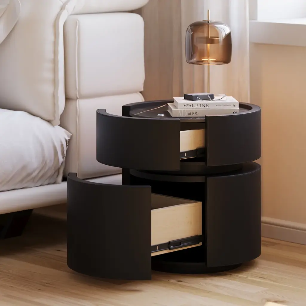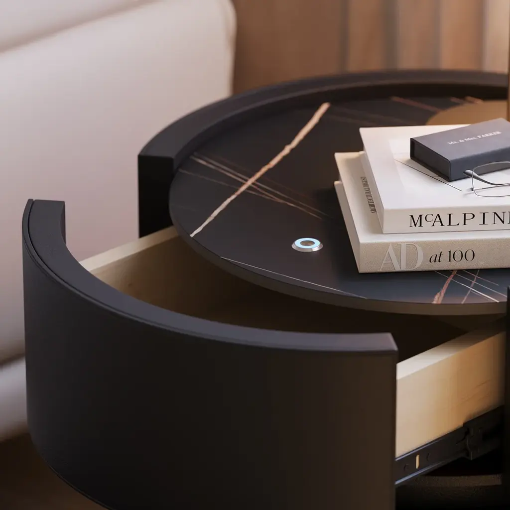 Elevate your bedroom with this sophisticated 2-drawer nightstand, crafted from premium saddle leather and topped with durable sintered stone. This smart furniture piece includes LED lighting for subtle ambiance and features wireless charging capabilities, seamlessly blending luxury with modern convenience. Ideal for keeping your devices charged and your essentials organized, this nightstand is a perfect blend of form and