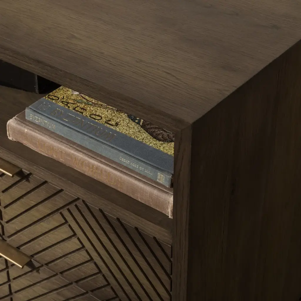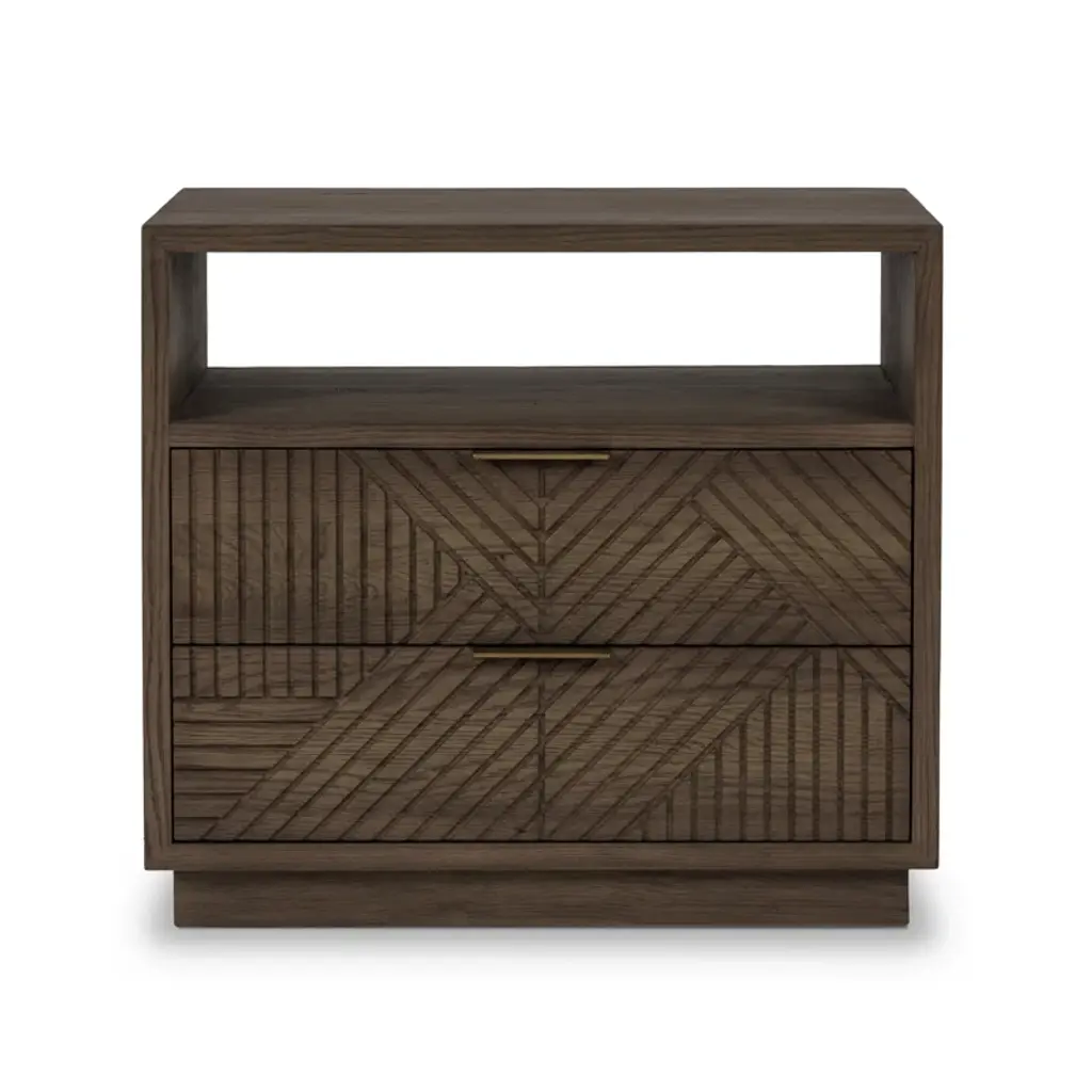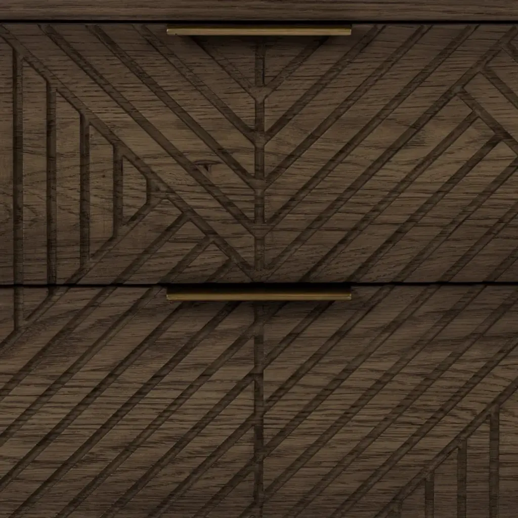 Designed with style and built for function, this nightstand brings a sharp, sophisticated design into any space and offers two spacious drawers of storage. Modern geometric carvings, vintage brass pulls, and the classic look of oak dress up a minimalist silhouette, creating a bold look that suits any decor.