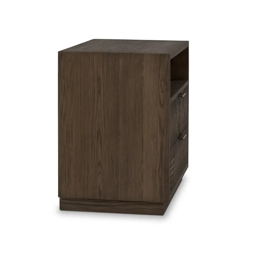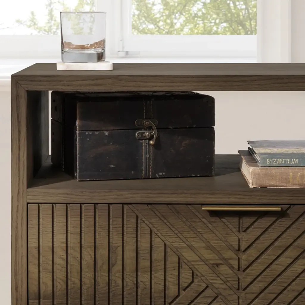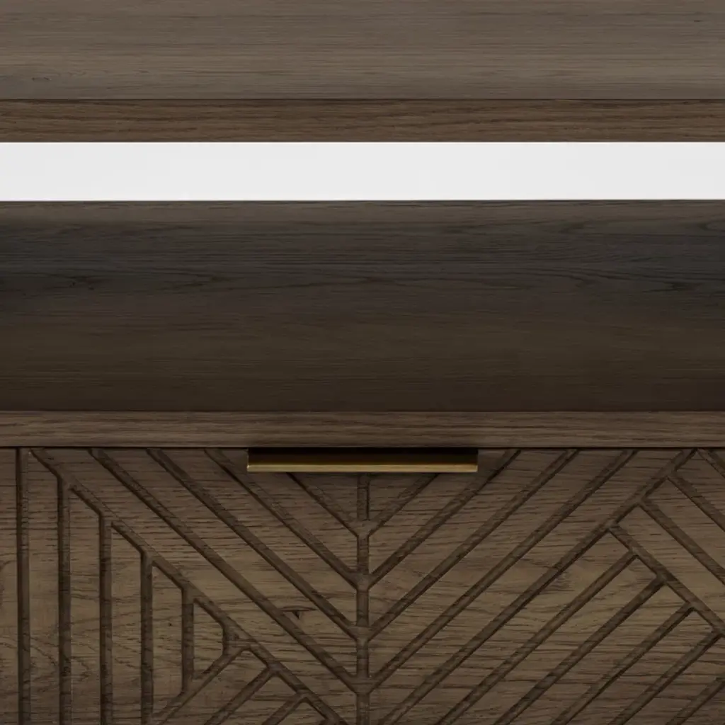Designed with style and built for function, this nightstand brings a sharp, sophisticated design into any space and offers two spacious drawers of storage. Modern geometric carvings, vintage brass pulls, and the classic look of oak dress up a minimalist silhouette, creating a bold look that suits any decor.