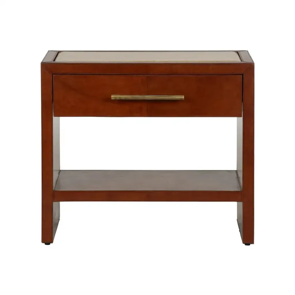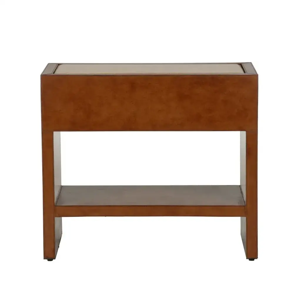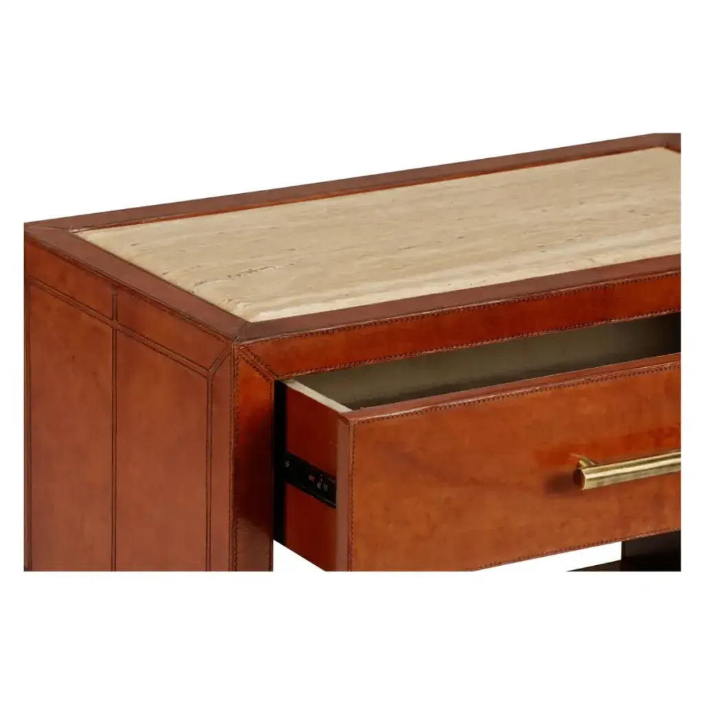 The Santino Nightstand featuring a rich leather-covered exterior that exudes timeless style. The smooth leather finish adds a touch of warmth and texture, while the sturdy natural travertine top provides a striking contrast with its natural stone beauty. The single drawer and shelf space is designed for ample storage, making this nightstand as functional as it is stylish. The combination of fine materials and expert craftsmanship makes this piece a standout addition to any room, offering both practicality and refined elegance to your home décor.