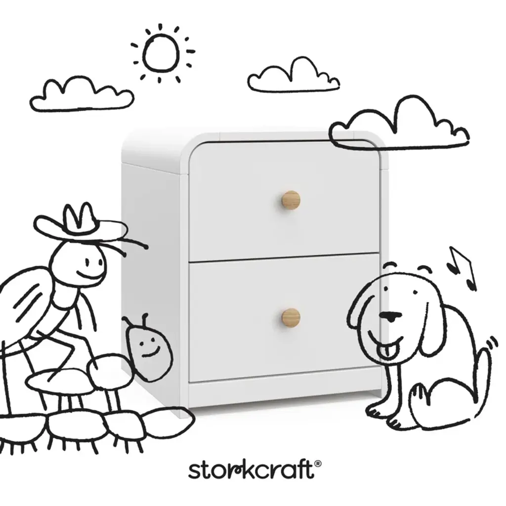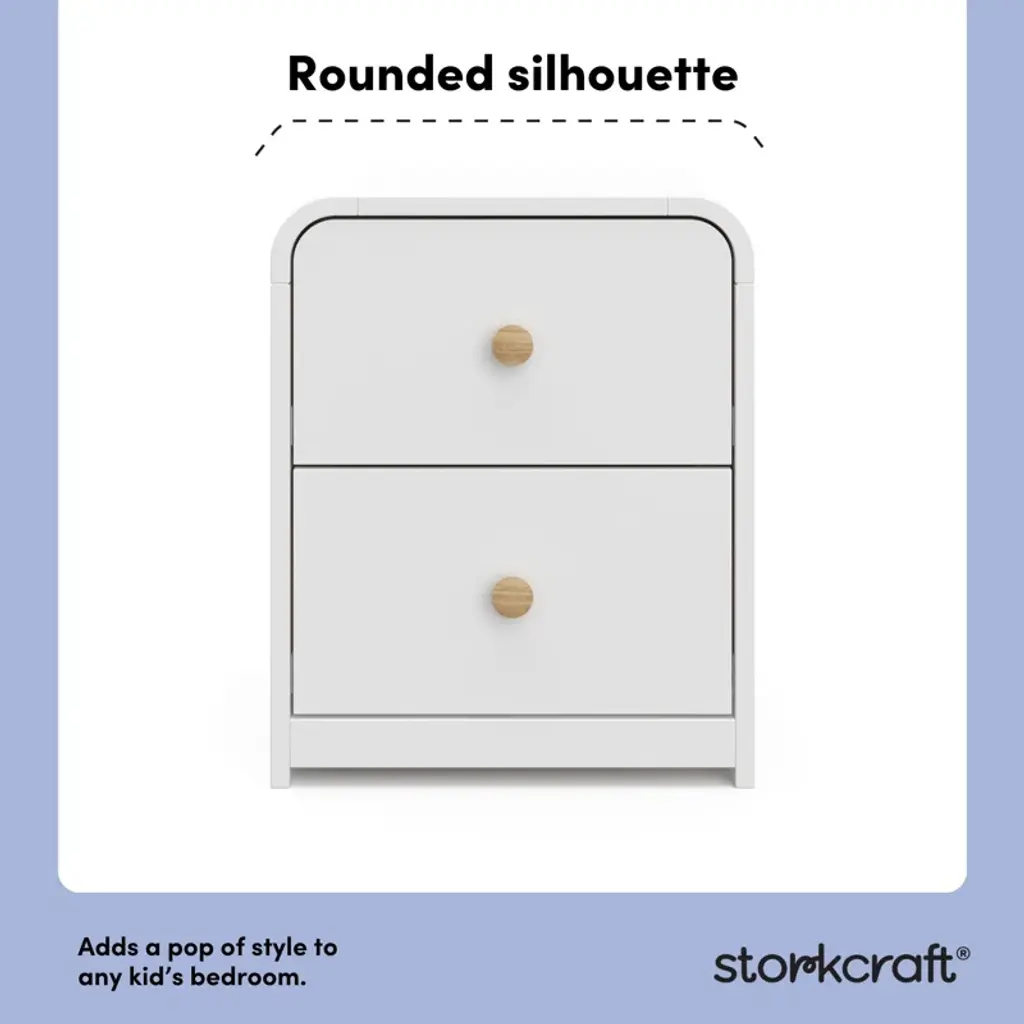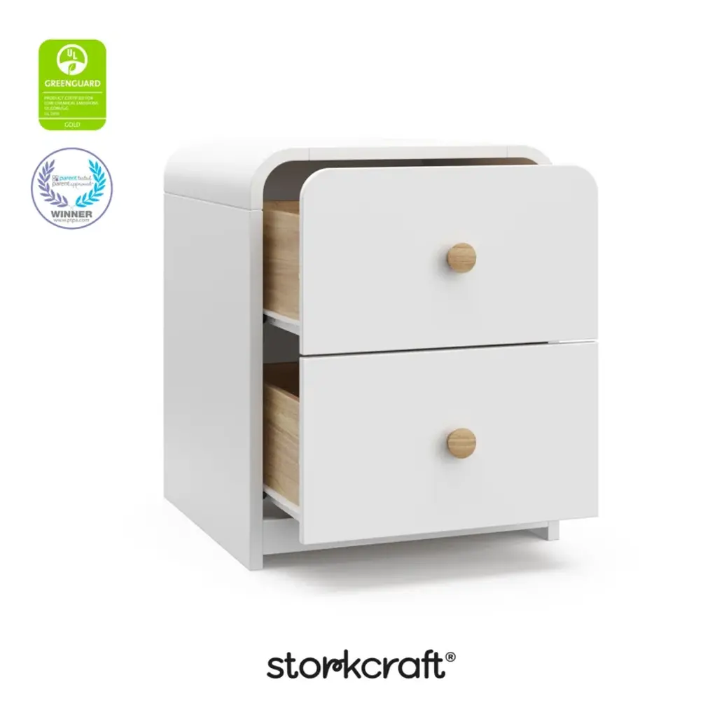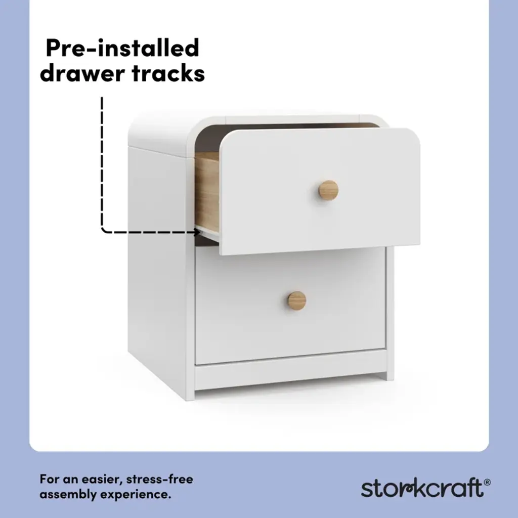 Introducing the Storkcraft Next Santos 2-drawer nightstand, by Storkcraft. Organize your kids' bedroom in style with the Santos nightstand. With its clean lines, rounded silhouette, and two-tone aesthetic, the Santos is sure to add a pop of style and storage convenience to any kid's bedroom. For even more bedroom storage, double up on your Santos nightstand with one for each side of the bed! Designed to match perfectly with the rest of the Storkcraft Next Santos collection, or with any kid's bedroom furniture of your choice.