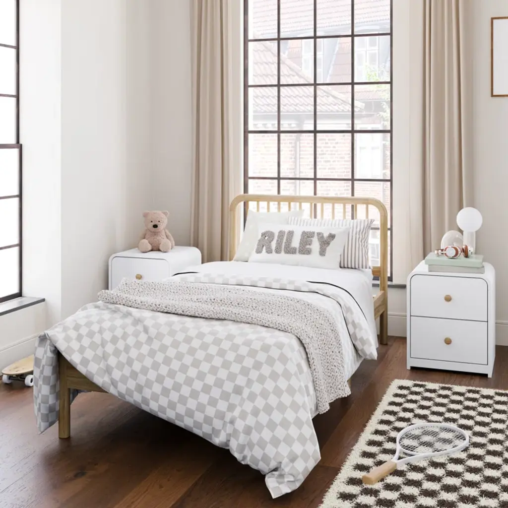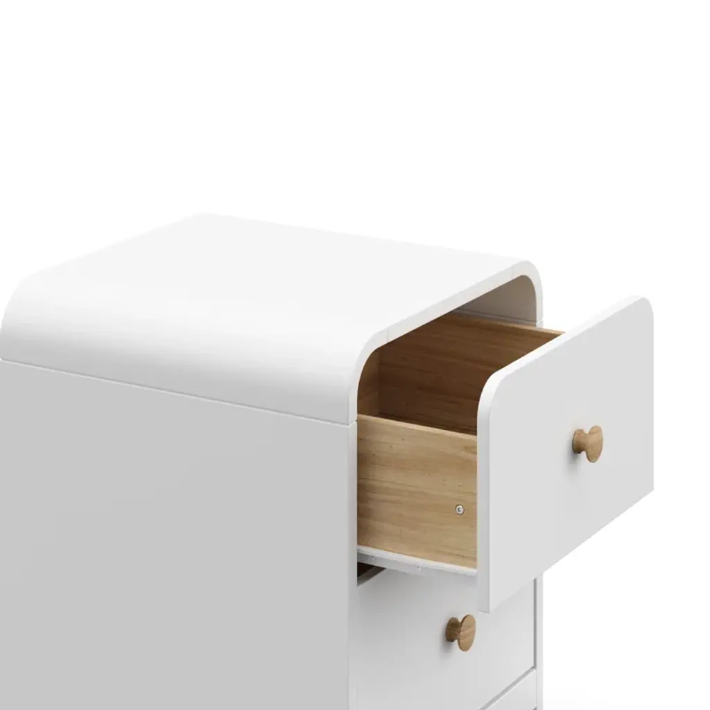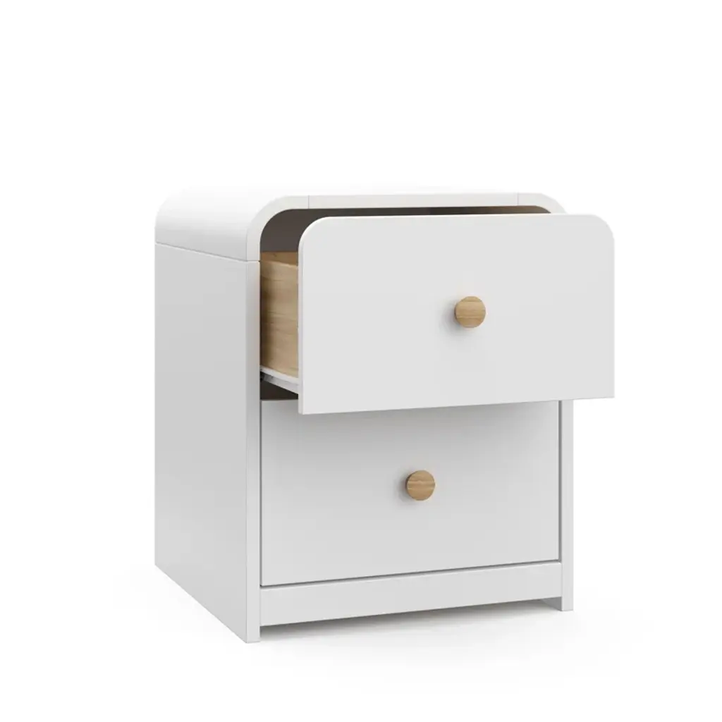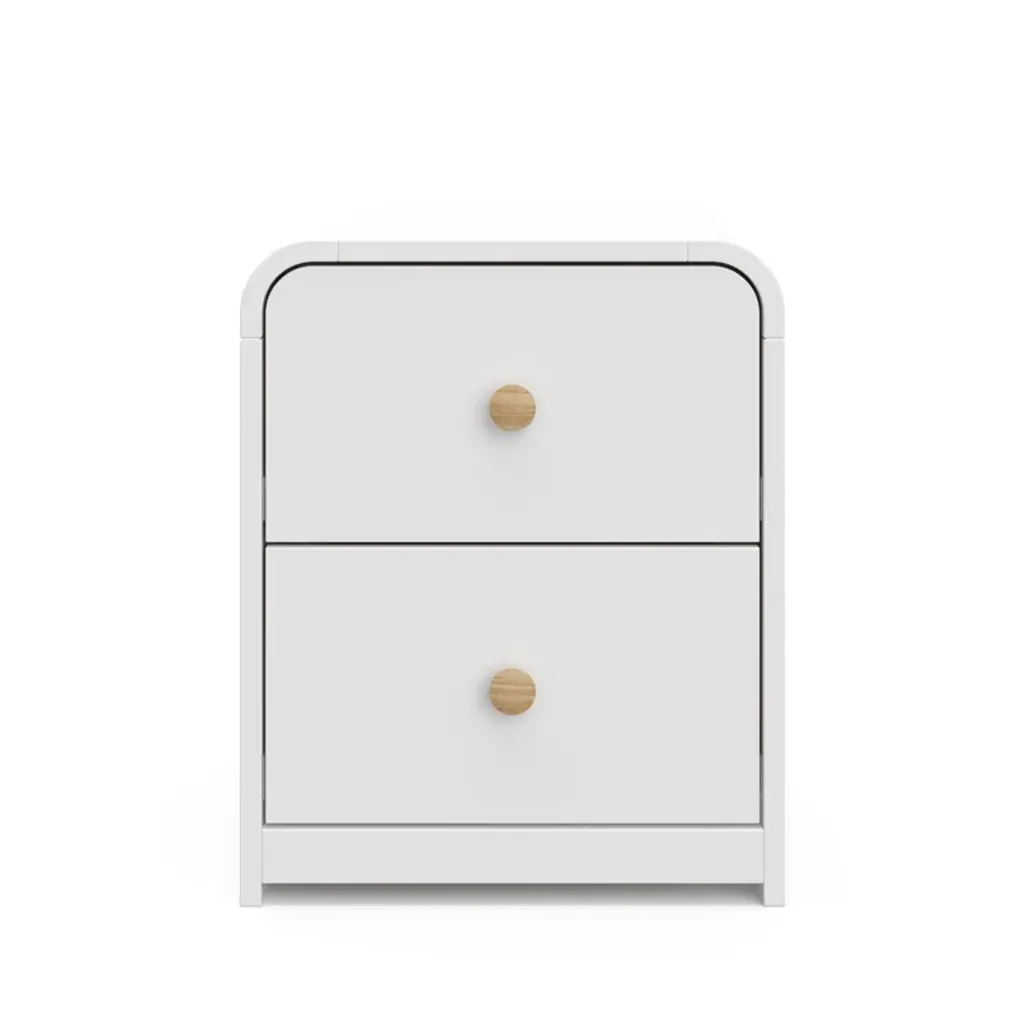 Introducing the Storkcraft Next Santos 2-drawer nightstand, by Storkcraft. Organize your kids' bedroom in style with the Santos nightstand. With its clean lines, rounded silhouette, and two-tone aesthetic, the Santos is sure to add a pop of style and storage convenience to any kid's bedroom. For even more bedroom storage, double up on your Santos nightstand with one for each side of the bed! Designed to match perfectly with the rest of the Storkcraft Next Santos collection, or with any kid's bedroom furniture of your choice.